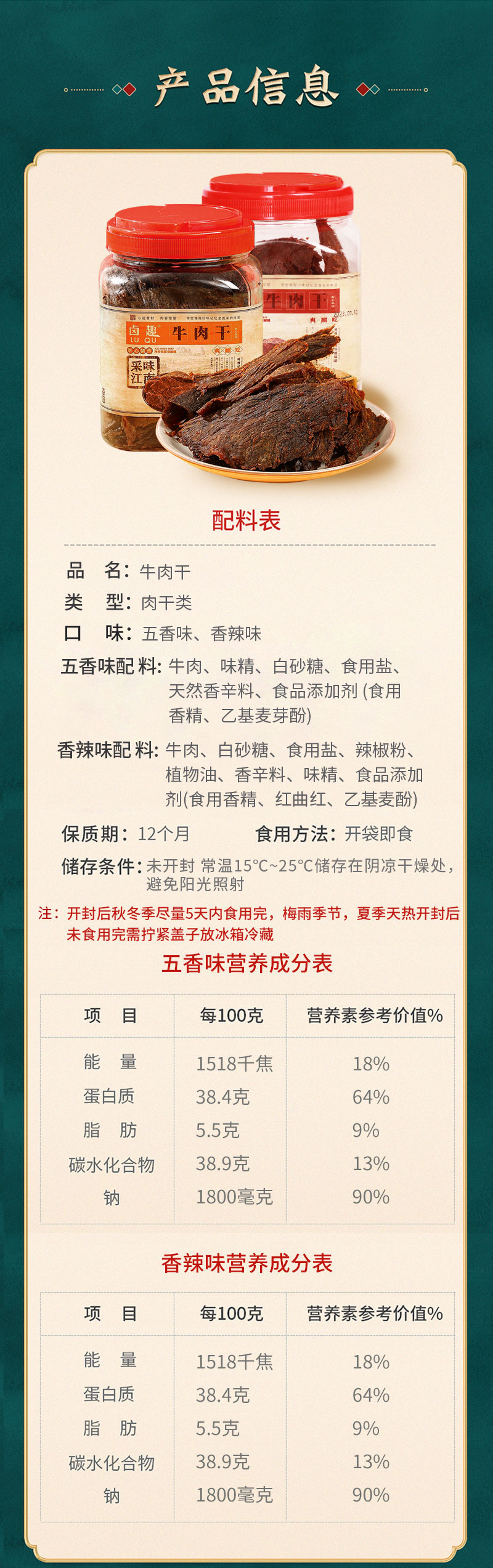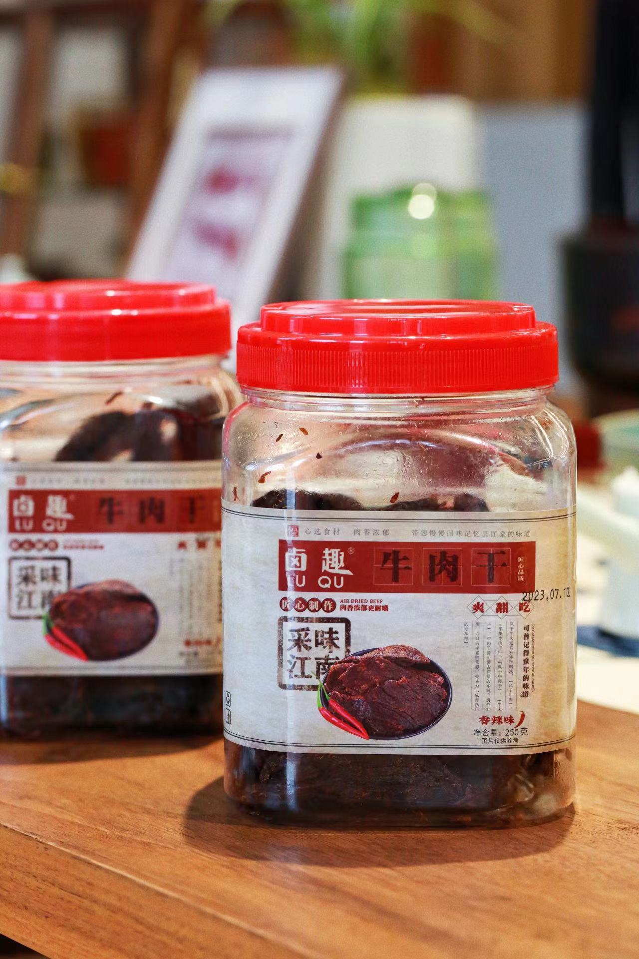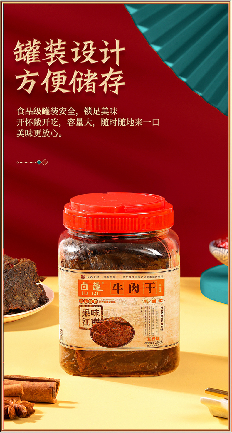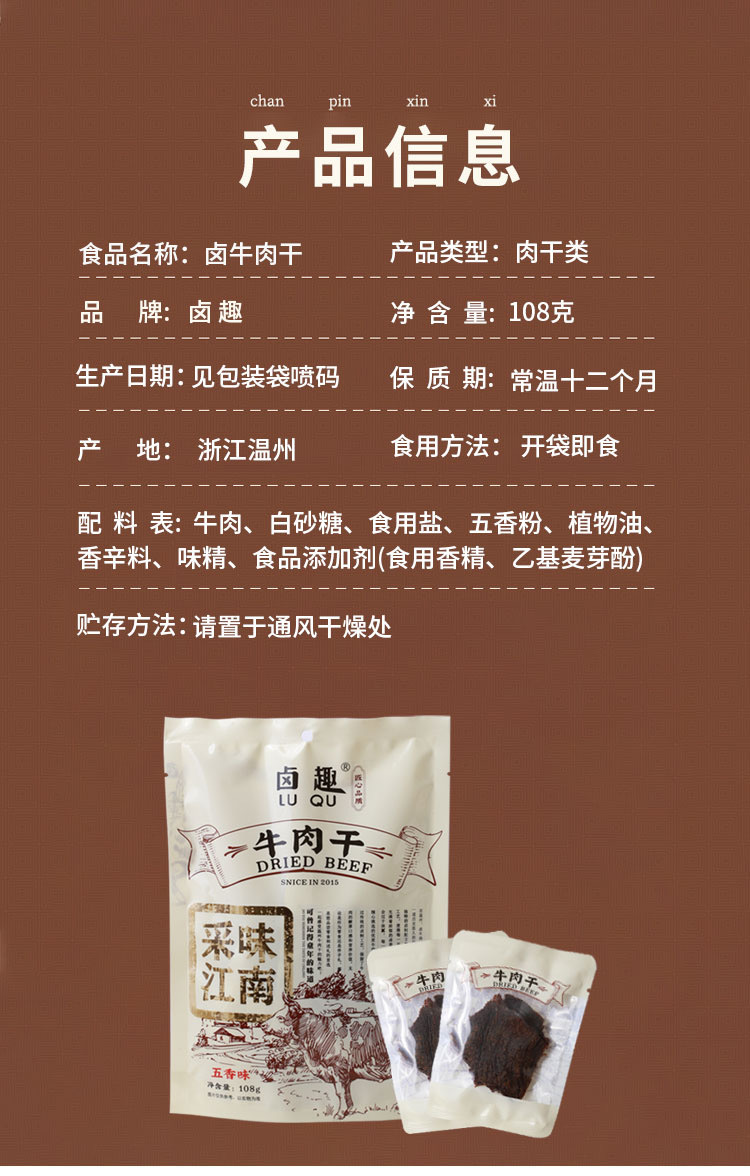 【品牌名】卤趣牛肉干 【产品名称】卤趣牛肉干 250g罐装(五香味/香辣味)/卤趣袋装牛肉干108g(五香味) 【生产日期】2023.10-12 【保质期】12个月 【口味】五香味、香辣味 【储存方式】存放于阴凉干燥处,避免阳光直射 【食用方式】开罐即食 【产地】浙江温州 【发货地】浙江温州 【发货时间】下单后72小时内 【发货快递】申通快递/极兔快递 【不发货地区】疫情地区具体打单为准 如拍下订单无法正常付款,请尝试更换收货地址 【加运费地区】新疆西藏+15元/组 【售后标准】无理由拒签或拦截快递需扣除相关费用【普通地区扣4元,新疆西藏扣15元】;(已产生的寄出运费不退还) 因口感不喜欢,品相不好,储存不当不售后不赔付 外箱轻微压损,不售后处理,严重破损或漏发请及时拍外箱面单图以及内件反馈至客服处,根据实际情况判定是否补偿,补发或退款。 【温馨提示】卤趣牛肉干,未开封前,常温储存在阴凉干燥处,无阳光直射处的保质期为 12 个月。商品一经开封,请放入冰箱冷藏储存,尽快食用,存放太久会影响口感,牛肉容易发干注:常温指 15C~25C 【售后说明】 1.不支持七天无理由的商品,无质量问题不售后。 2.支持七天无理由的商品,如需退货,请在签收后7天内提供退回物流单号,进入售后流程,否则将不予以受理退货! 3.商品到货请第一时间开箱检查,如有质量问题请在签收24小时内产品+快递面单合照联系客服处理(无图不售后),超过24小时不予以处理哦! 4.关于退单:货物发出后拦截会产生拦截费用,快递发出,拦截拒收所产生的费用由客户自己承担,发出后不能拦截,拒收,撤单! 5.关于赔付:因买家地址不详,有误,或者改地址的,及电话联系不上等造成的送货延迟导致物品出问题,不予以赔偿哦! 6.关于拒收:以快递慢不新鲜不想要等理由单方面拒收,卖家不承担责任,因个人原因保存不当放置时间过长不在赔付范围! ★下单即为承认以上条款,请仔细阅读谨慎下单,感谢