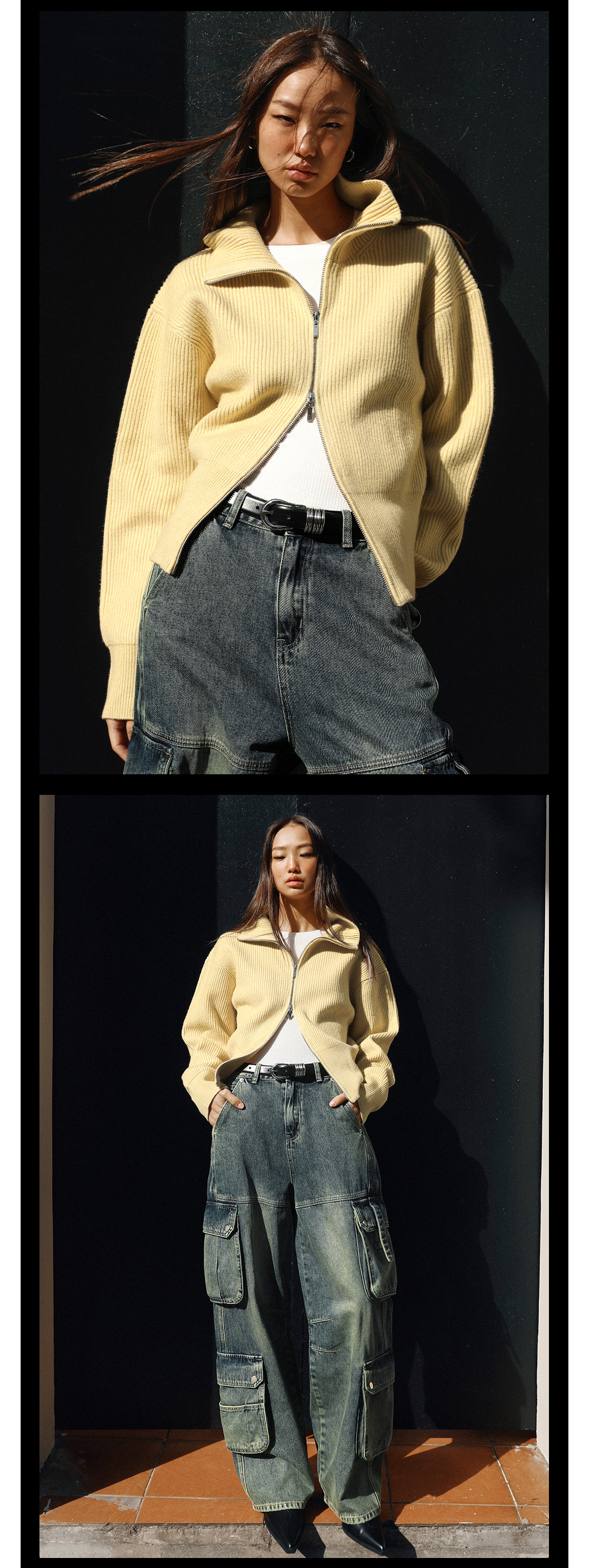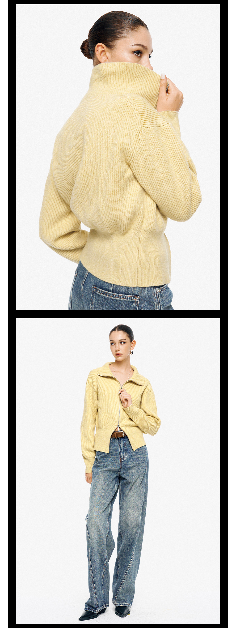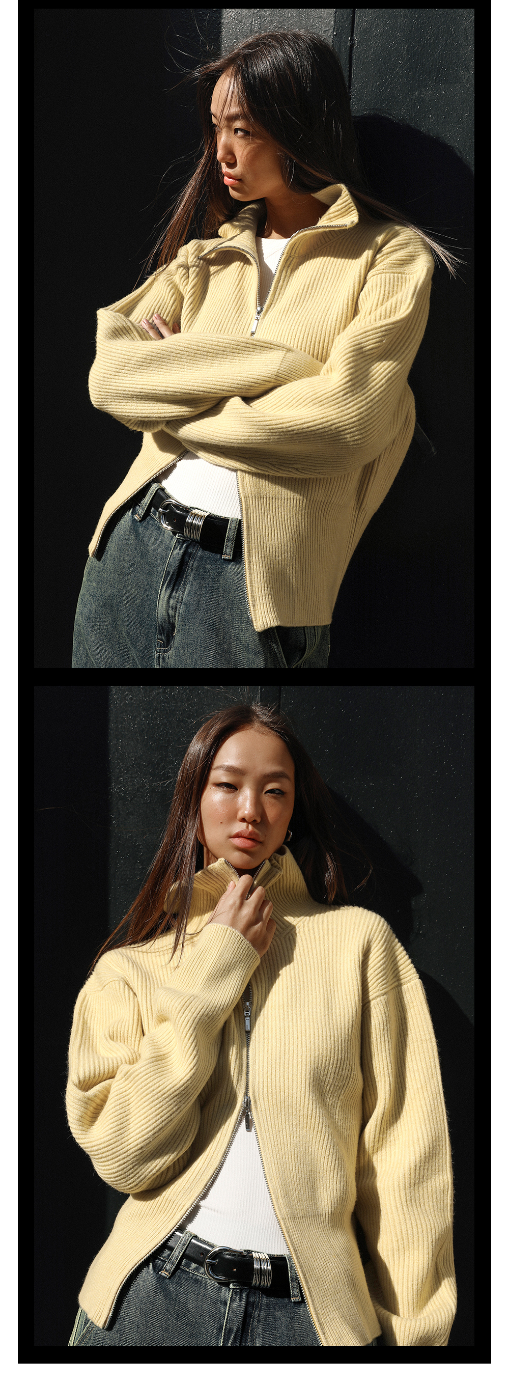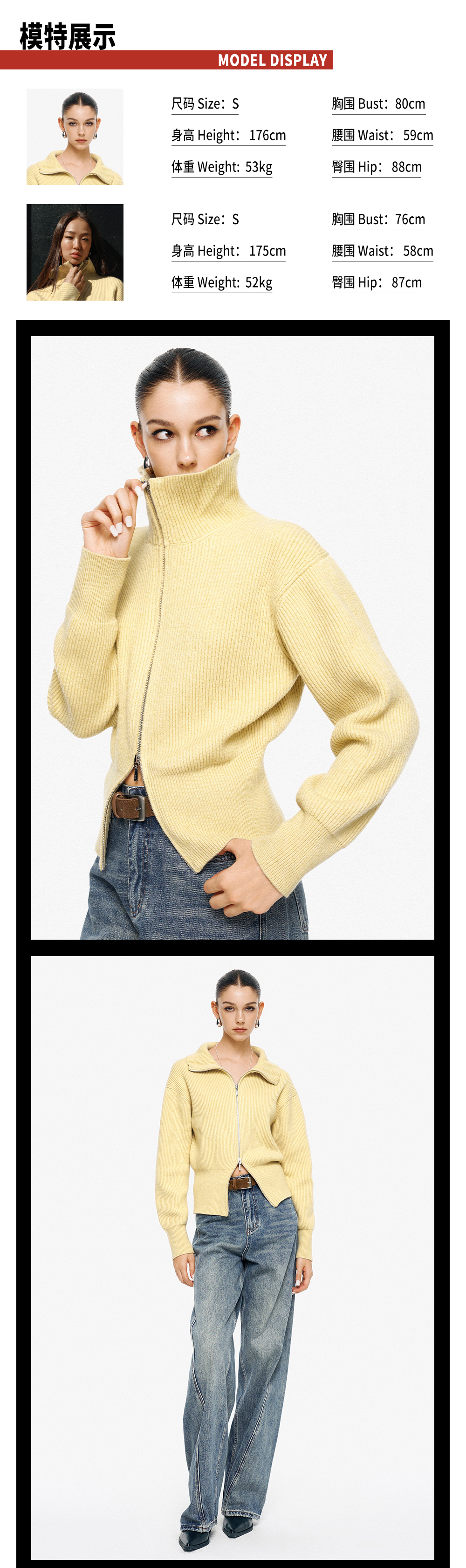 TR她热 溏心主义 鹅黄色针织罗纹双拉链宽松百搭立领开衫外套