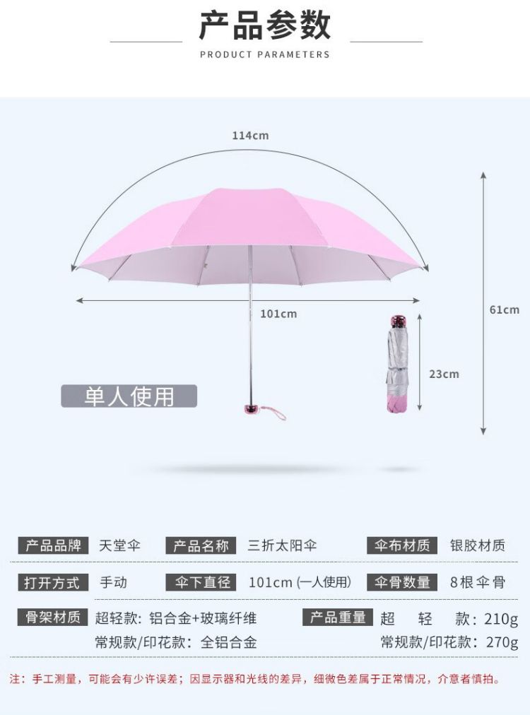 天堂伞 三折晴雨伞防晒伞防紫外线太阳伞遮阳伞商务伞336T藏青色