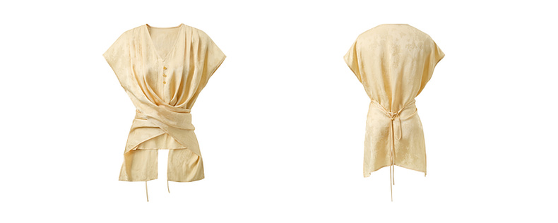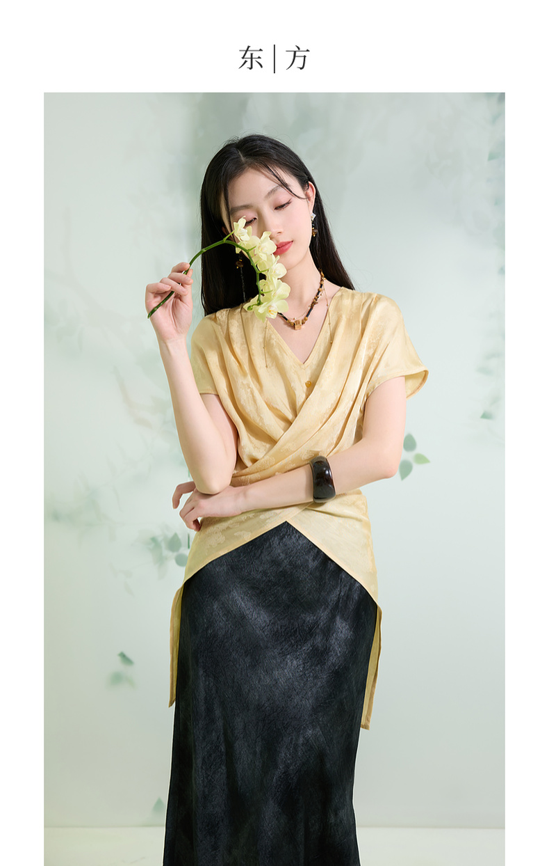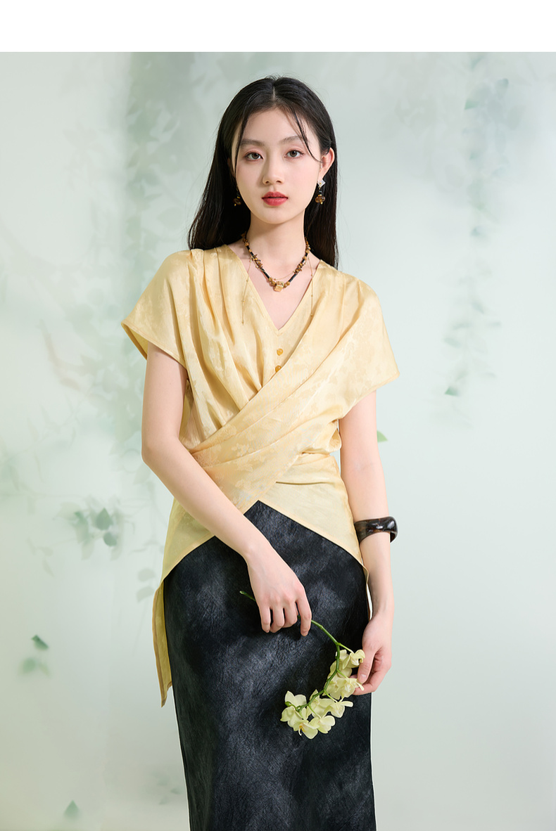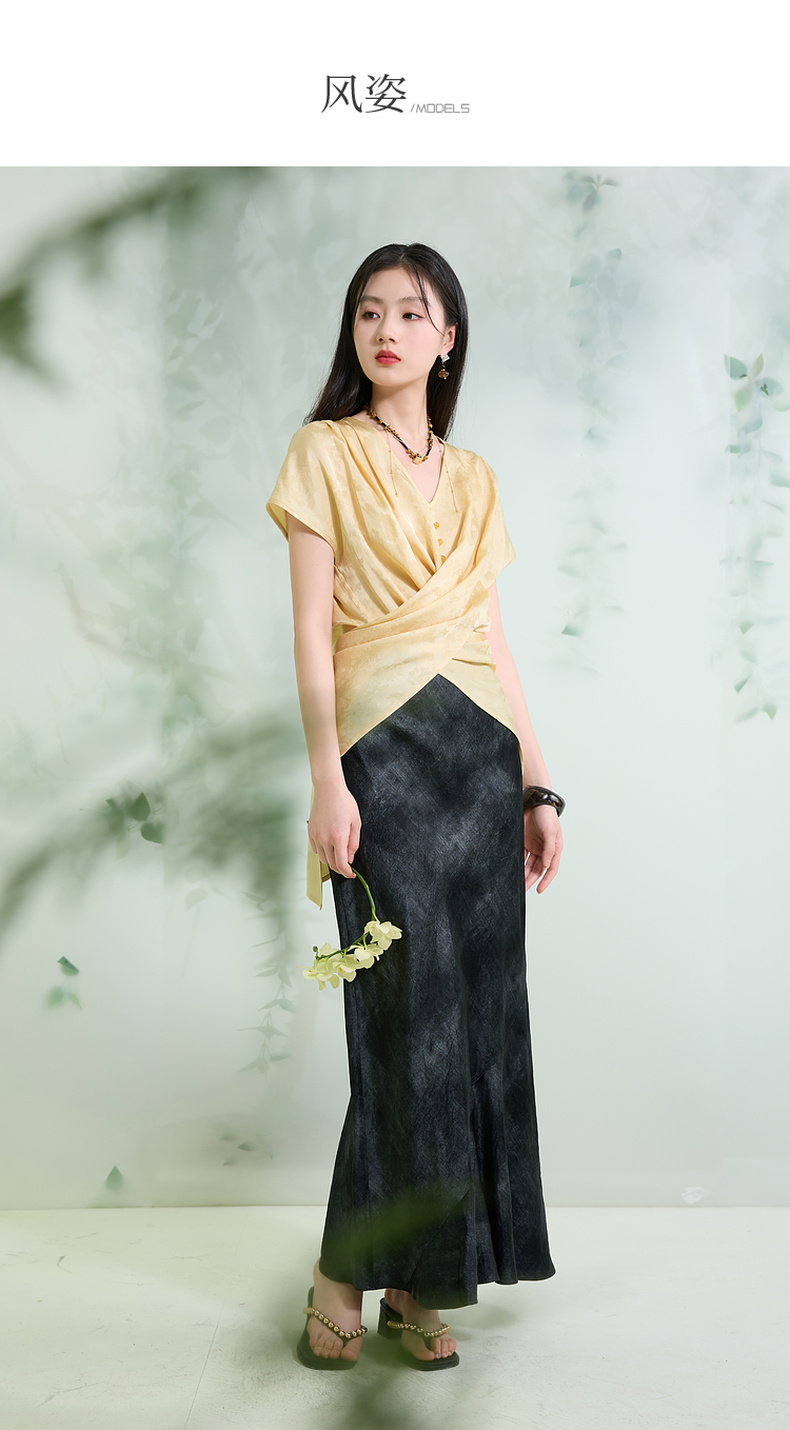 三彩【玉凝烟岚】2025夏季新款新中式莱赛尔衬衣V领绑带收腰C