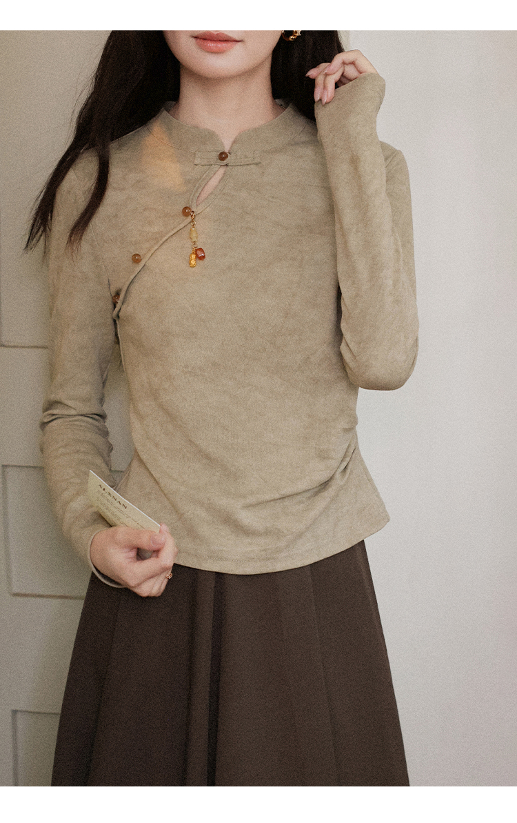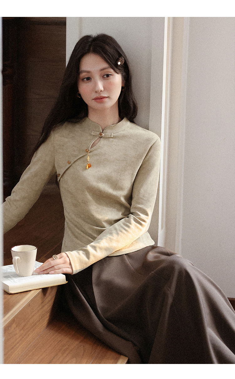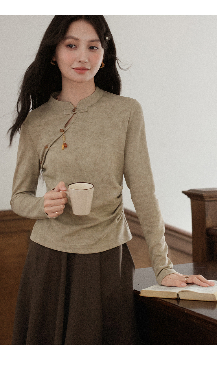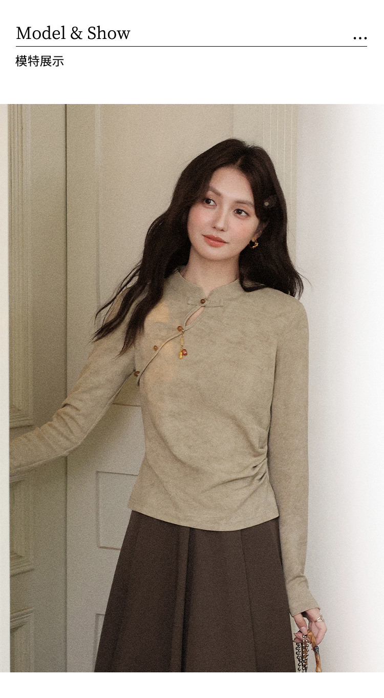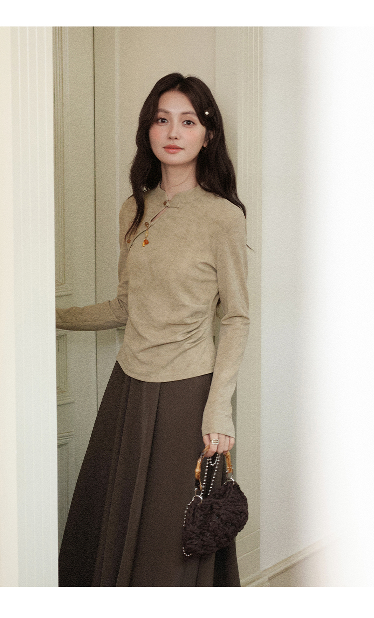 鹿向南「墨染花影」杏色设计感新中式长袖T恤秋季新款通勤上衣女