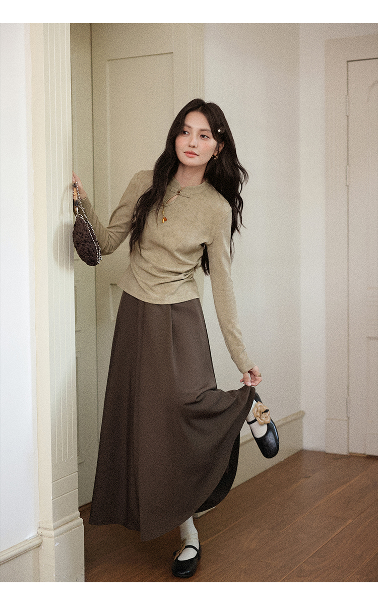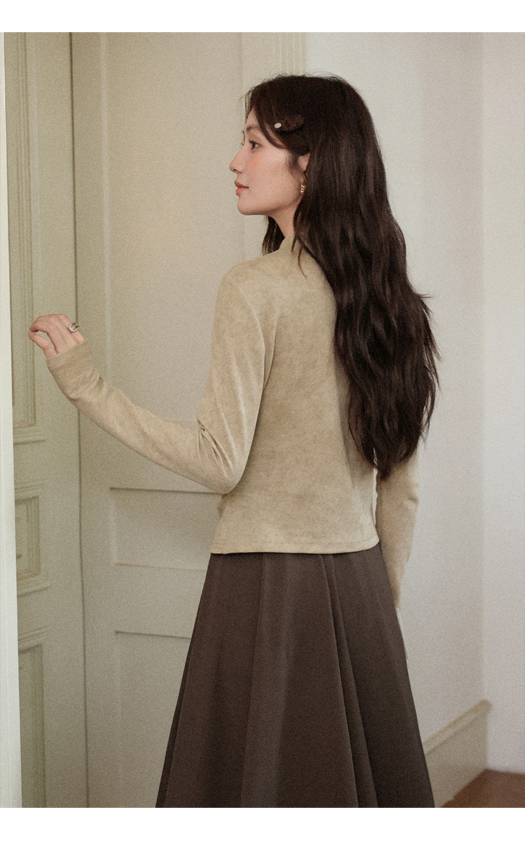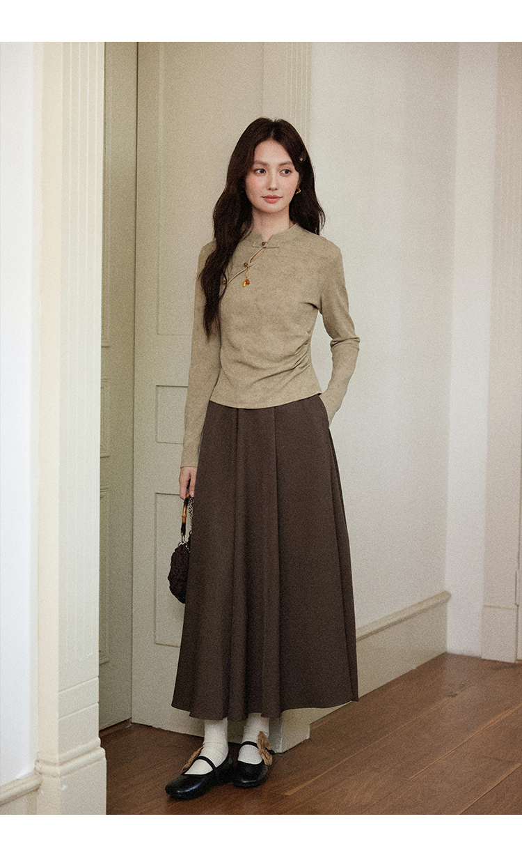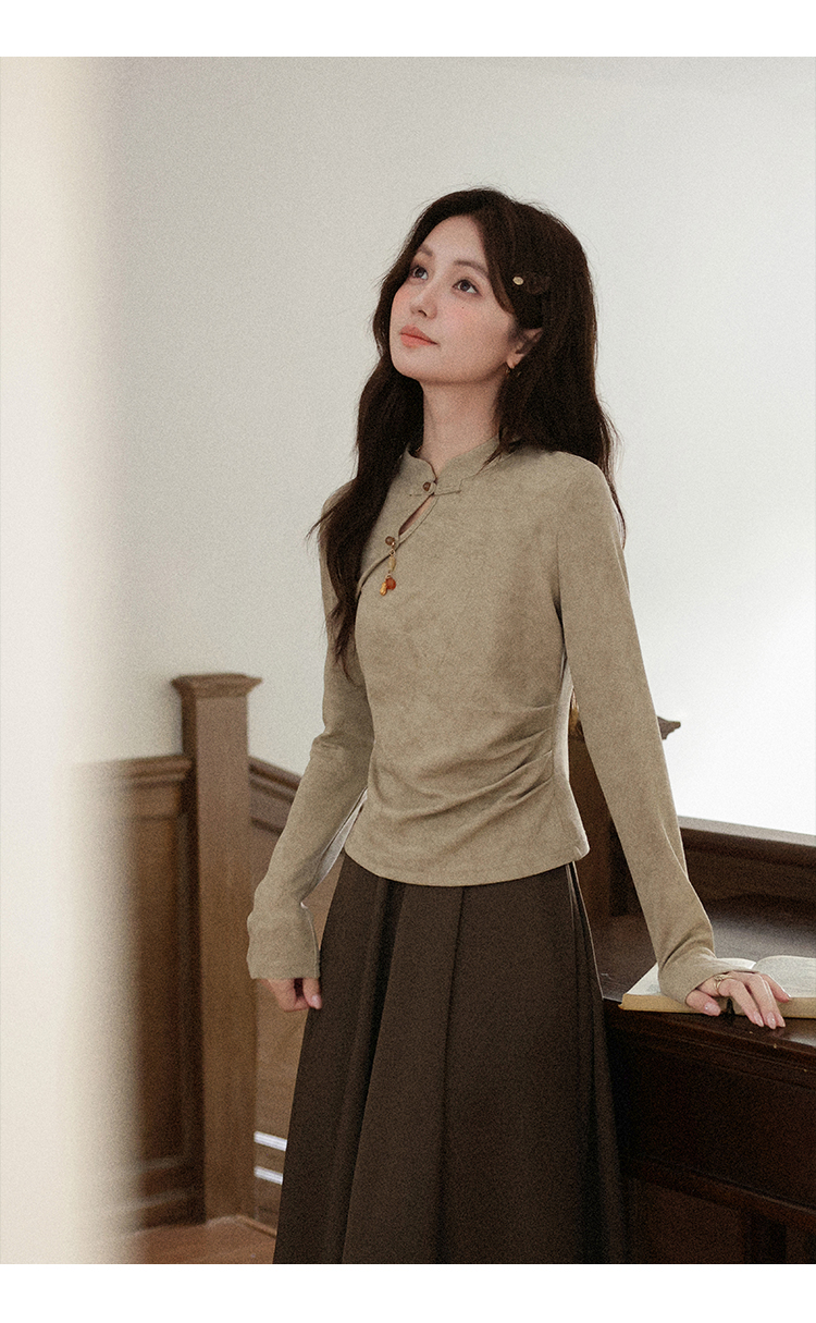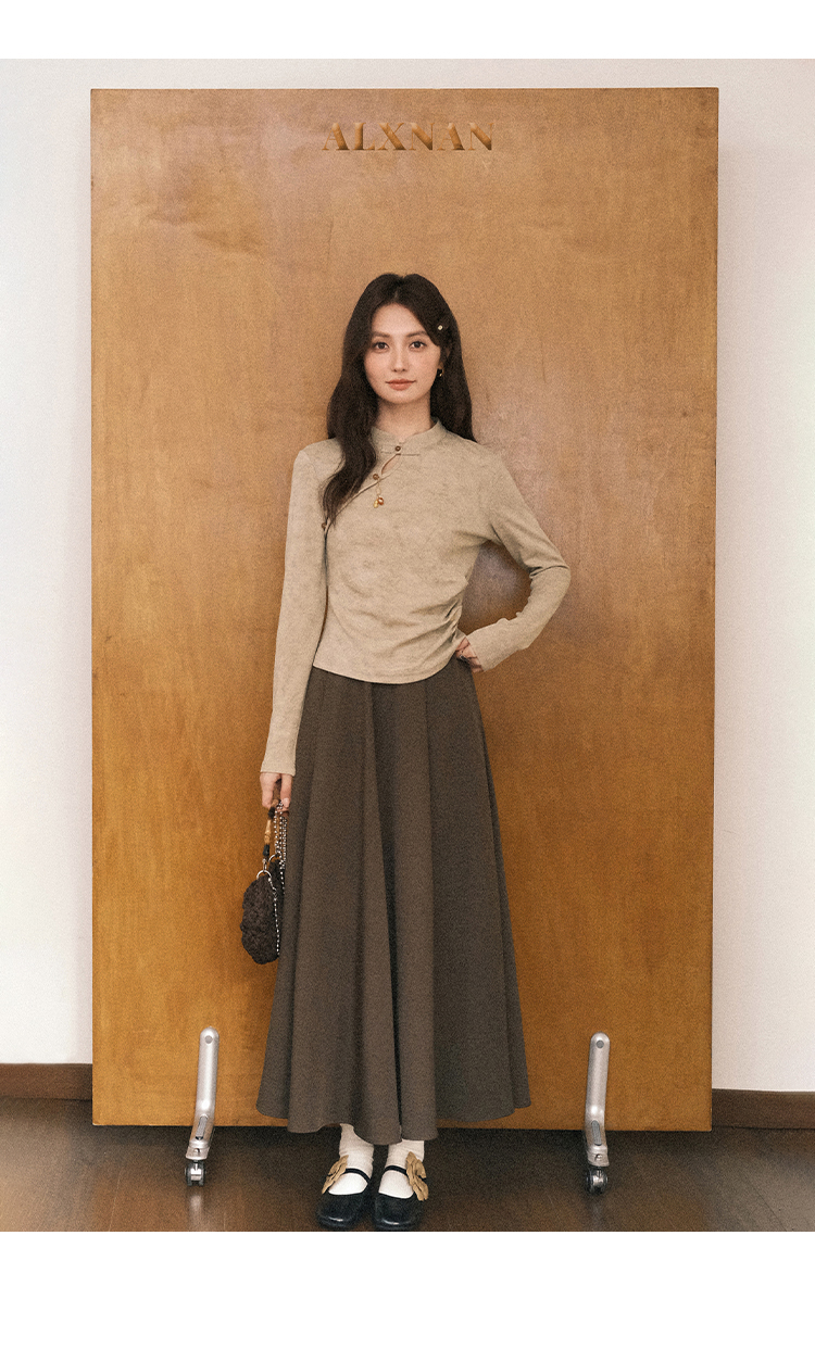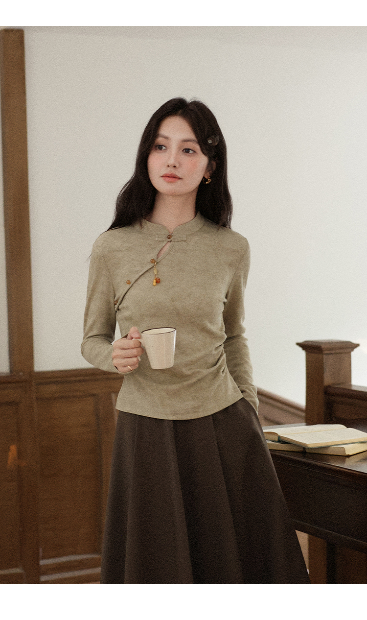 鹿向南「墨染花影」杏色设计感新中式长袖T恤秋季新款通勤上衣女