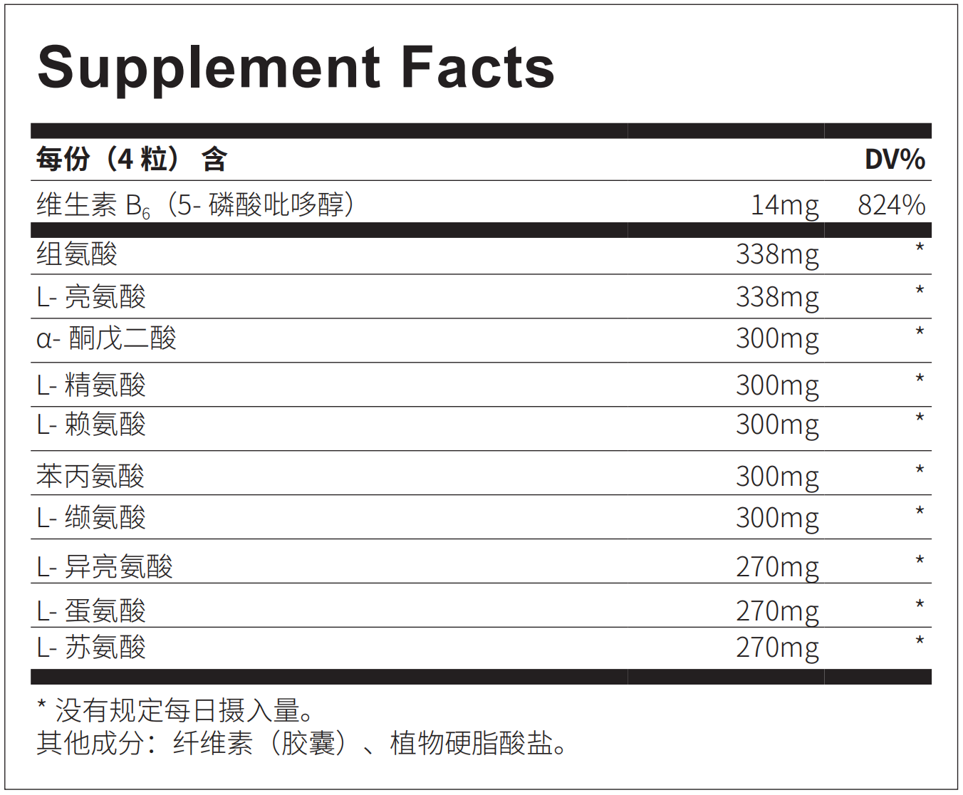 Ultra Amino Acid提供多种游离形式的必需氨基酸,以促进氨基酸的平衡和蛋白质的合成。配方中还包括 α-酮戊二酸和生物活性形式的维生素B6,帮助支持该配方中氨基酸的吸收、代谢和生物利用。配方不含色氨酸,无麸质、无乳制品和大豆成分。