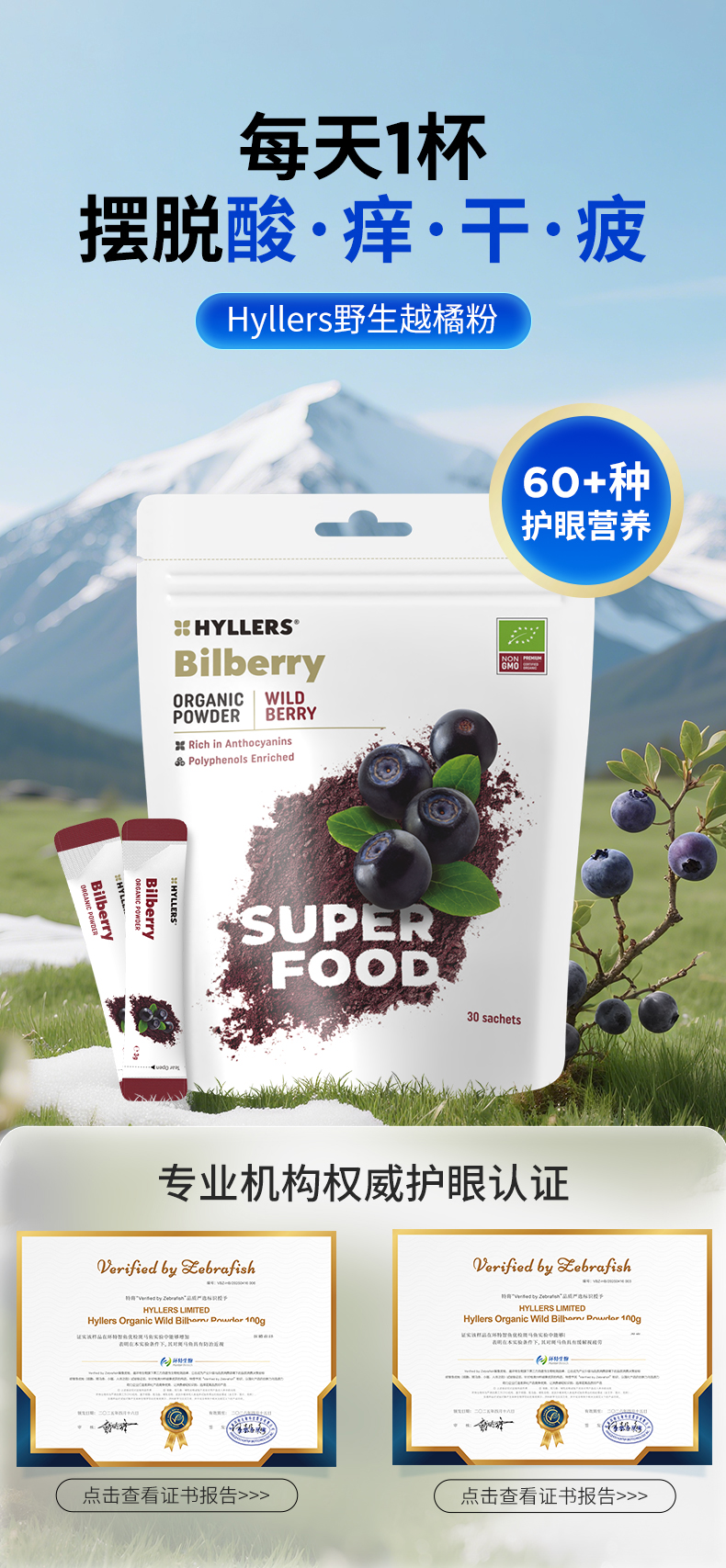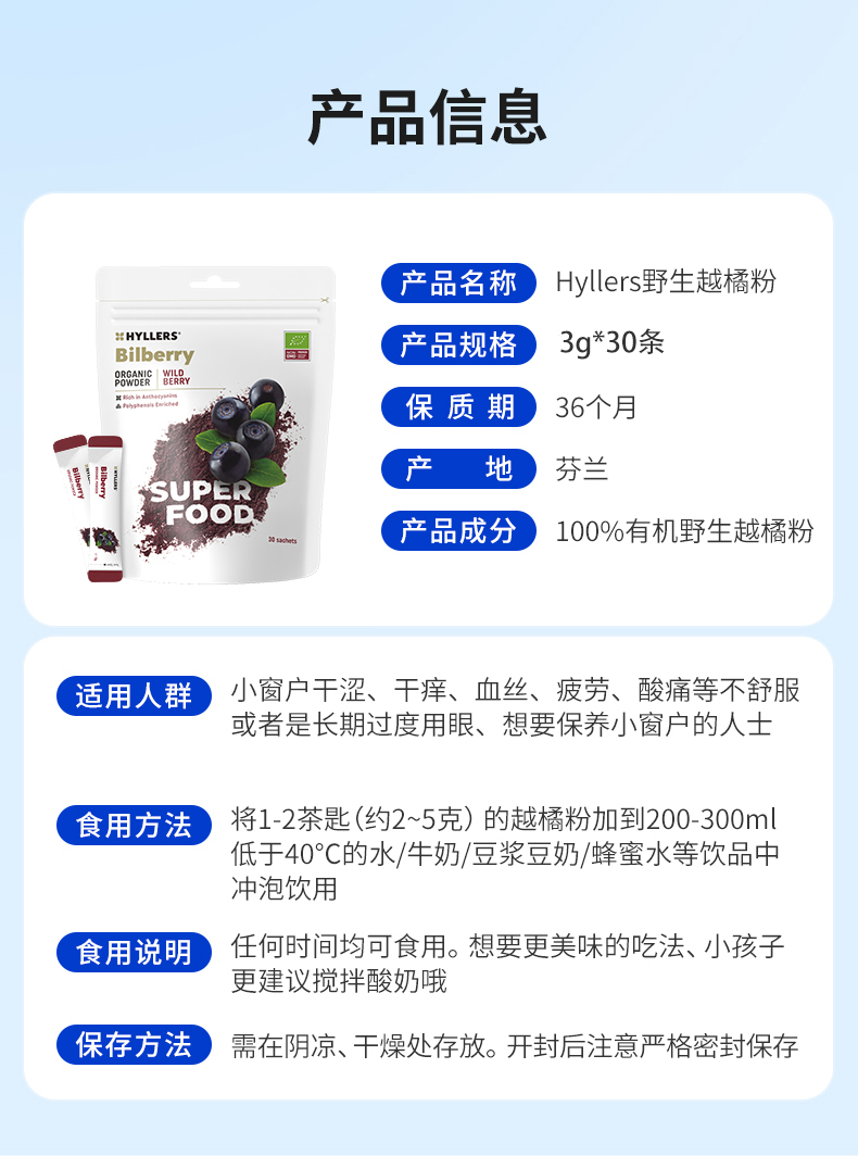 【romi专属】HYLLERS升级独立装芬兰野生有机越橘北欧蓝莓粉花青素
