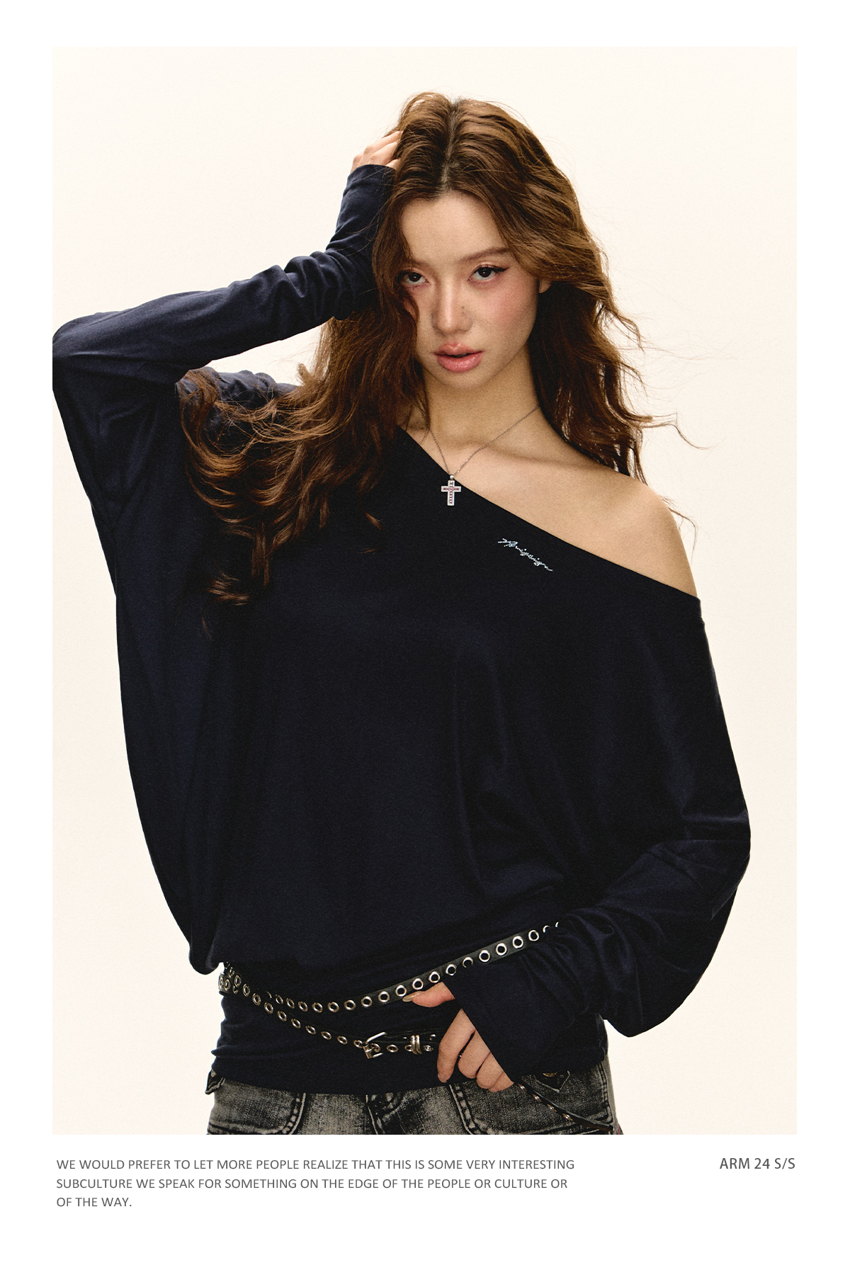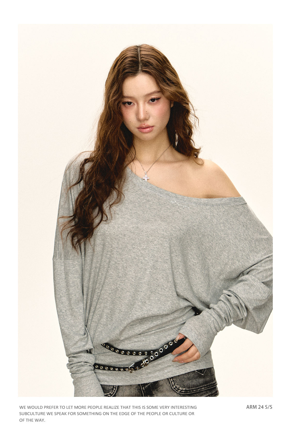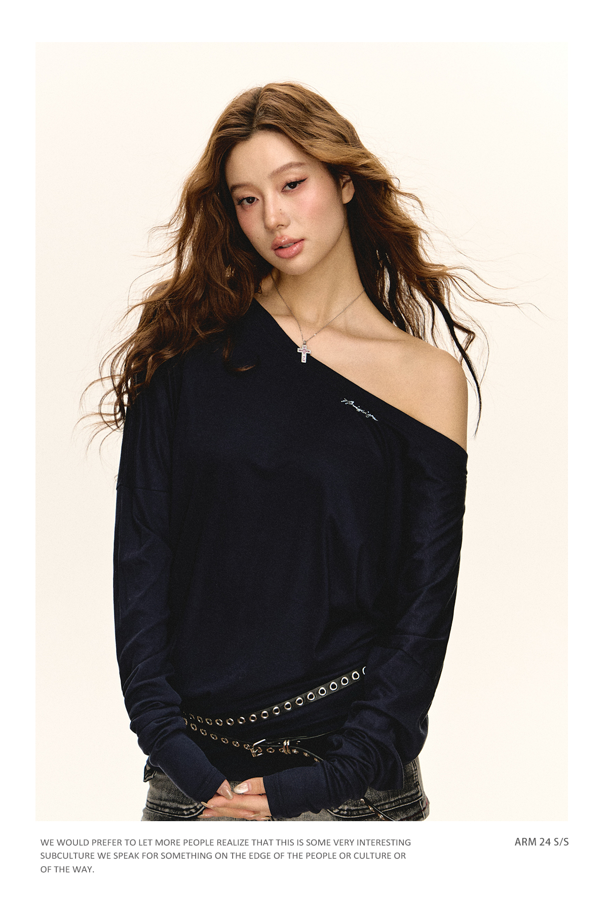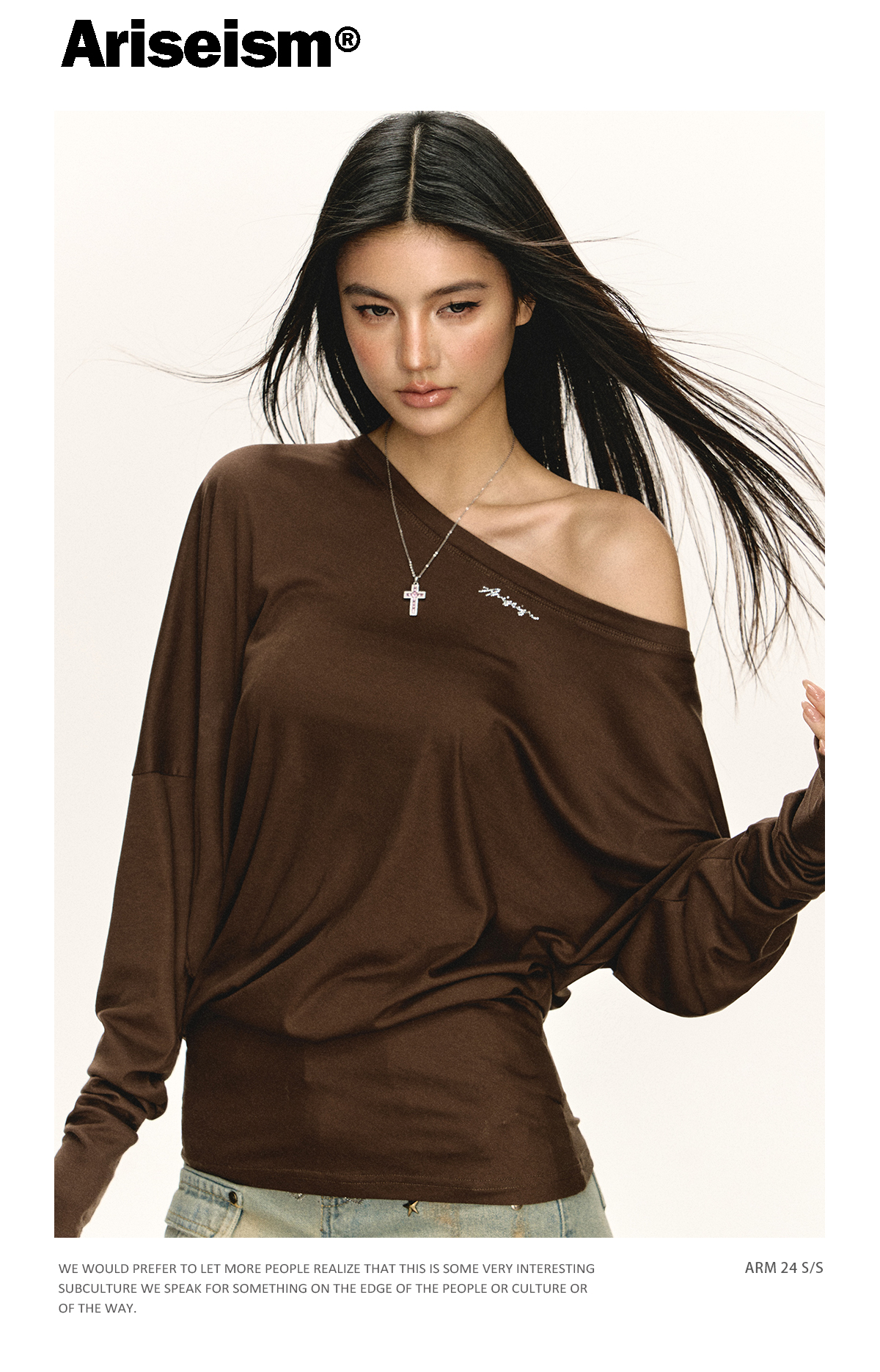 Ariseism 美式复古纯色宽松露肩长袖T恤女春季新款休闲上衣