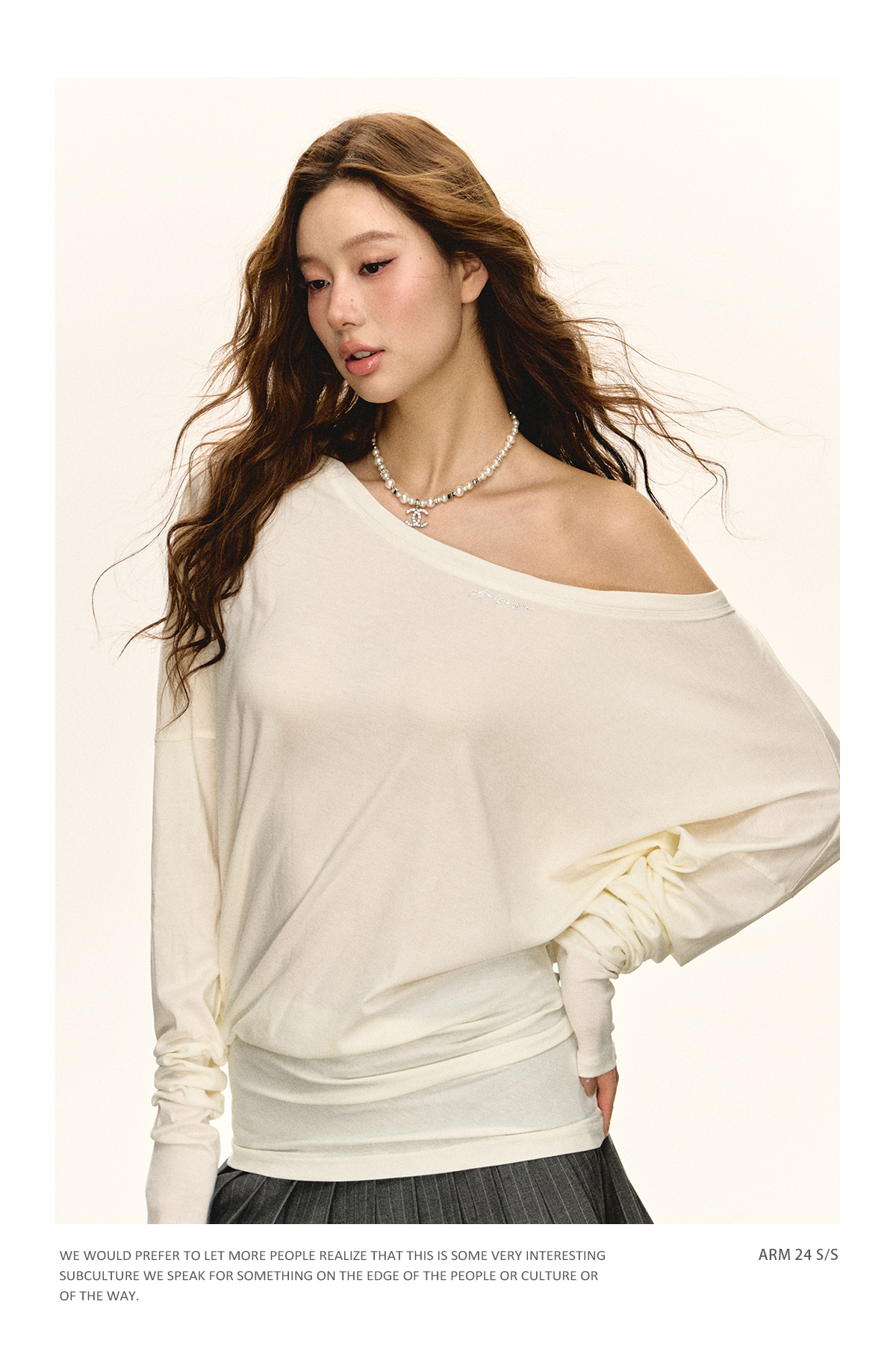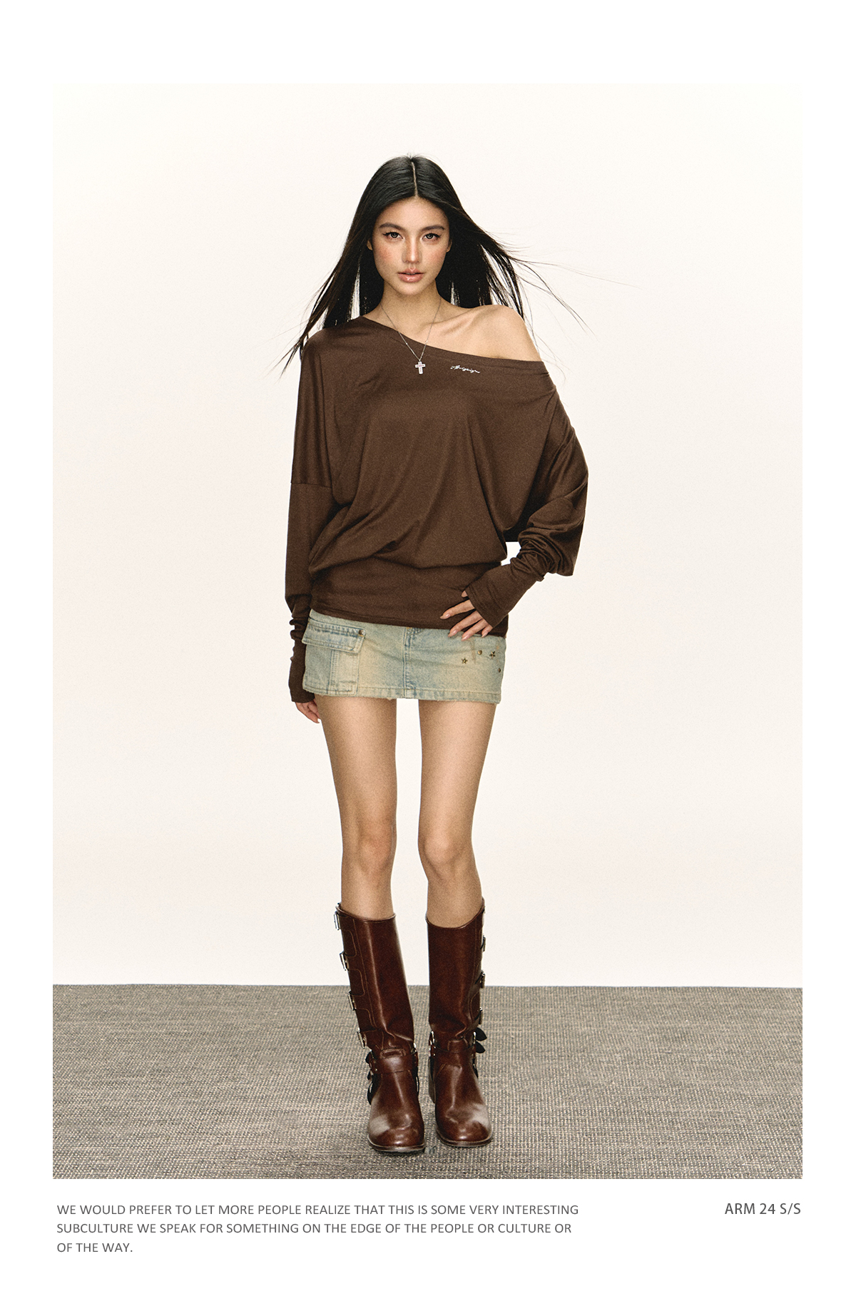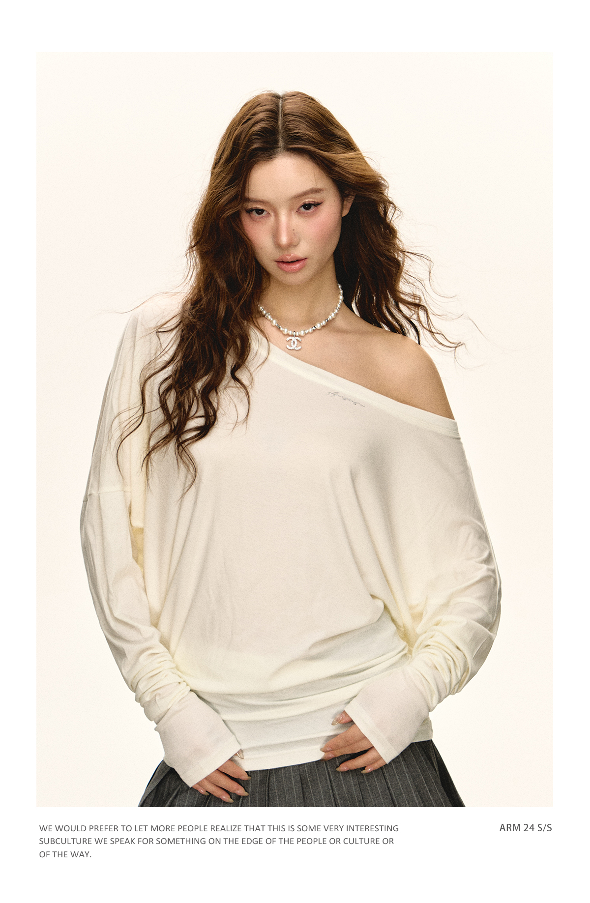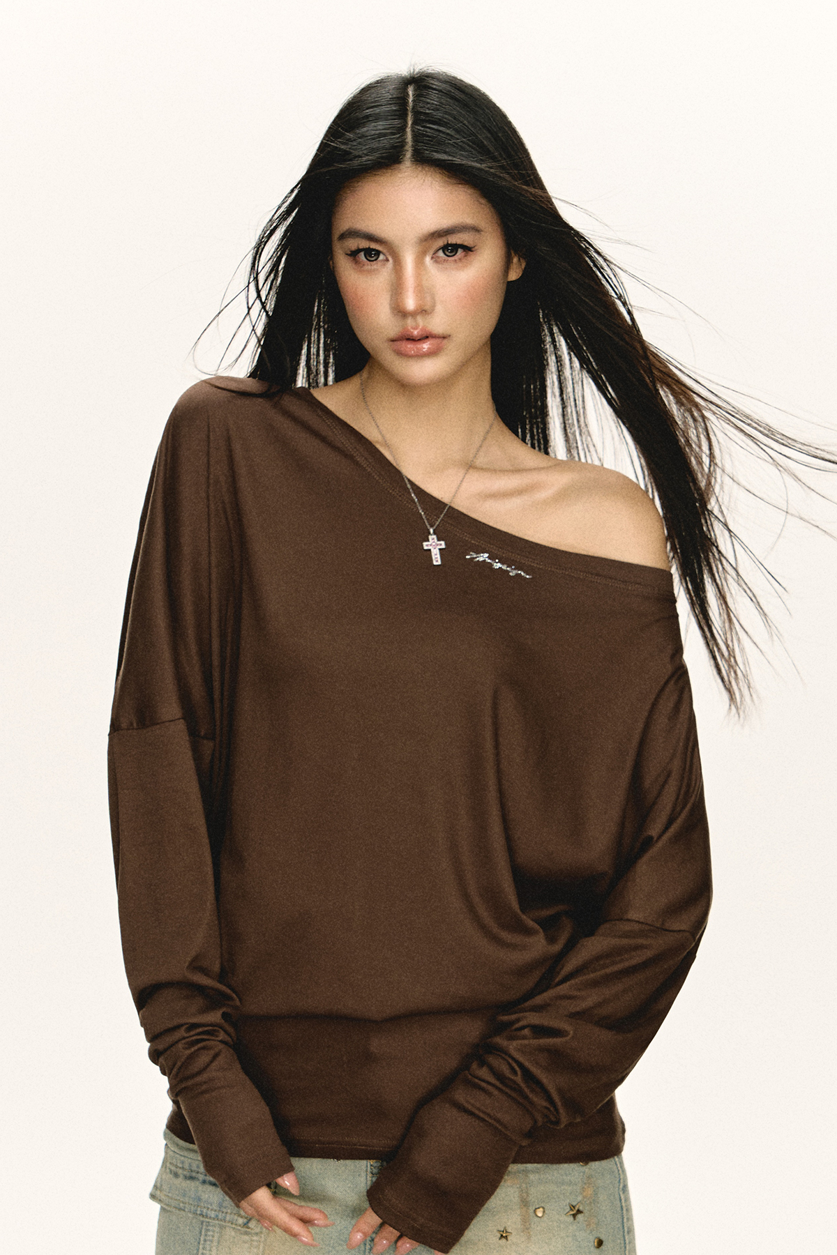 Ariseism 美式复古纯色宽松露肩长袖T恤女春季新款休闲上衣