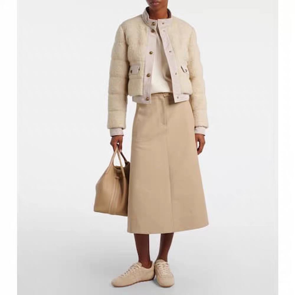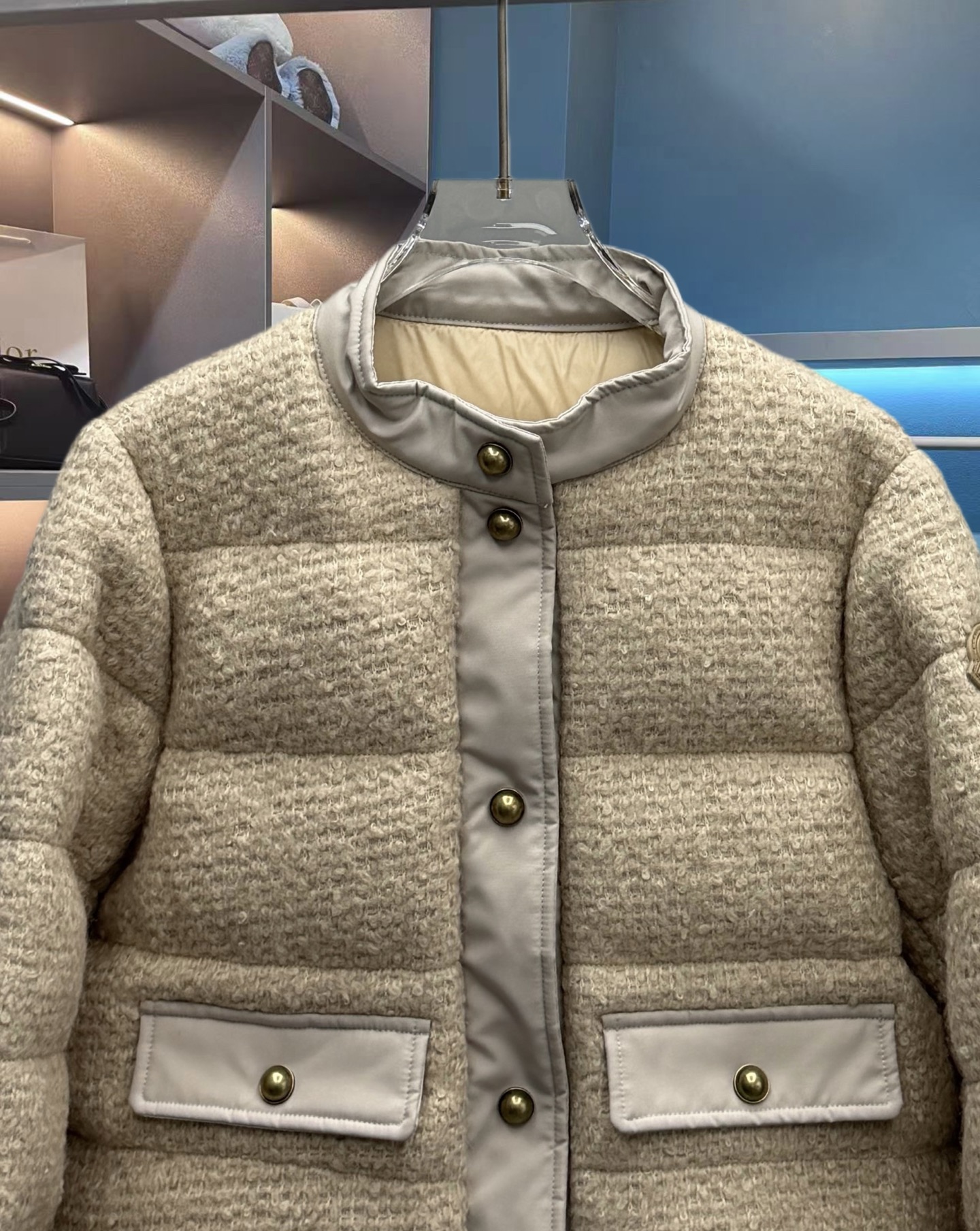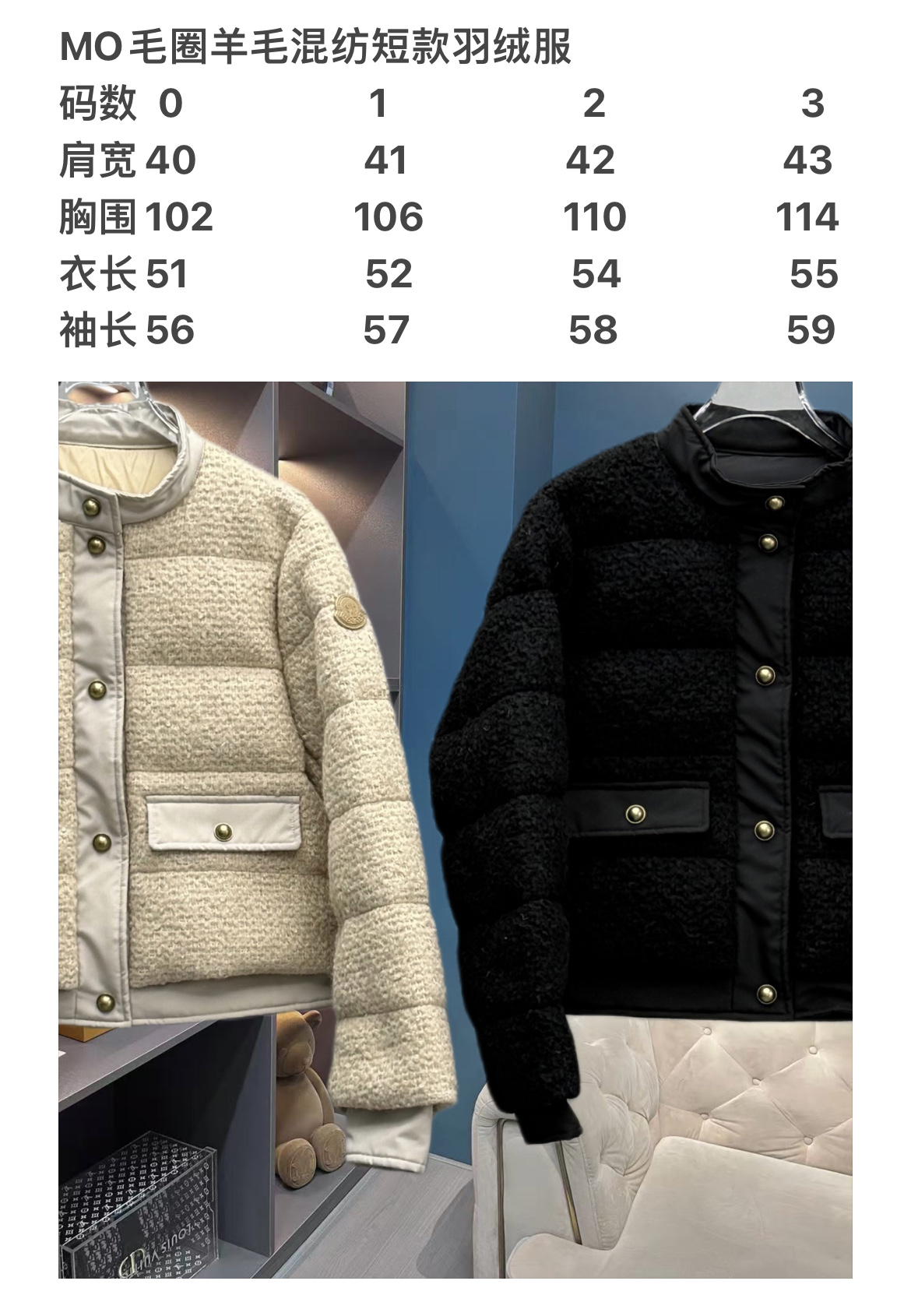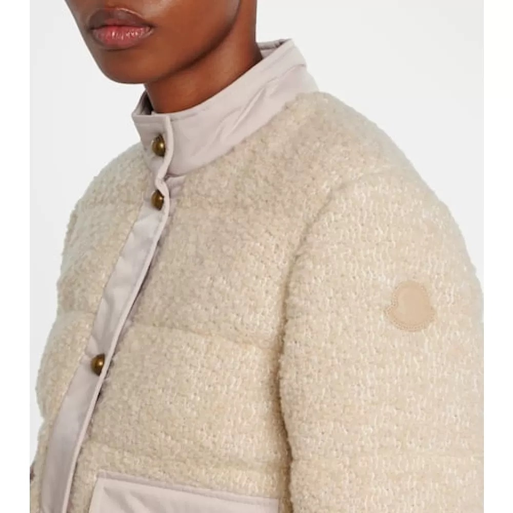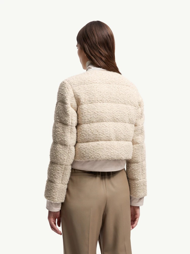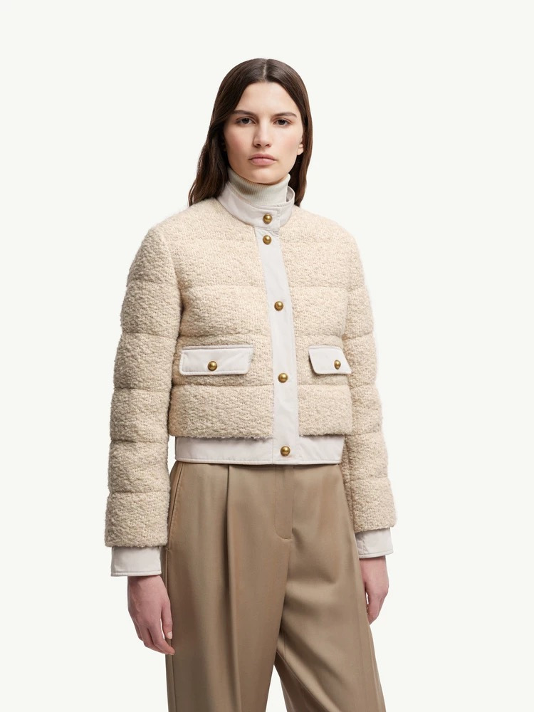 25秋冬新款 M家Blandy女士羊毛混纺毛圈短款羽绒外套 当羽绒邂逅粗花呢|Moncler 演绎“小香风”冬日新章 在保暖与优雅的边界,它以奶白粗花呢织就轻奢肌理,以金属扣与皮质拼接勾勒复古格调,将法式风情注入羽绒内核。 Moncler 标志性的蓬松填充暗藏温暖,短款廓形利落显高,双袋设计兼具实用性与造型感。从都市通勤到周末漫游,它让你在凛冽时节,也能以“小香风”的精致姿态,解锁冬日穿搭的优雅公式(注此款只可换码 不可退换款)