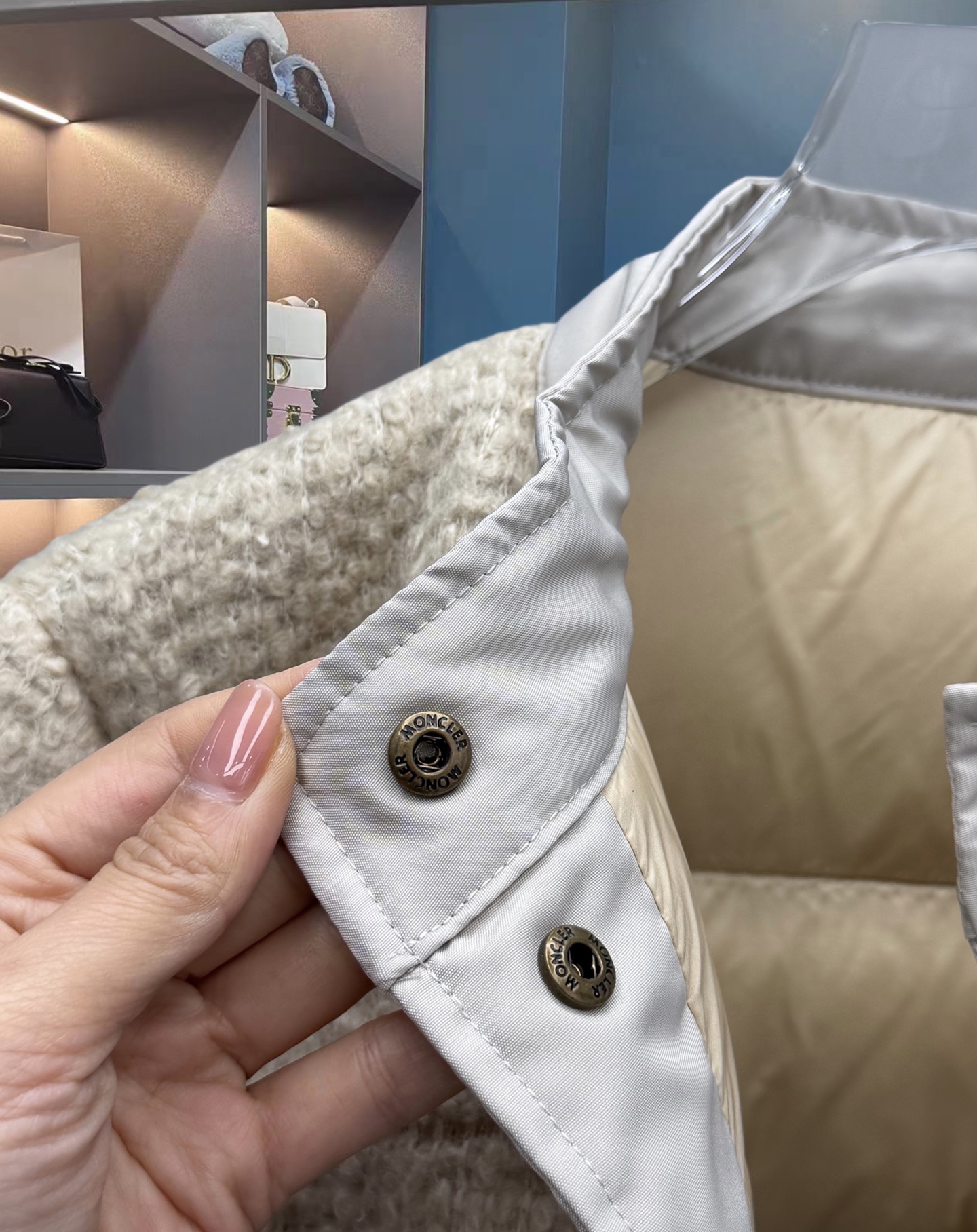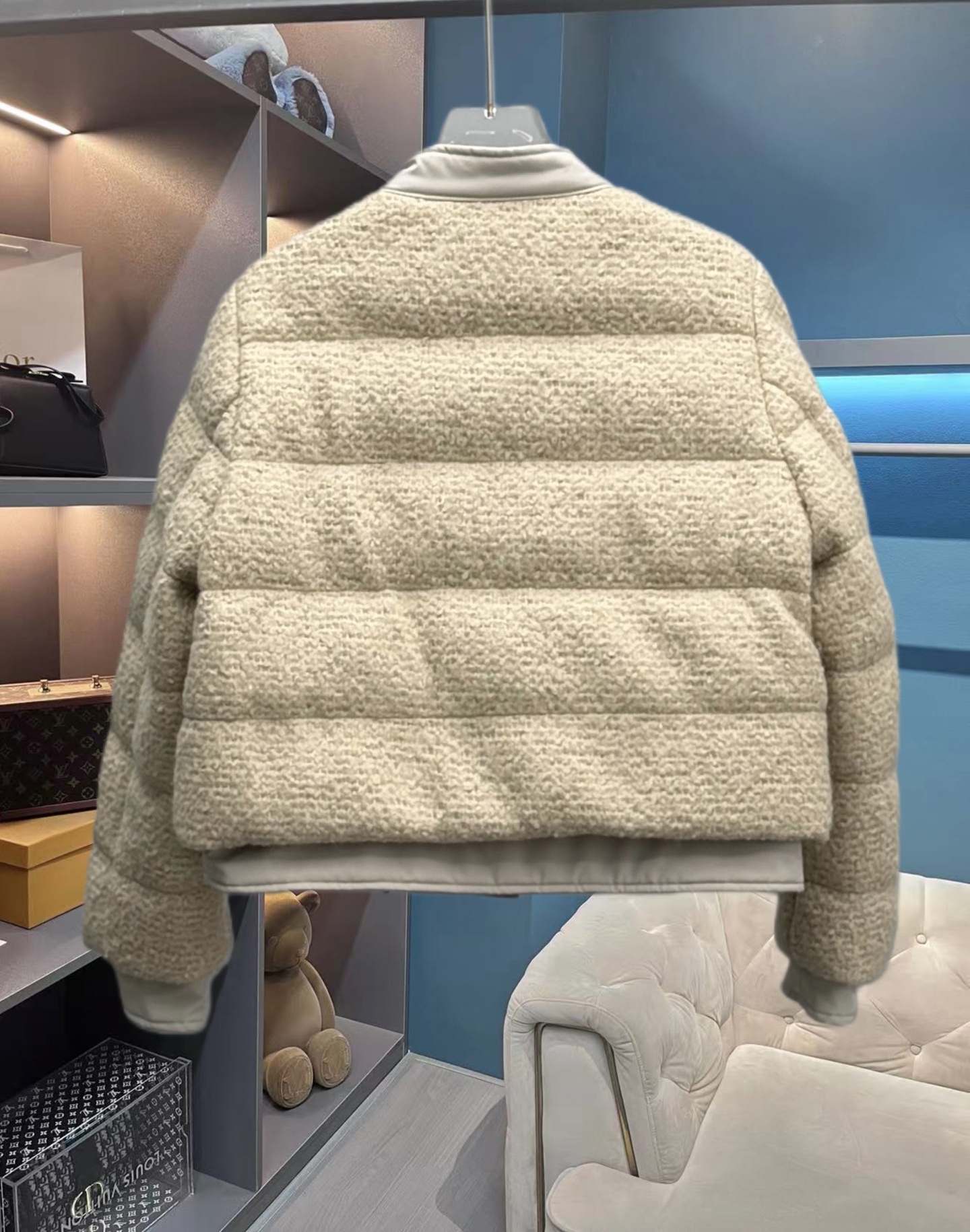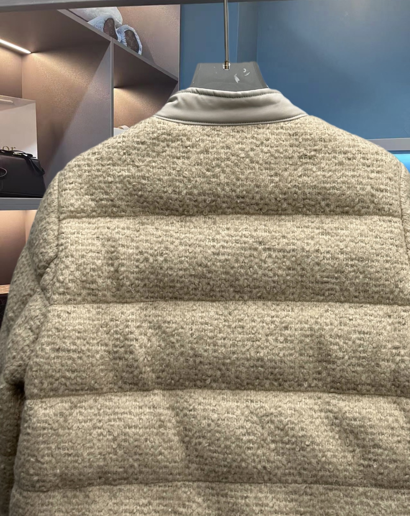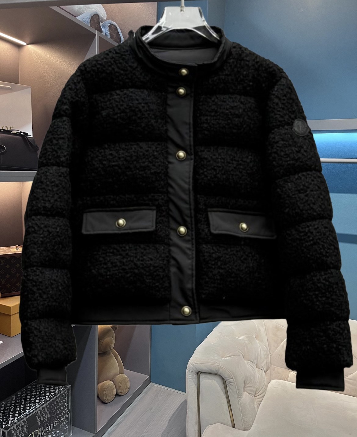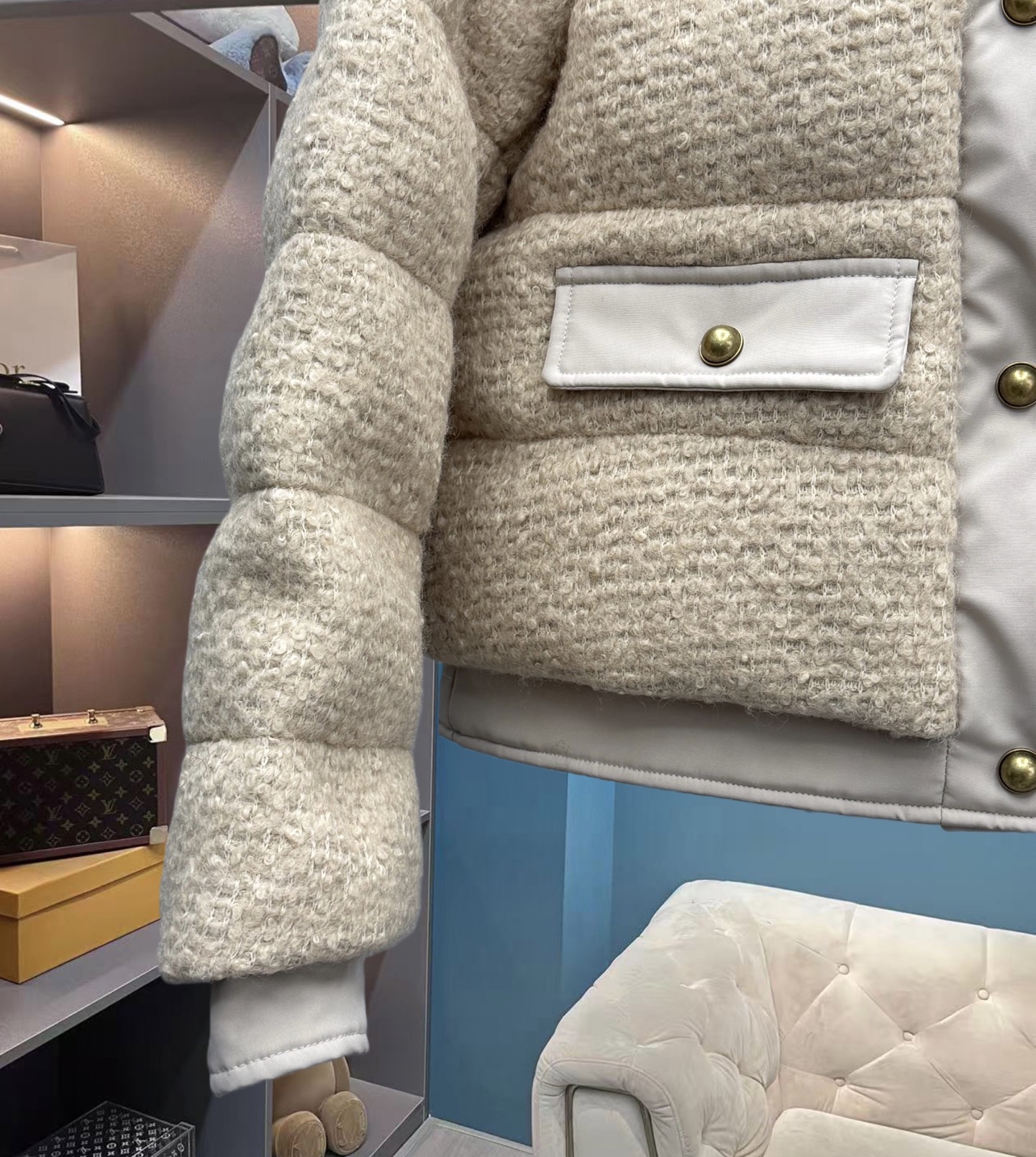 25秋冬新款 M家Blandy女士羊毛混纺毛圈短款羽绒外套 当羽绒邂逅粗花呢|Moncler 演绎“小香风”冬日新章 在保暖与优雅的边界,它以奶白粗花呢织就轻奢肌理,以金属扣与皮质拼接勾勒复古格调,将法式风情注入羽绒内核。 Moncler 标志性的蓬松填充暗藏温暖,短款廓形利落显高,双袋设计兼具实用性与造型感。从都市通勤到周末漫游,它让你在凛冽时节,也能以“小香风”的精致姿态,解锁冬日穿搭的优雅公式(注此款只可换码 不可退换款)