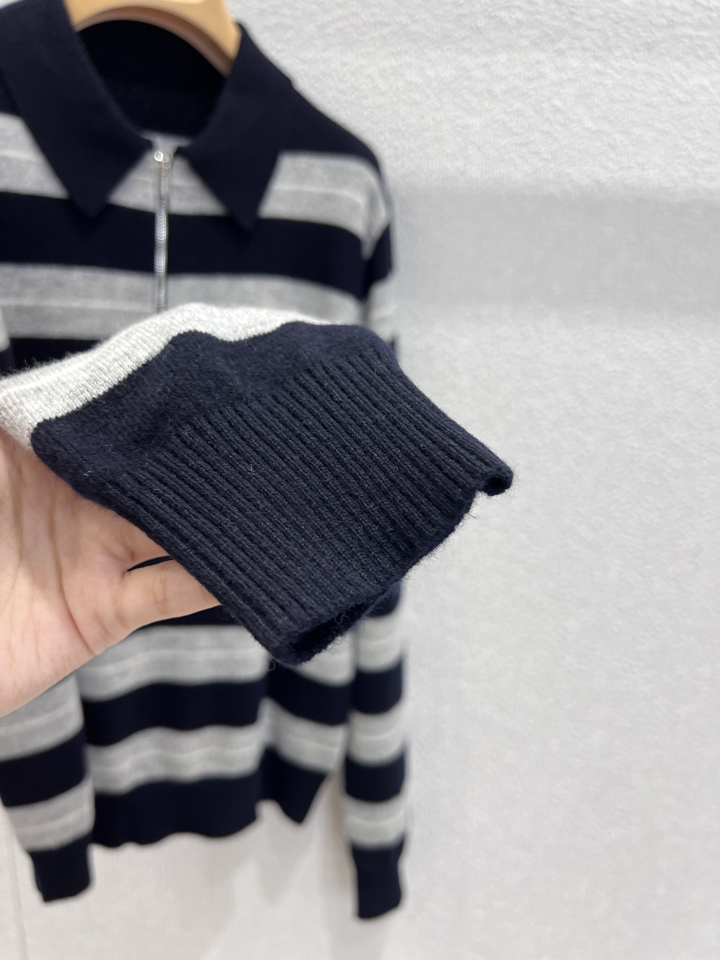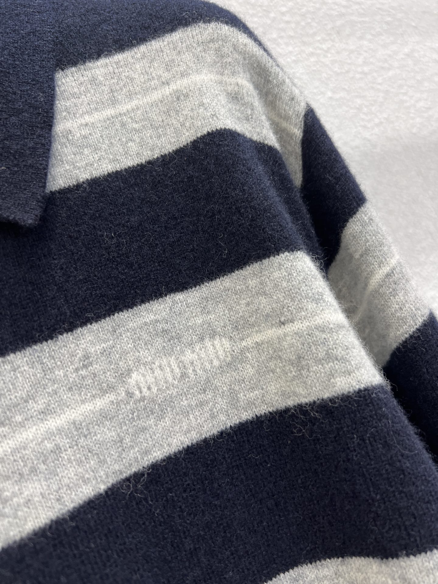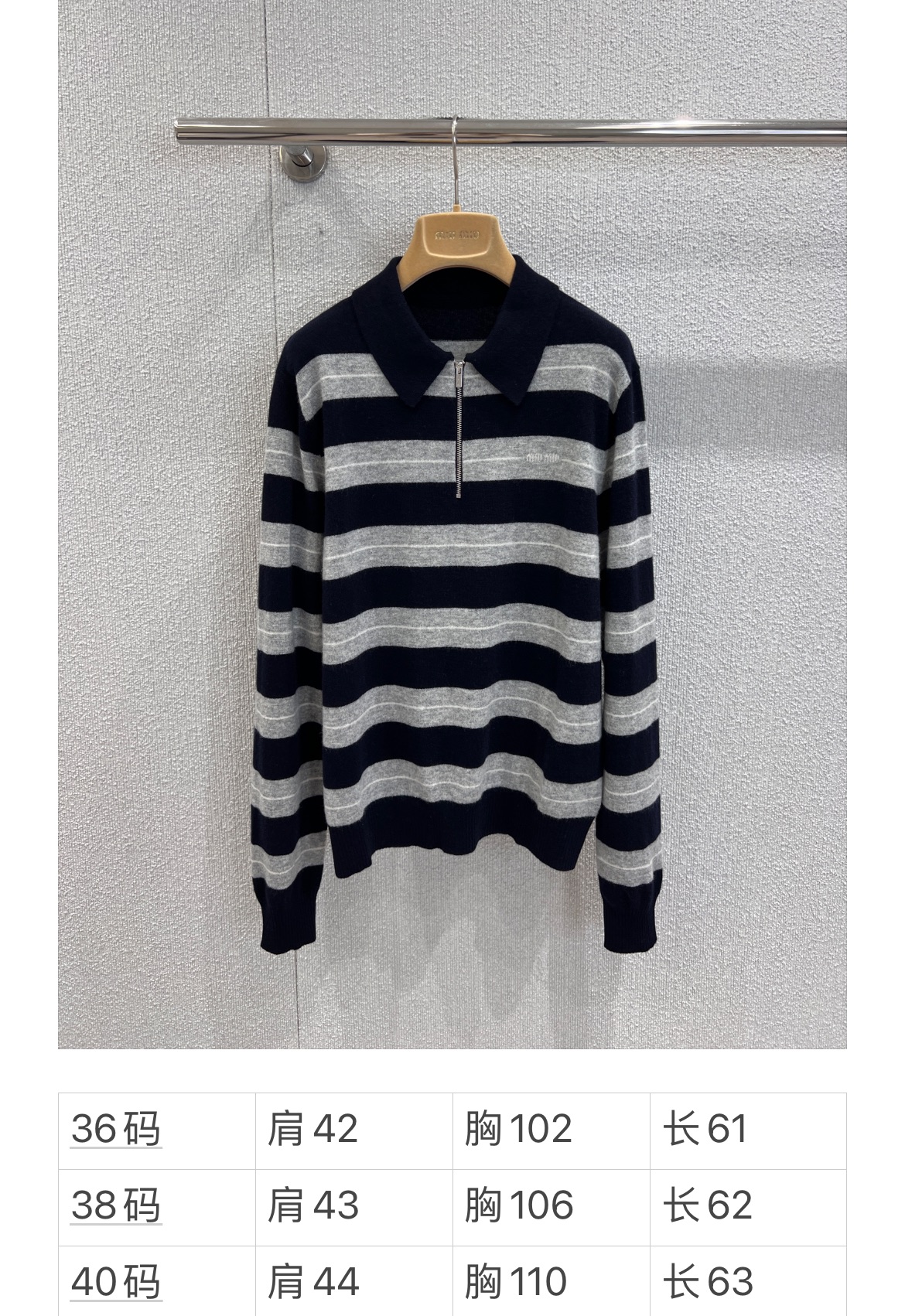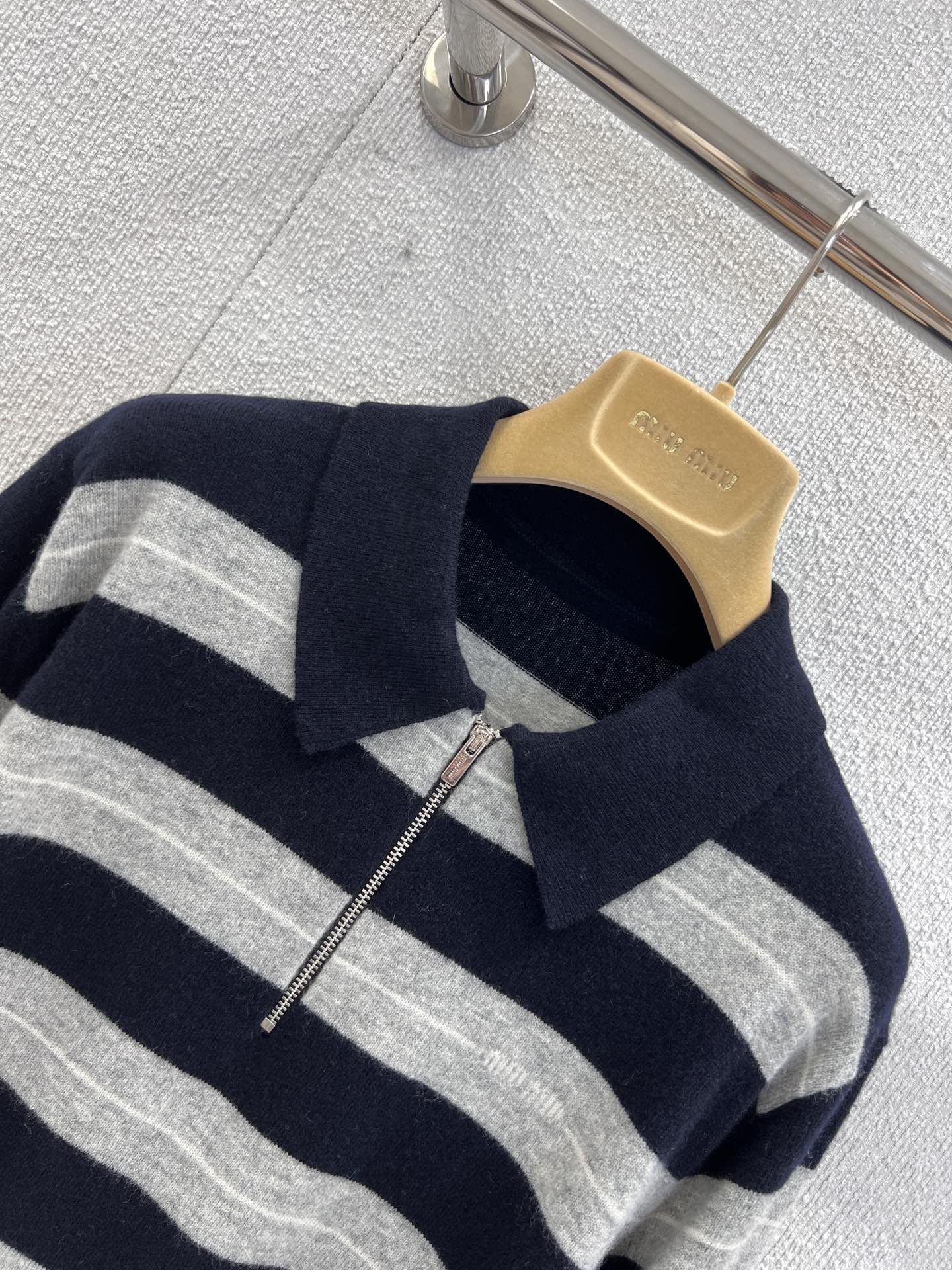 Miu Mi* 25FW早秋新款 条纹半拉链羊绒Polo衫丨⚠独家yb开发!高版出品!甄选细腻羊绒面料,柔软亲肤的质感在早秋时节给予肌肤温柔包裹,兼具保暖性与高级触感,深浅灰蓝条纹铺满衣身,复古撞色既显层次又自带减龄buff;日常穿搭尽显奢华品质。半拉链Polo领设计复古感拉满,拉链元素为经典版型注入个性酷感,领口的利落线条又保留了学院风的乖巧特质,甜酷碰撞的风格张力十足。