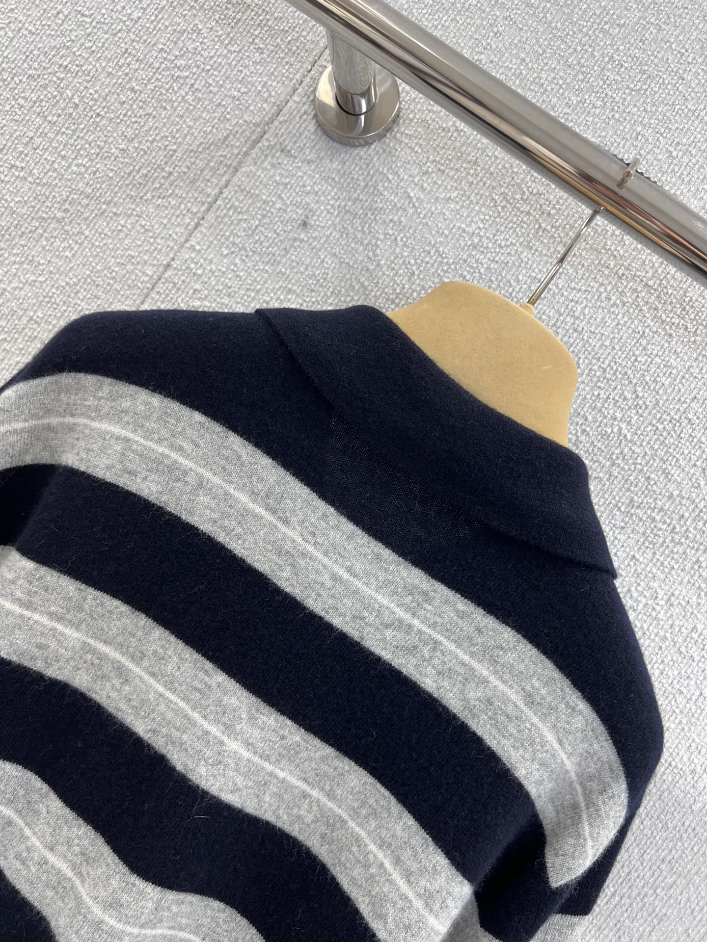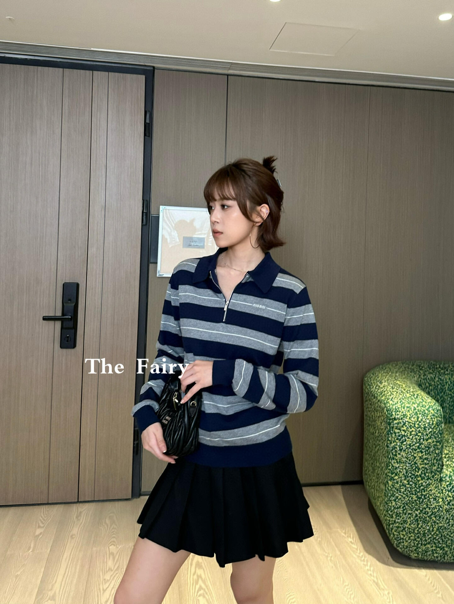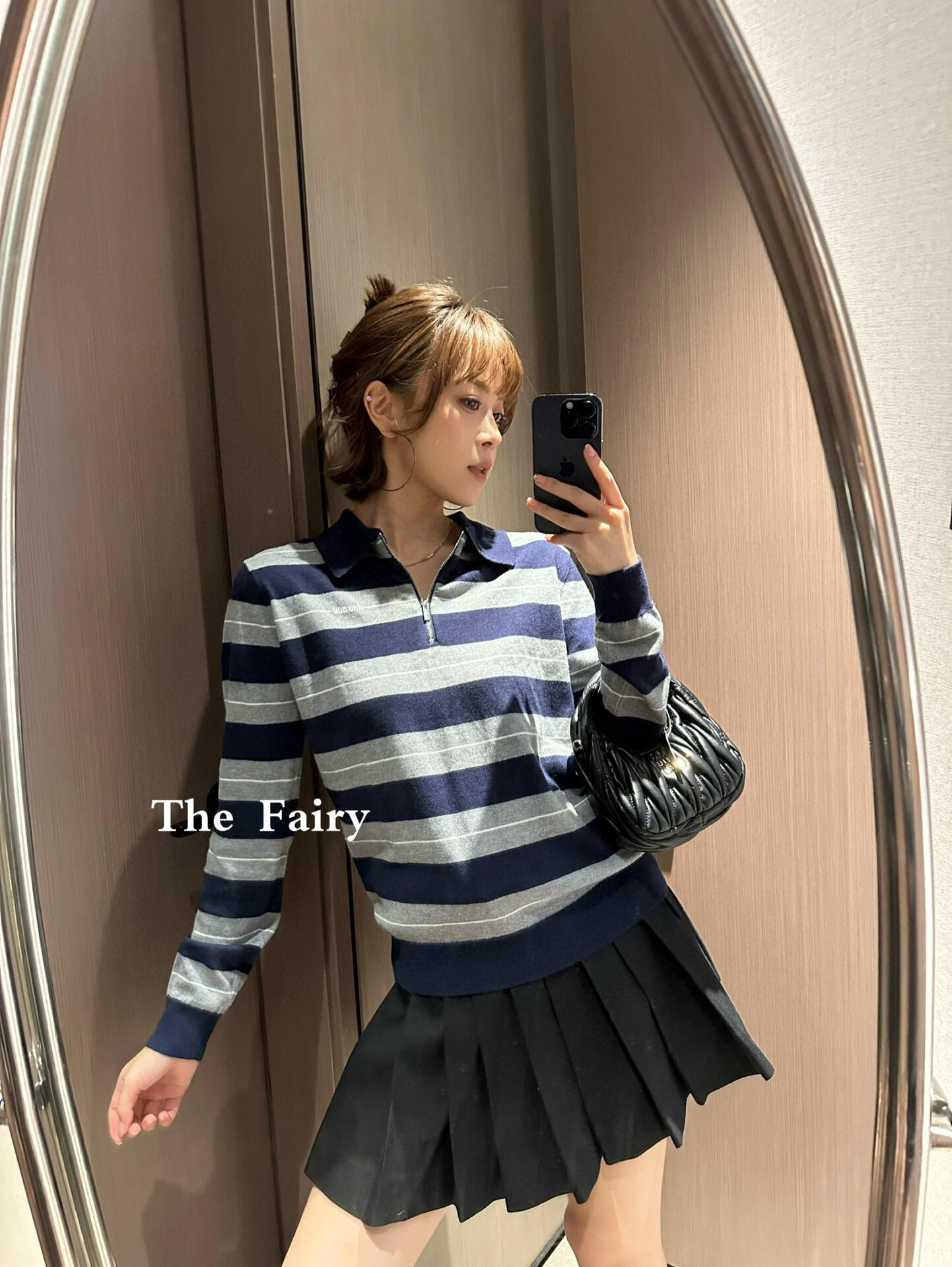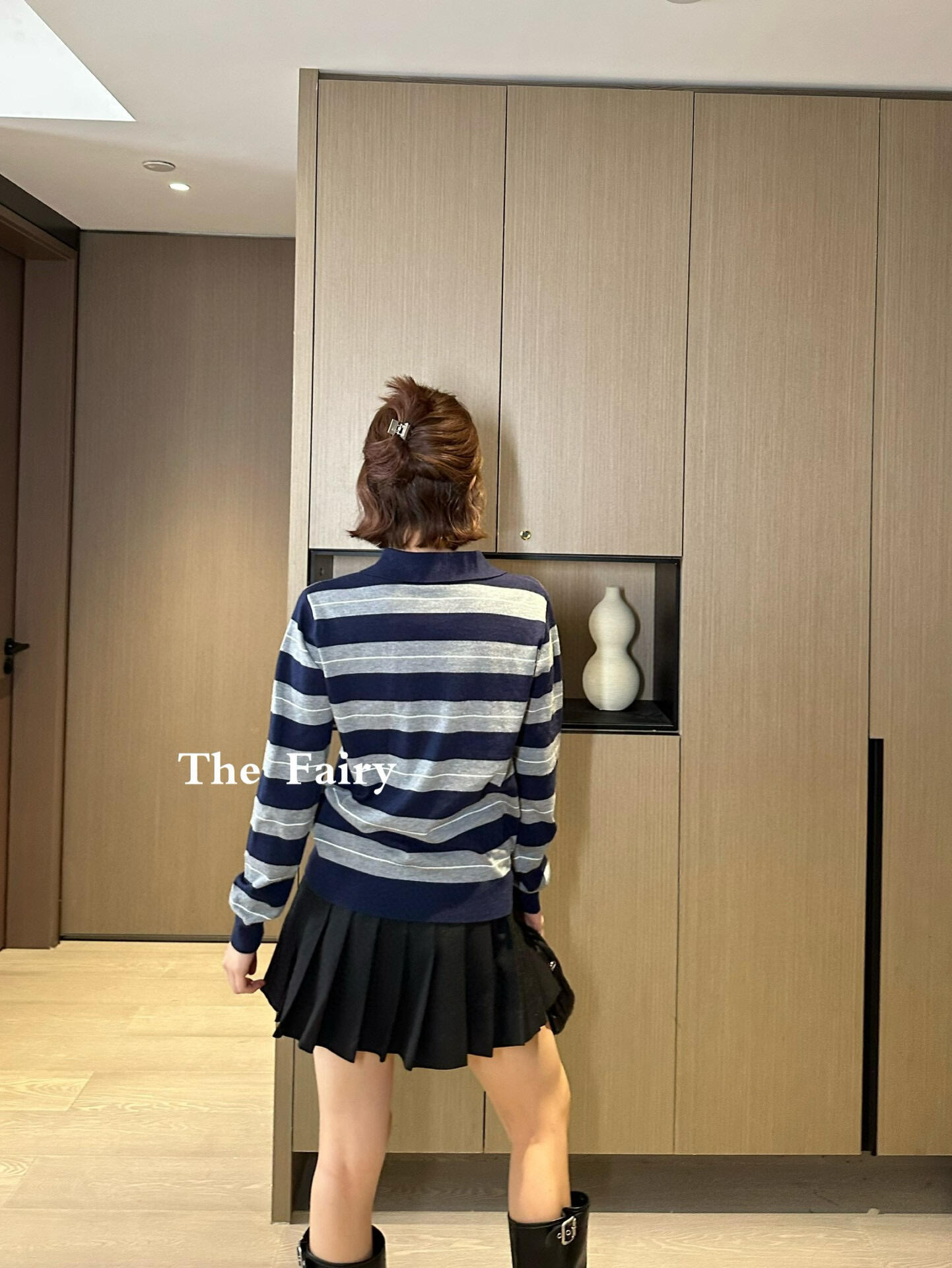 Miu Mi* 25FW早秋新款 条纹半拉链羊绒Polo衫丨⚠独家yb开发!高版出品!甄选细腻羊绒面料,柔软亲肤的质感在早秋时节给予肌肤温柔包裹,兼具保暖性与高级触感,深浅灰蓝条纹铺满衣身,复古撞色既显层次又自带减龄buff;日常穿搭尽显奢华品质。半拉链Polo领设计复古感拉满,拉链元素为经典版型注入个性酷感,领口的利落线条又保留了学院风的乖巧特质,甜酷碰撞的风格张力十足。
