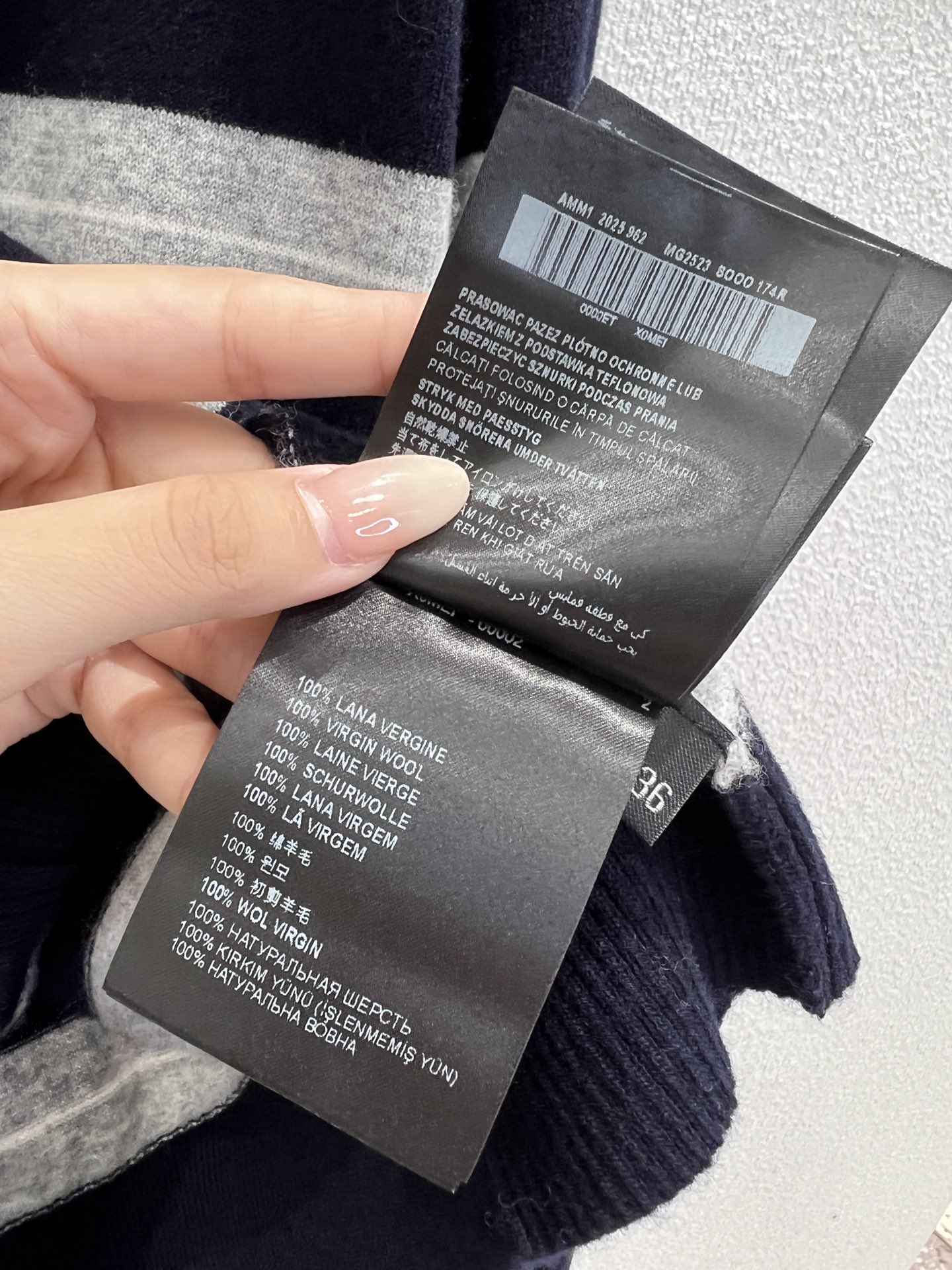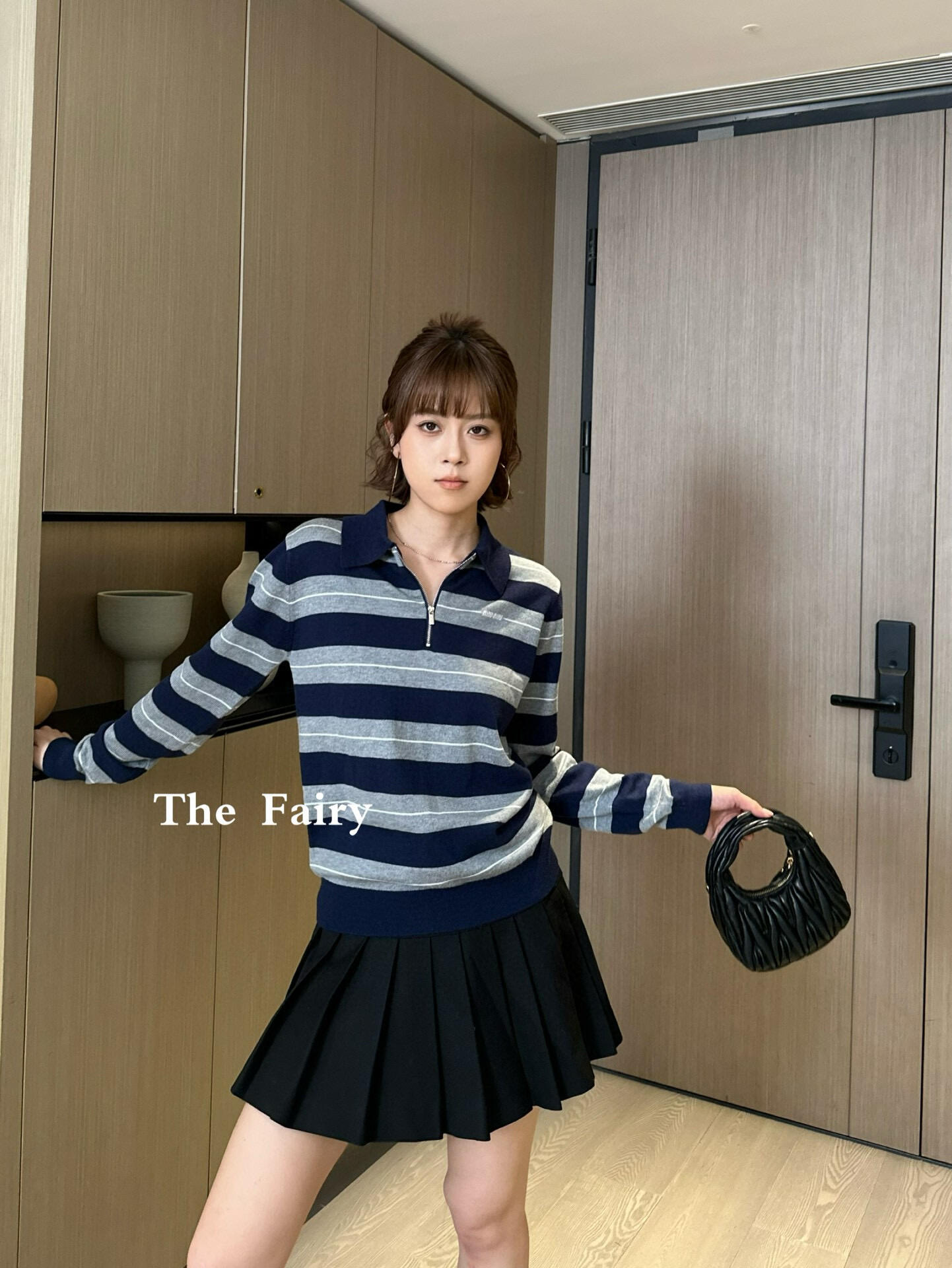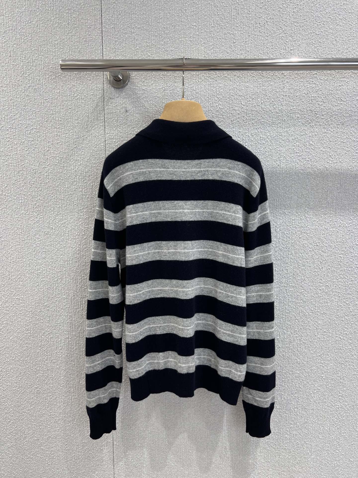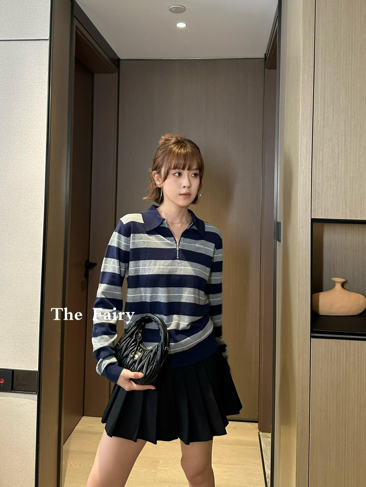 Miu Mi* 25FW早秋新款 条纹半拉链羊绒Polo衫丨⚠独家yb开发!高版出品!甄选细腻羊绒面料,柔软亲肤的质感在早秋时节给予肌肤温柔包裹,兼具保暖性与高级触感,深浅灰蓝条纹铺满衣身,复古撞色既显层次又自带减龄buff;日常穿搭尽显奢华品质。半拉链Polo领设计复古感拉满,拉链元素为经典版型注入个性酷感,领口的利落线条又保留了学院风的乖巧特质,甜酷碰撞的风格张力十足。