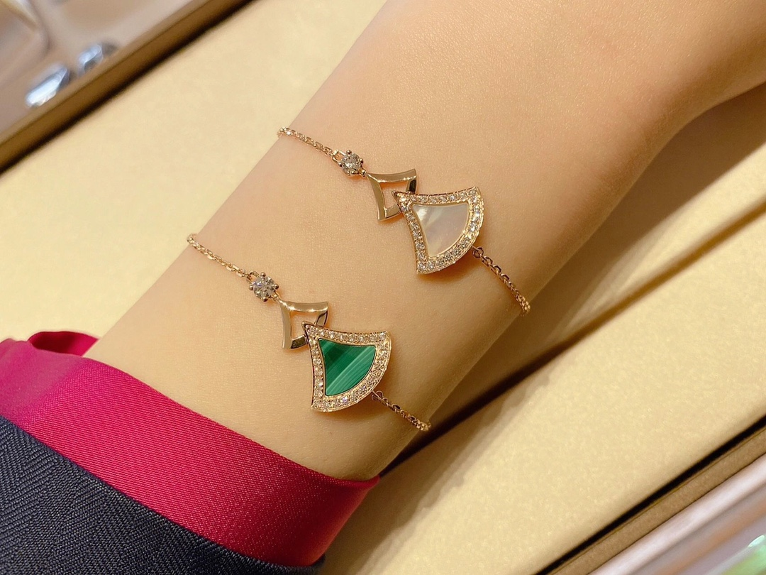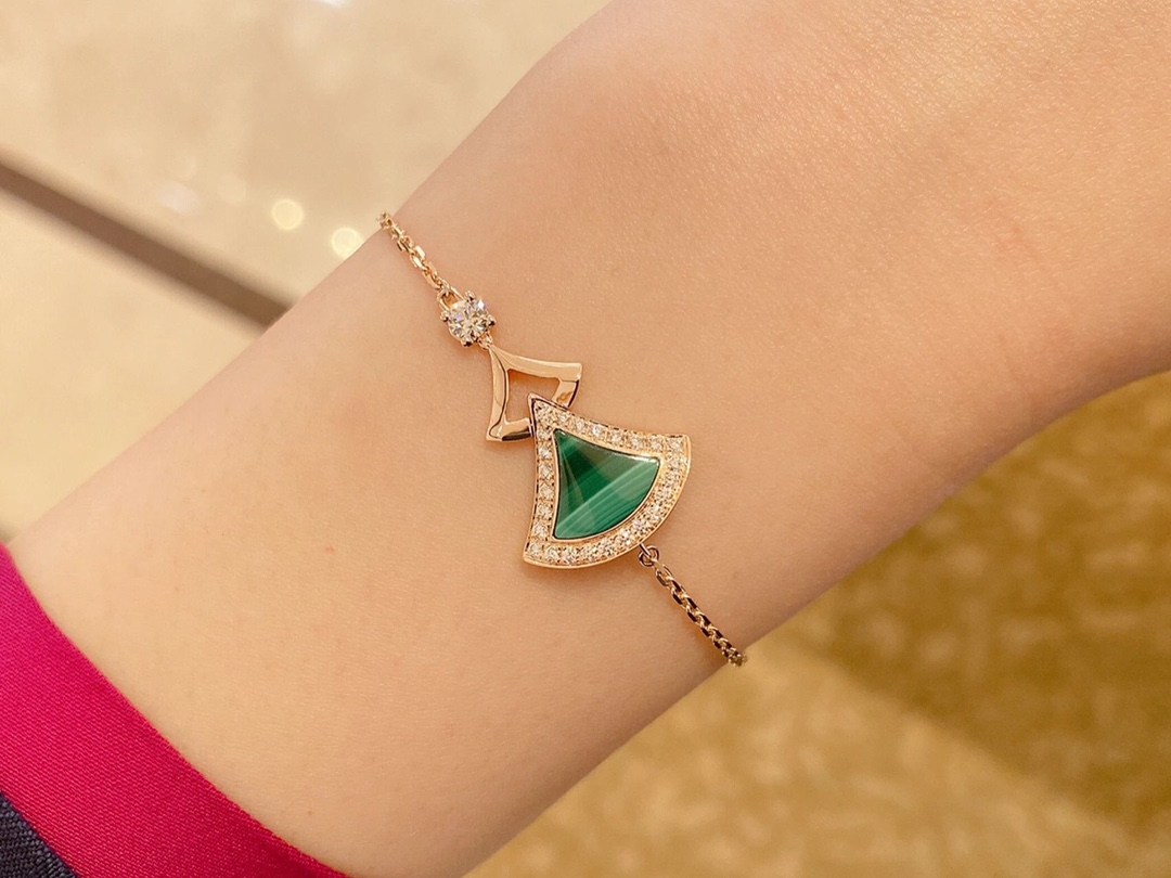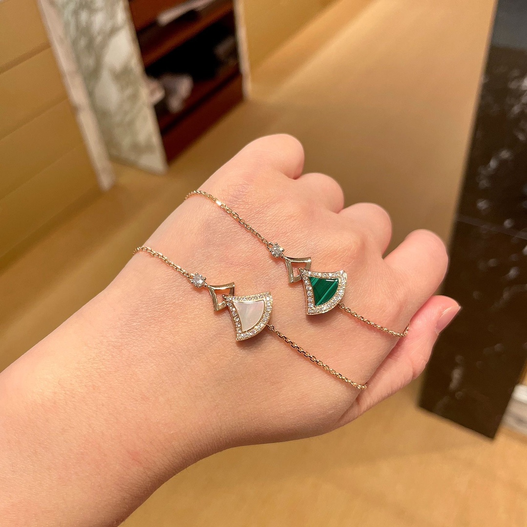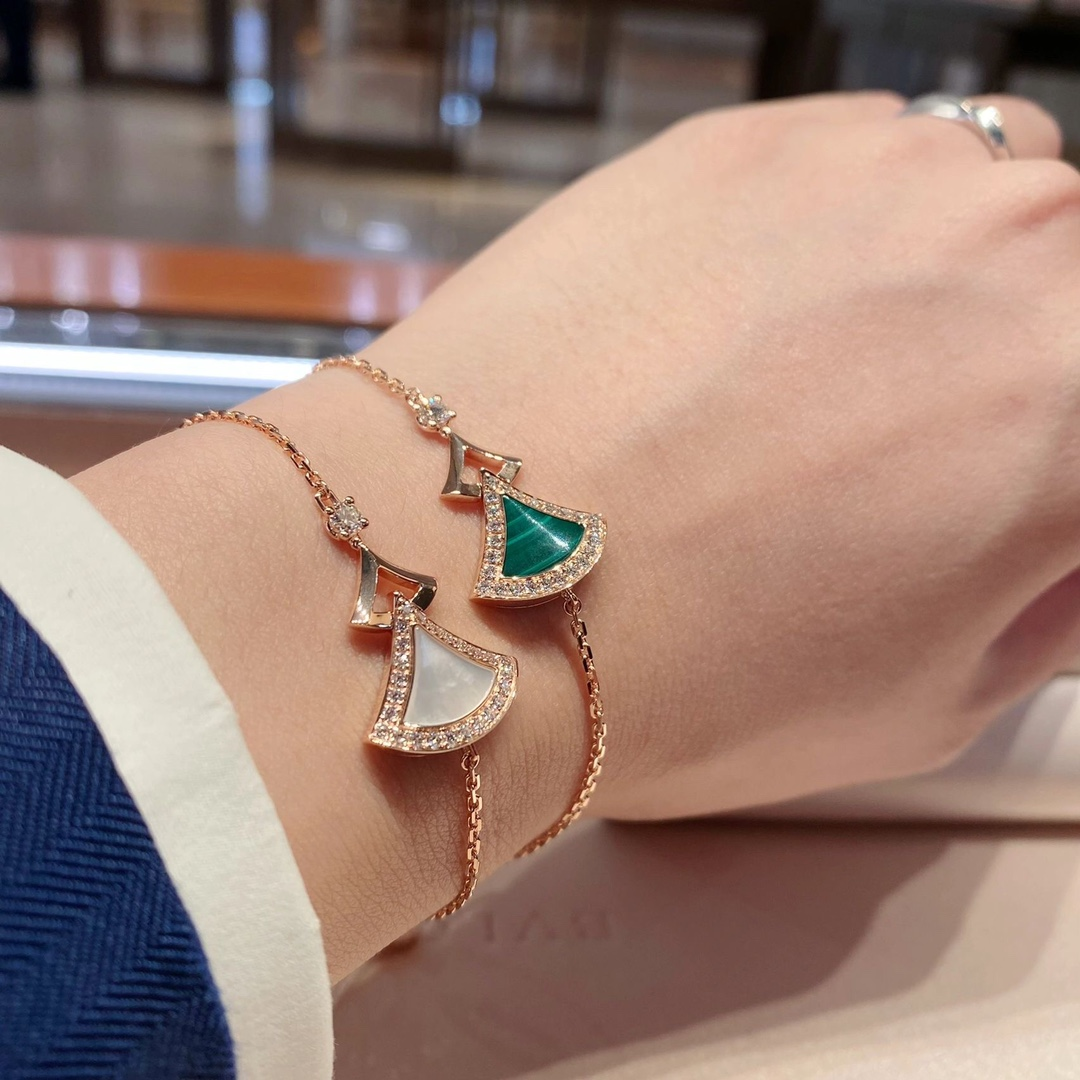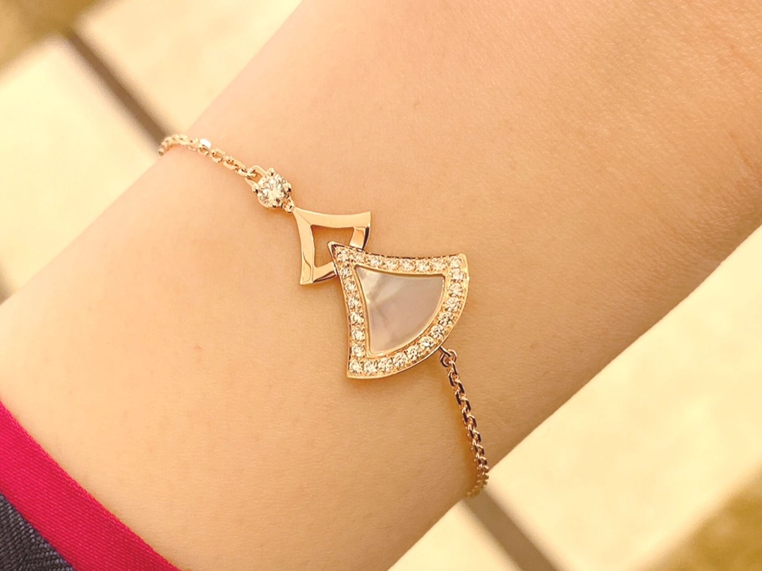 DIVAS' DREAM系列18K玫瑰金手链,精妙演绎意大利风情,以独特的罗马精神向魅力女性致敬。由女性的优雅气质汲取灵感,以密镶钻石勾勒珍珠母贝扇形轮廓:独树一帜的标志性元素结合罗马卡拉卡拉大浴场的马赛克图案,礼赞隽永之美。 通体采用V金电镀钯金银,厚金电镀,保色程度更久
