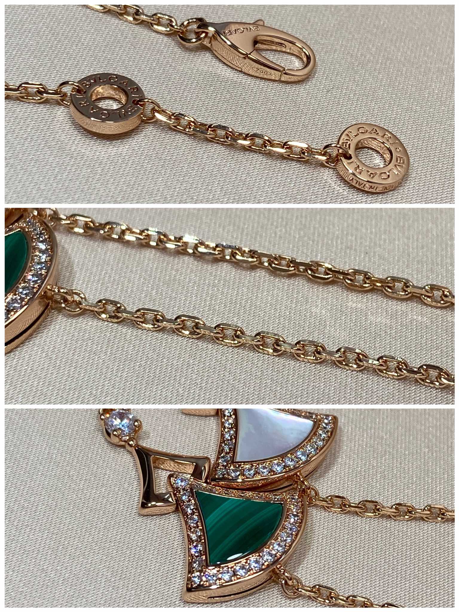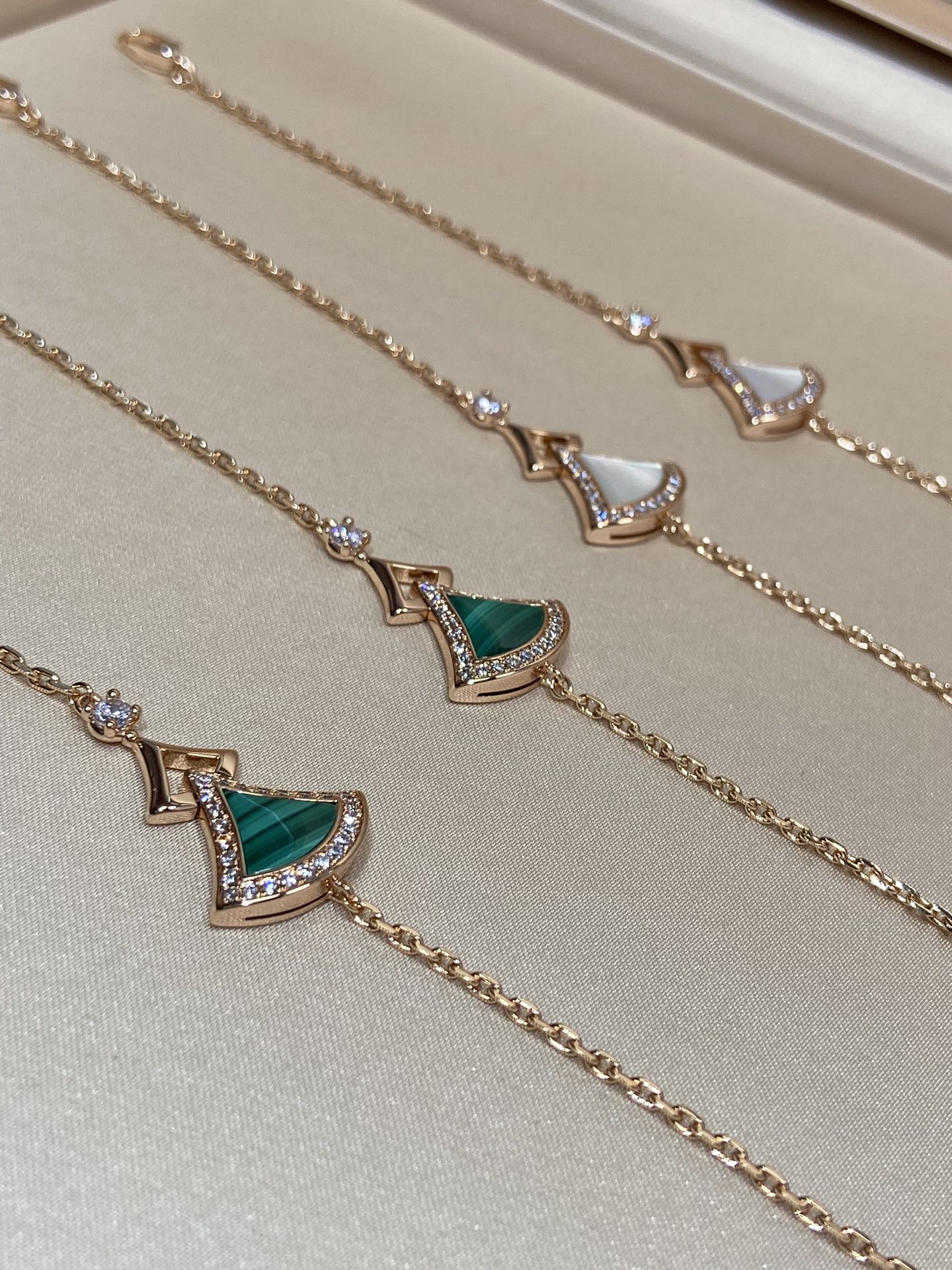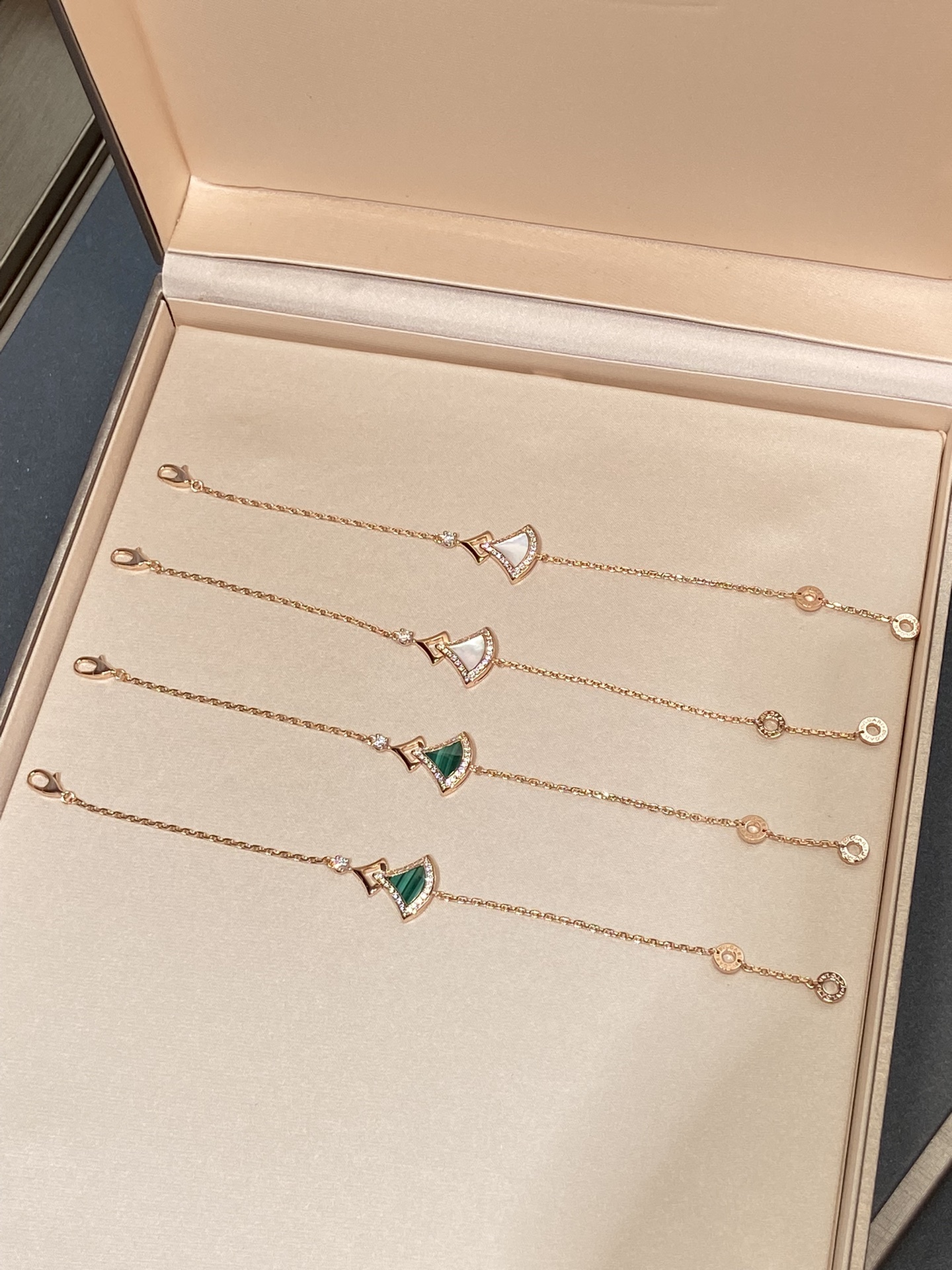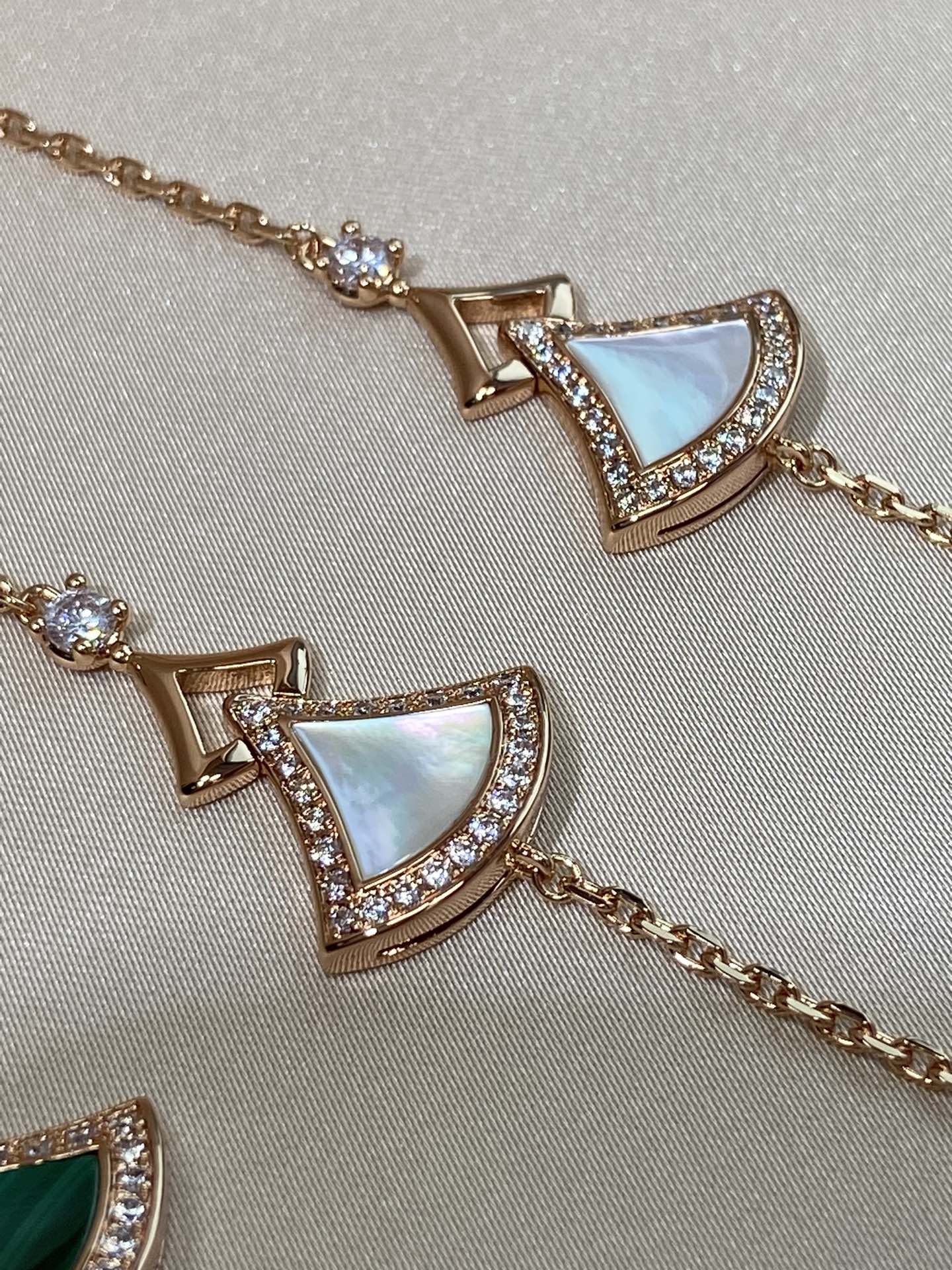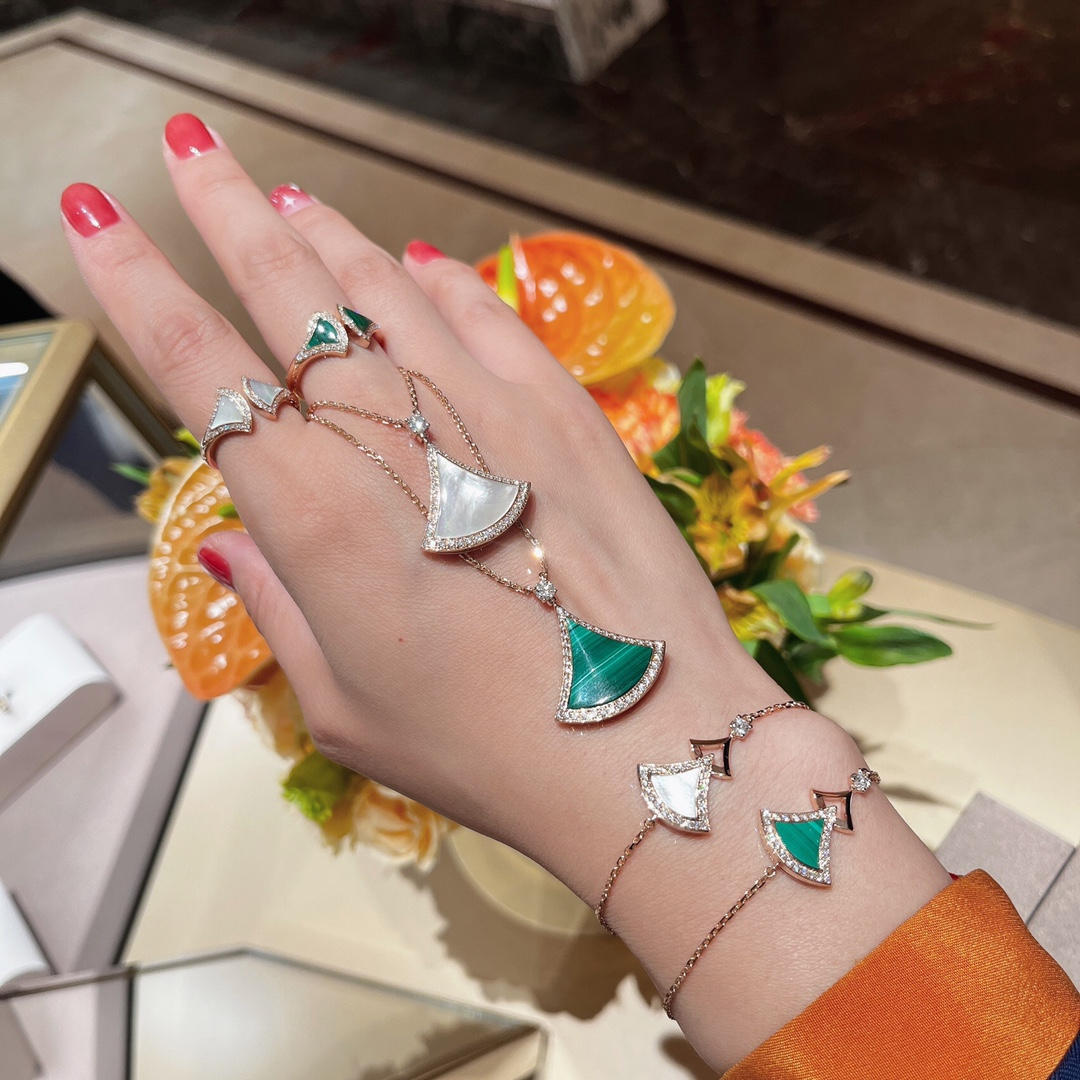 DIVAS' DREAM系列18K玫瑰金手链,精妙演绎意大利风情,以独特的罗马精神向魅力女性致敬。由女性的优雅气质汲取灵感,以密镶钻石勾勒珍珠母贝扇形轮廓:独树一帜的标志性元素结合罗马卡拉卡拉大浴场的马赛克图案,礼赞隽永之美。 通体采用V金电镀钯金银,厚金电镀,保色程度更久