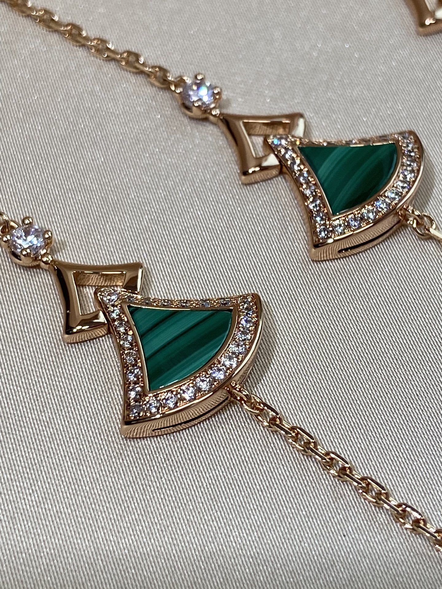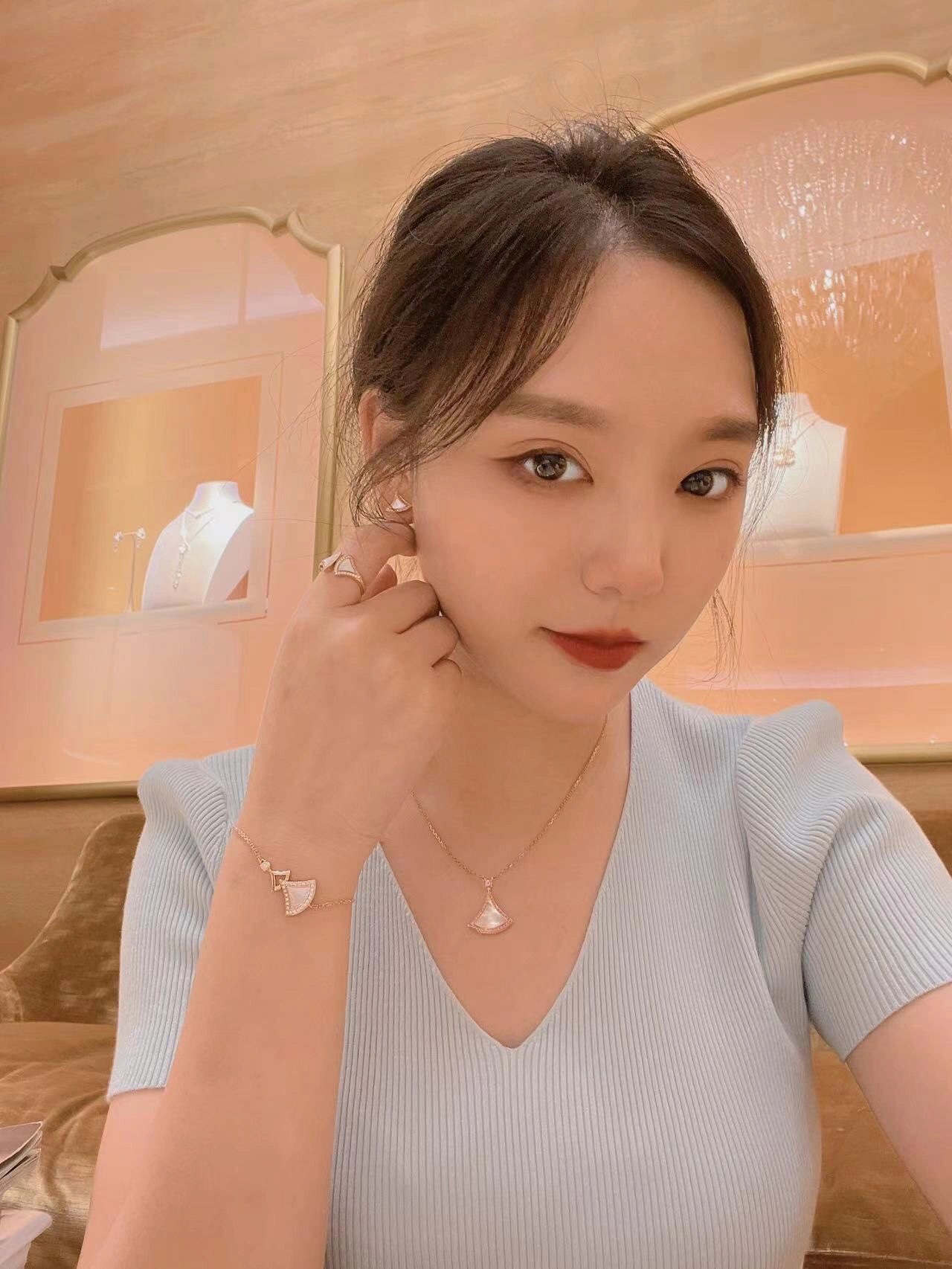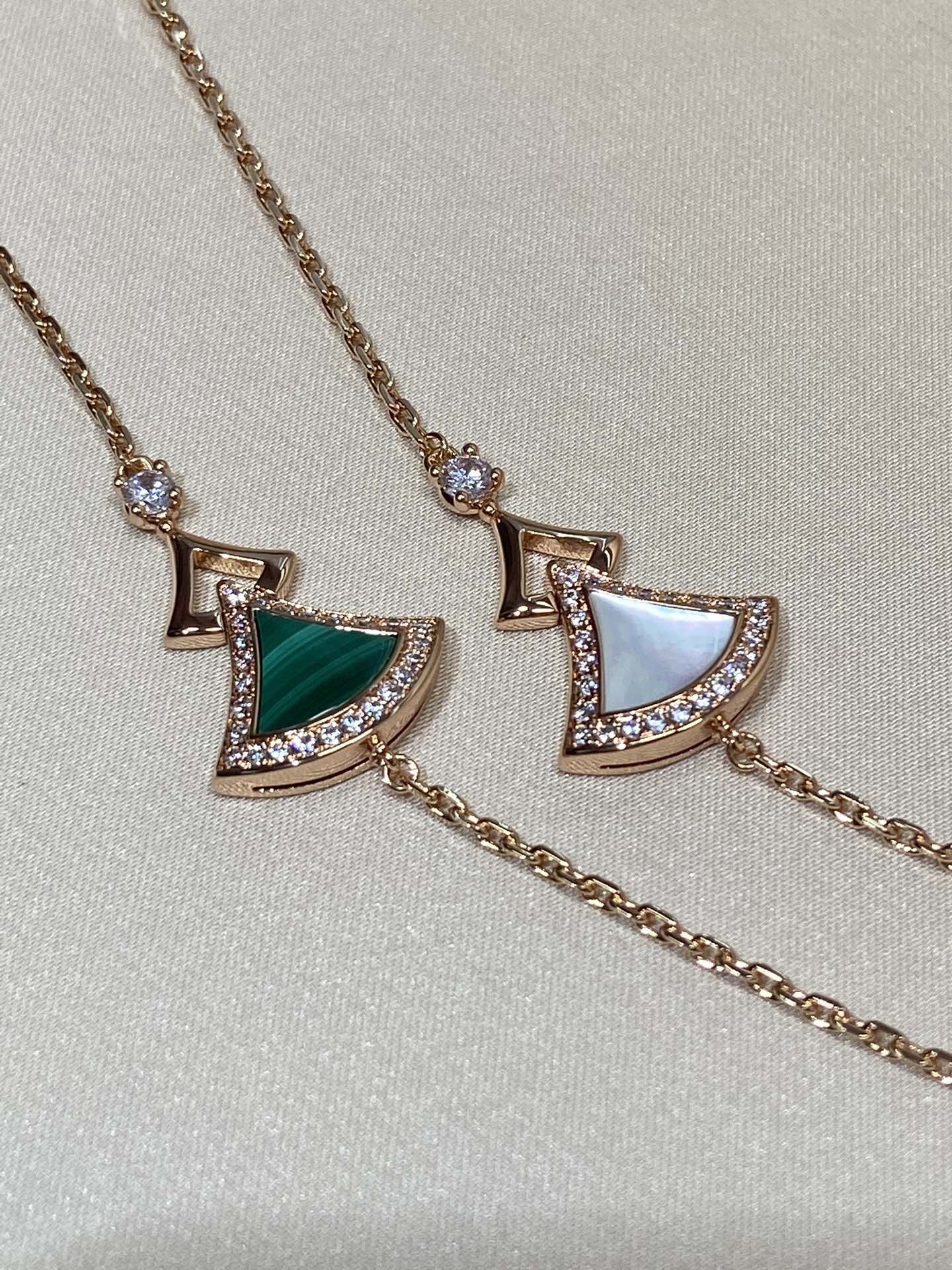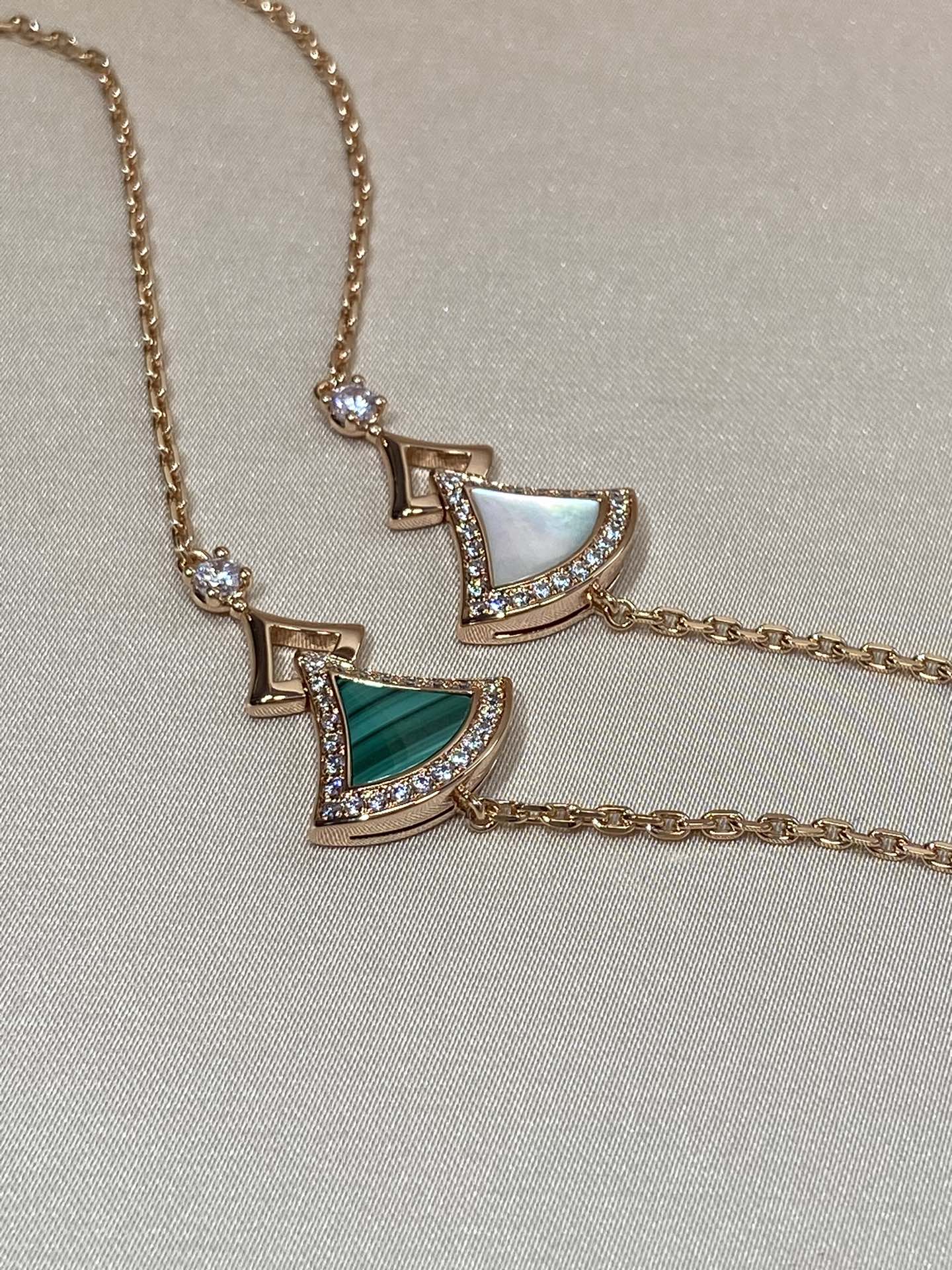 DIVAS' DREAM系列18K玫瑰金手链,精妙演绎意大利风情,以独特的罗马精神向魅力女性致敬。由女性的优雅气质汲取灵感,以密镶钻石勾勒珍珠母贝扇形轮廓:独树一帜的标志性元素结合罗马卡拉卡拉大浴场的马赛克图案,礼赞隽永之美。 通体采用V金电镀钯金银,厚金电镀,保色程度更久