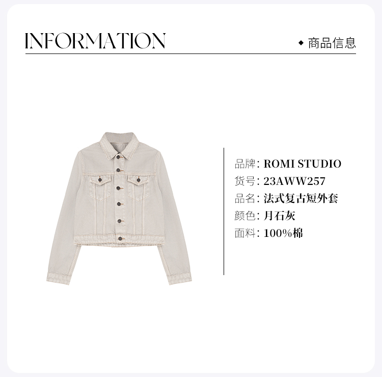 ROMI STUDIO“法式复古”100%棉翻领修身短款牛仔夹克外套23AWW257