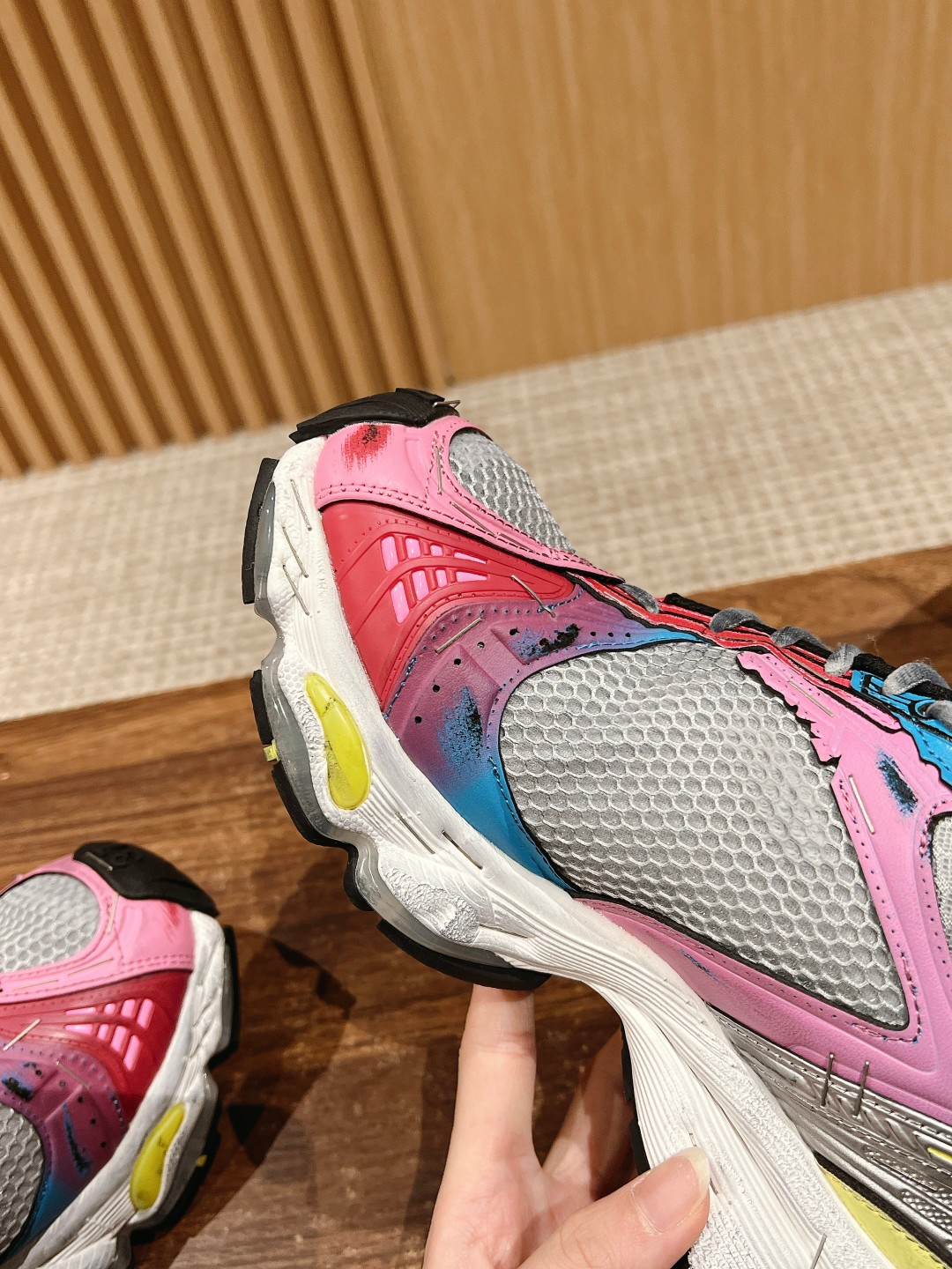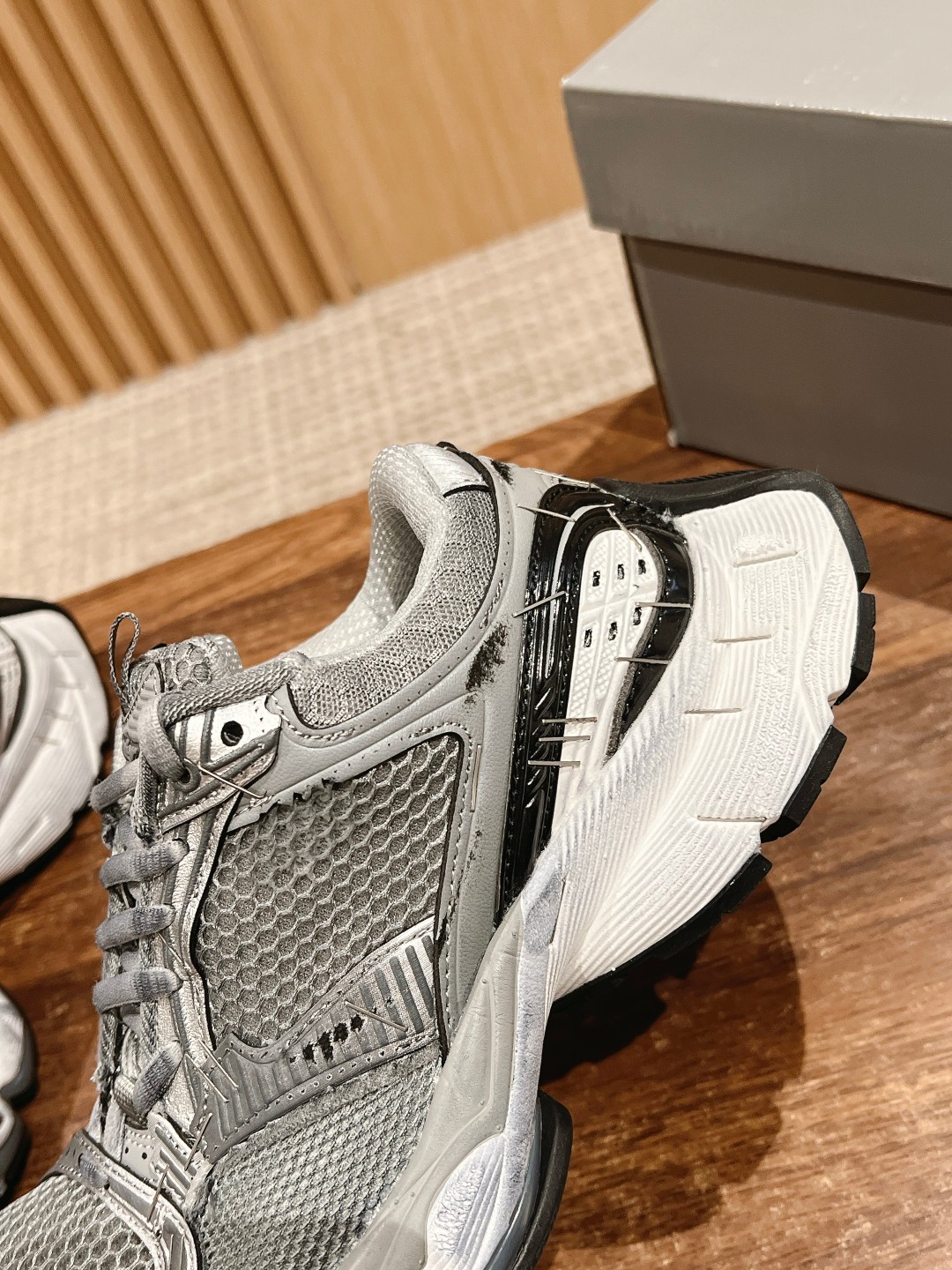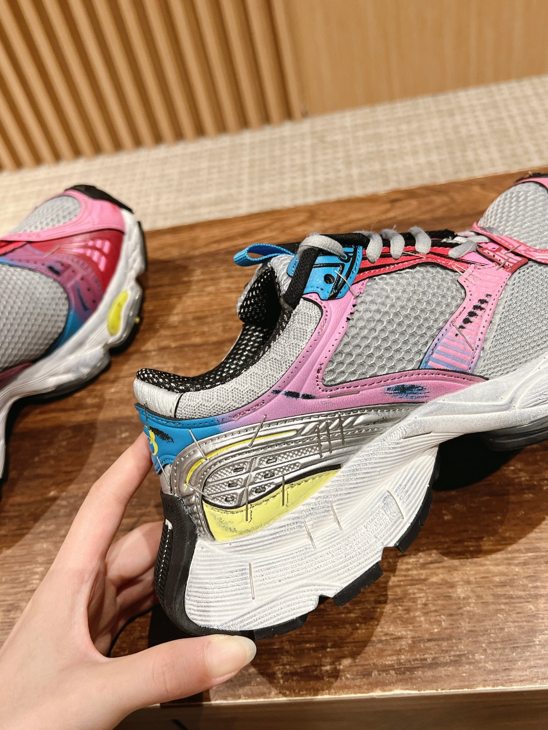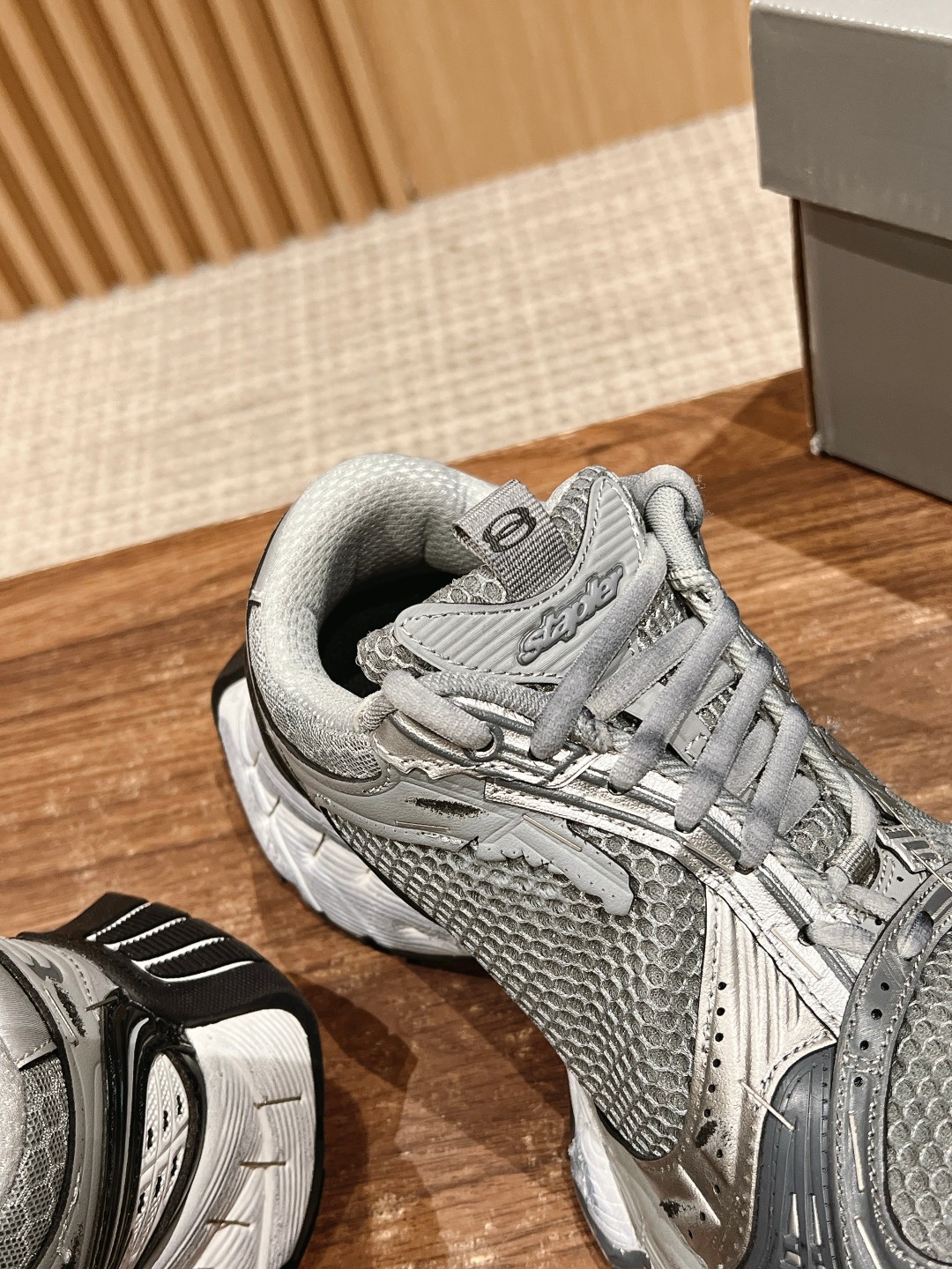 整体造型上接近 circuit,鞋头翘起来,工艺拼接上接近3xl。采用订书钉代替走线固定鞋身,或许这是订书钉和潮流单品最近的一次