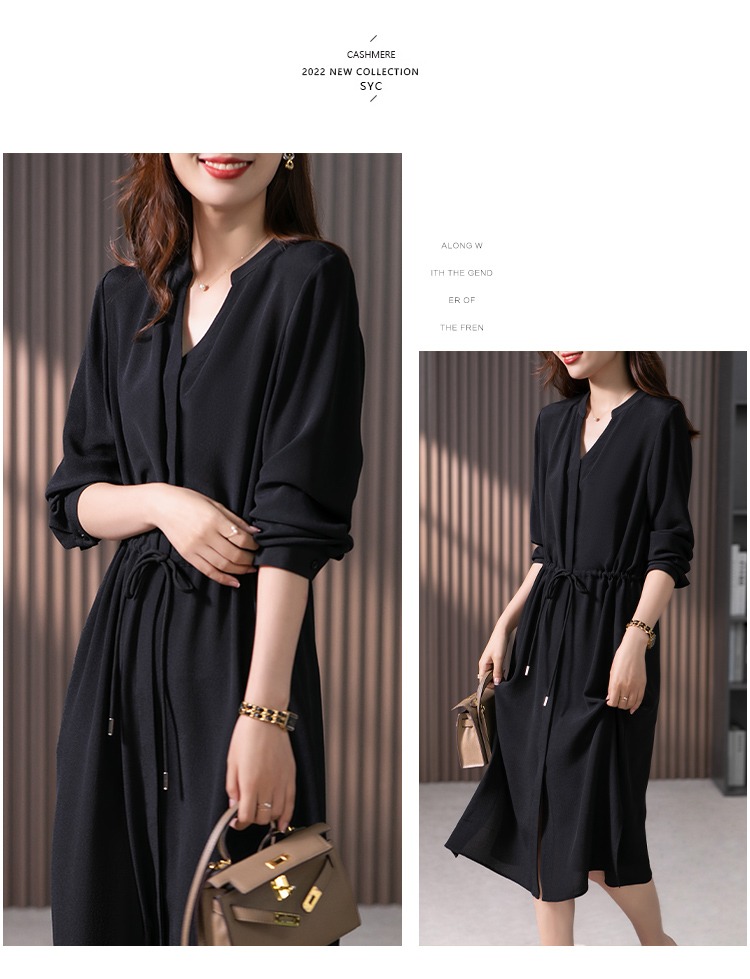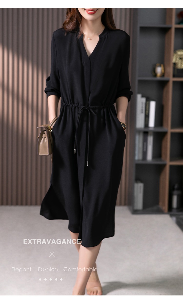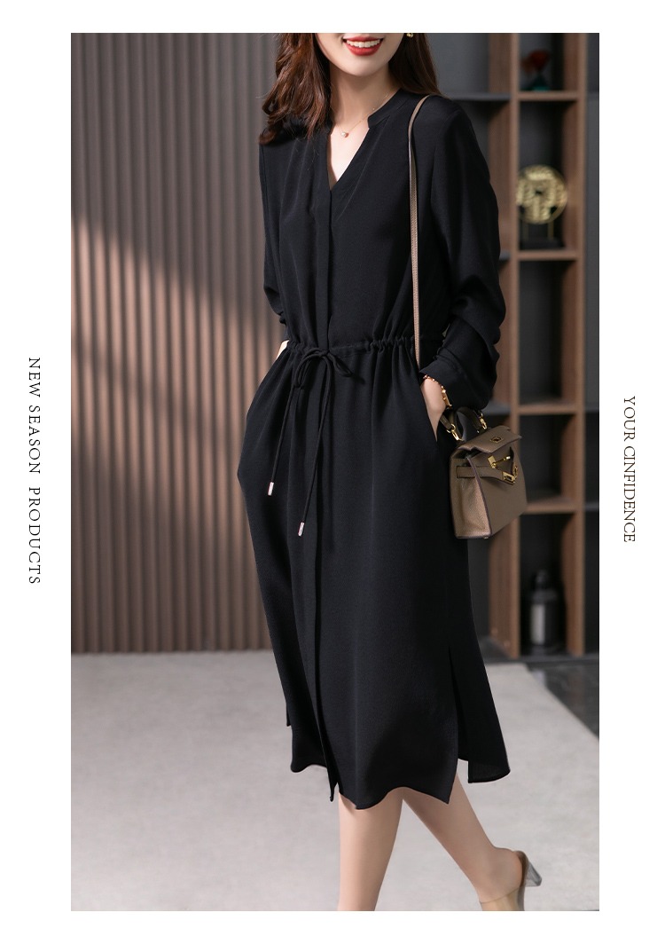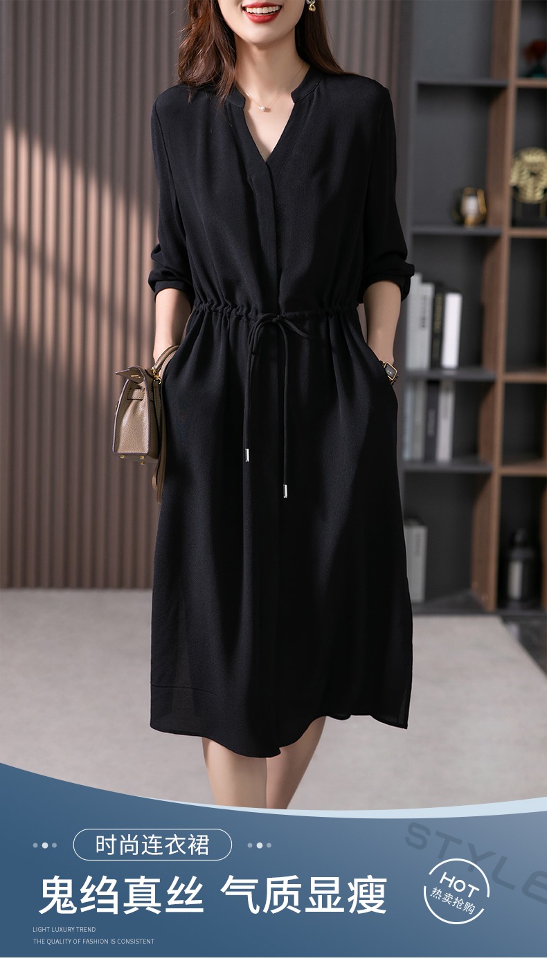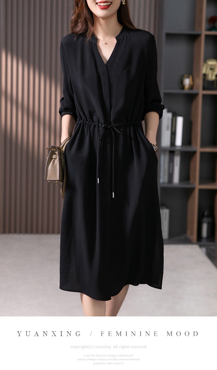 YX【现货7天】法式重磅鬼绉真丝连衣裙女2024秋季新款高级感桑蚕丝衬衫裙子