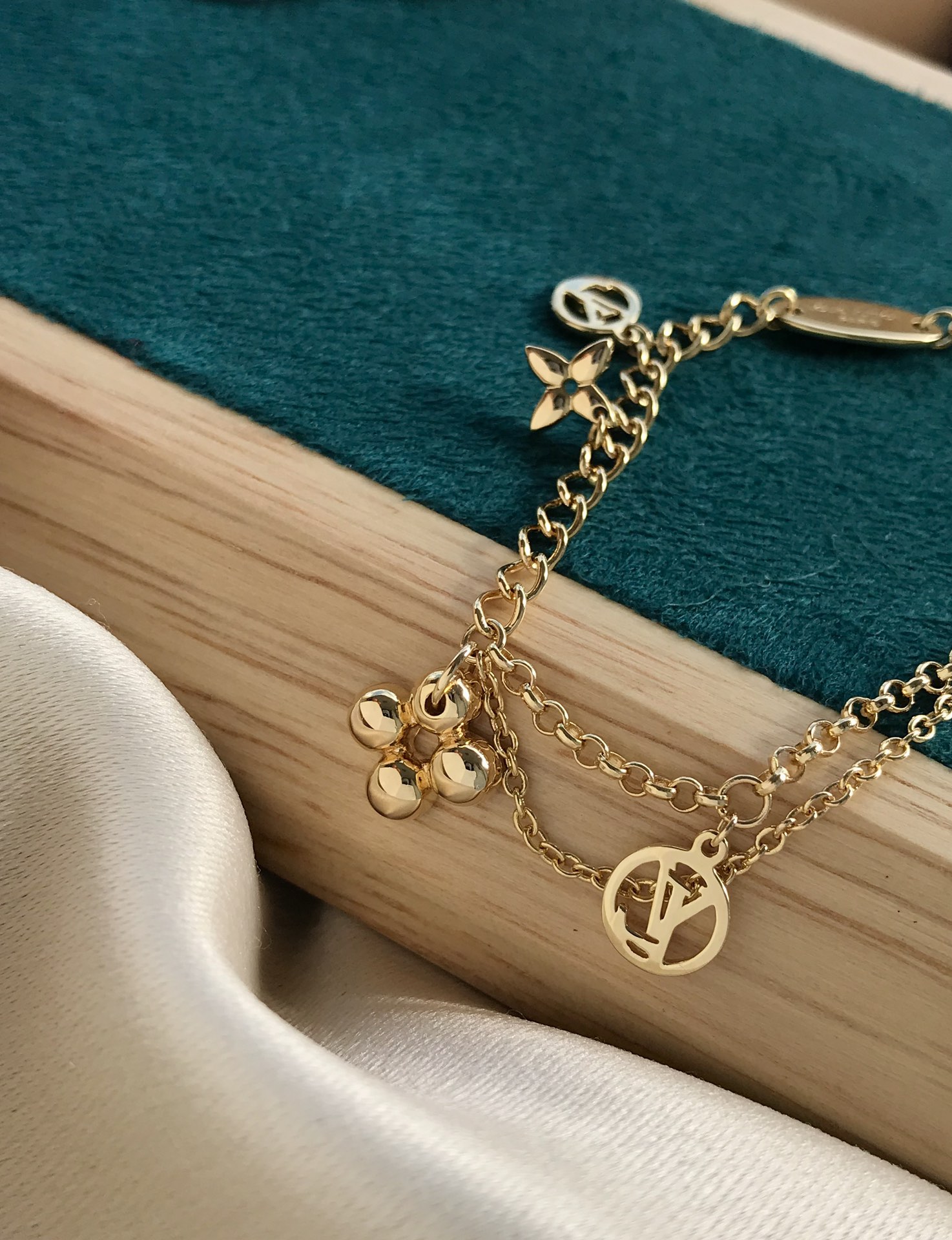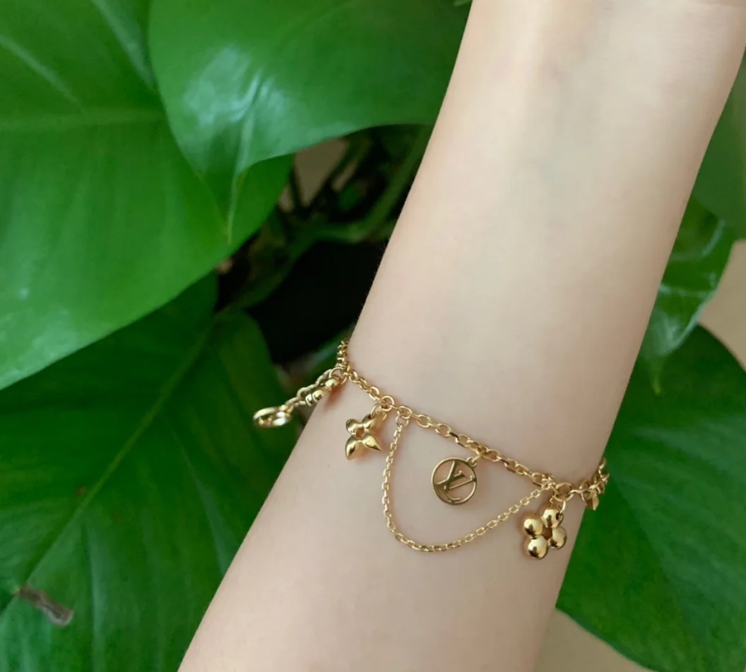Blooming系列手链,S925银材质打造,外层厚镀18K真金表层!整条手链有精美小吊坠,一眼种草,瞬间被俘获!此款风格优美的手链将成为时尚而优雅的腕间配饰!设计中融入Monogram花卉与圆形lv标志元素,经典而精致,没有钻石的闪耀,一样抵挡不住它的美丽✨ 每个小吊饰都有优美的弯曲曲面,立体感和质感都非常棒,戴起来刚刚好的温柔,一点不浮夸!金色显白,手链长度:17.5cm可随意调节!