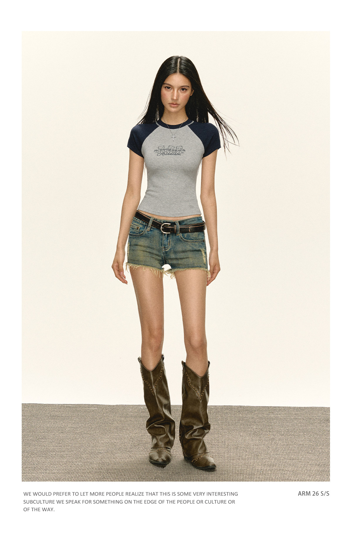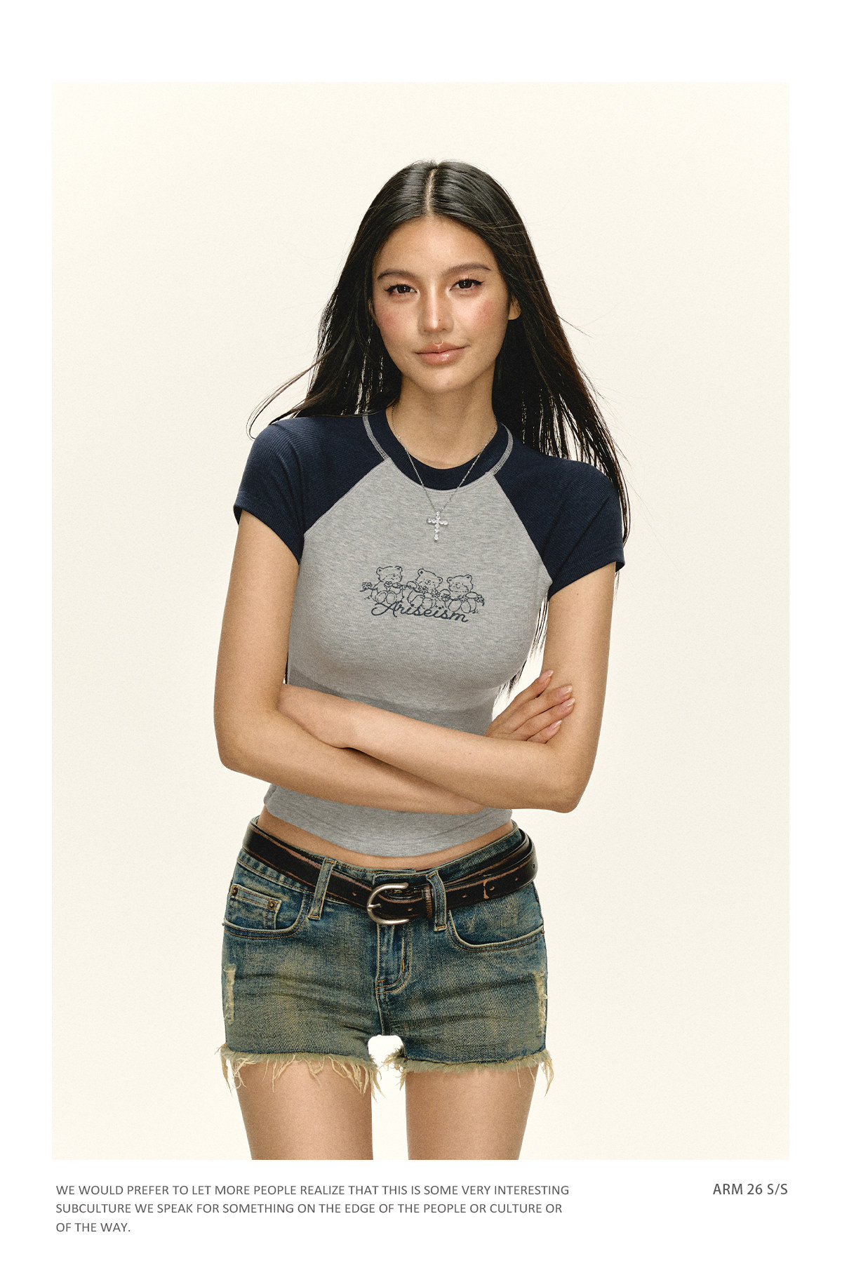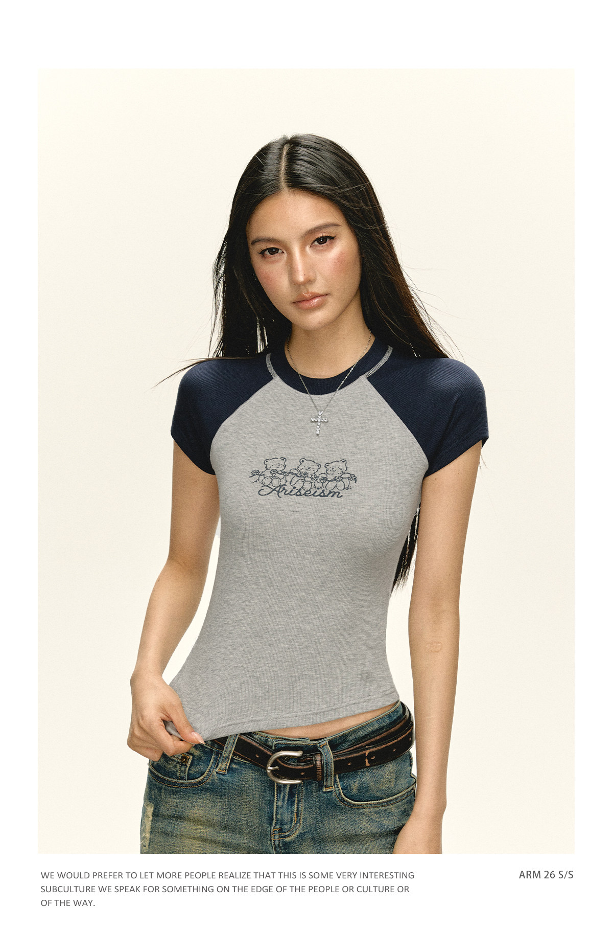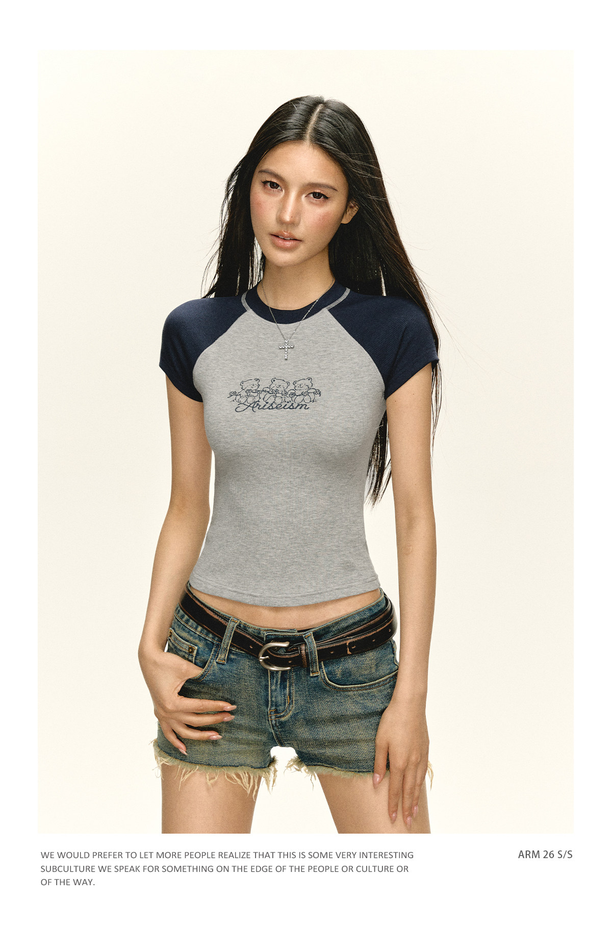 Ariseism 美式复古撞色插肩袖短袖T恤女夏季新款上衣
