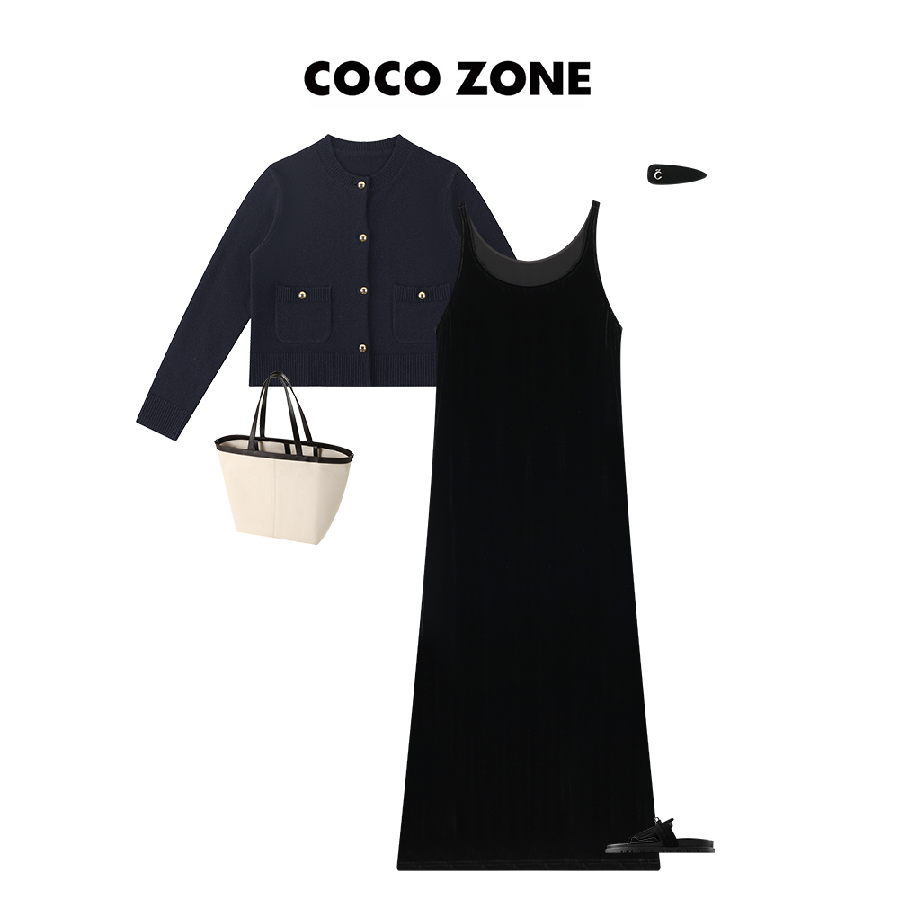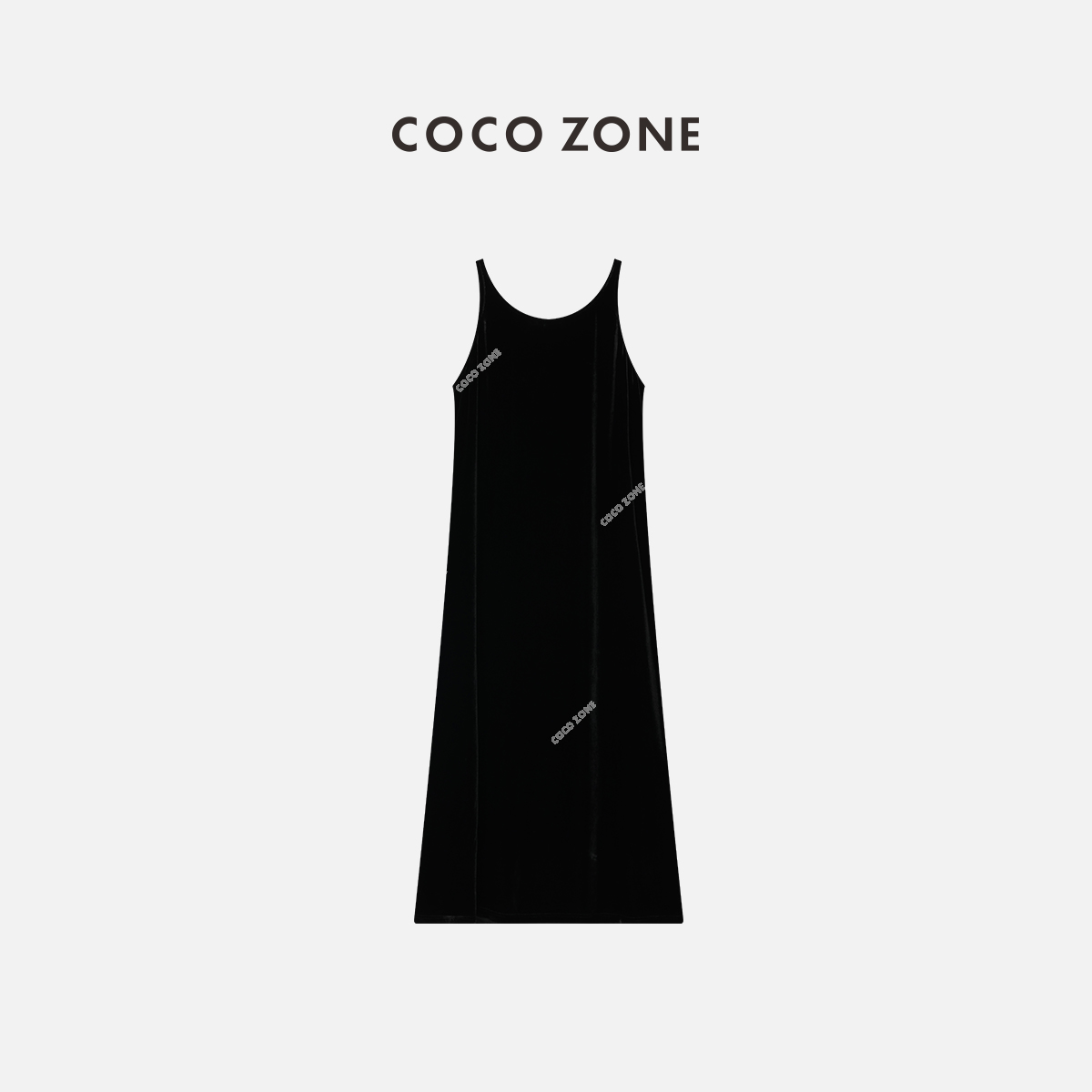 COCO ZONE100%桑蚕丝气质连衣裙丝绒吊带无袖长裙23C29500