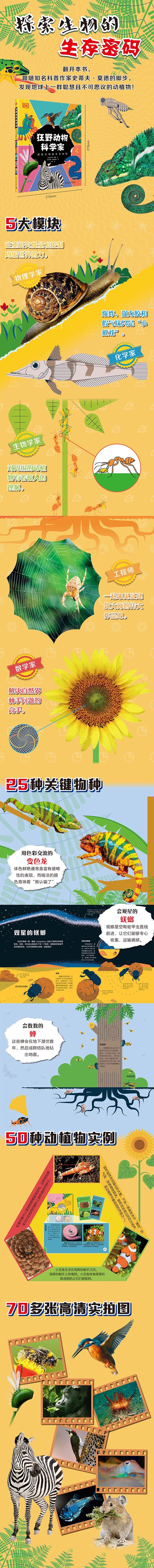 自然界里充满了许许多多巧妙解决技术问题的例子,有些很奇怪,有些甚至很可怕,但所有这些都是通过一个叫作“演化”的过程,历经数百万年的反复试验,才最终形成的。《狂野动物科学家》是一本不同寻常的自然科普图书,汇集了自然界中聪明的化学家、物理学家、生物学家、工程师和数学家。你知道动植物也会是科学家吗?不可思议吧!跟随本书,你将会了解动物们无与伦比的精密身体结构、如何做解决高难度难题,以及人类如何模仿动物,让“仿生学”这门学科大放异彩的。 本书详解25种关键物种,更延伸举例50种动植物实例。从建造水坝的海狸,到编织蛛网的蜘蛛……各种精彩的自然故事让小读者大开眼界。