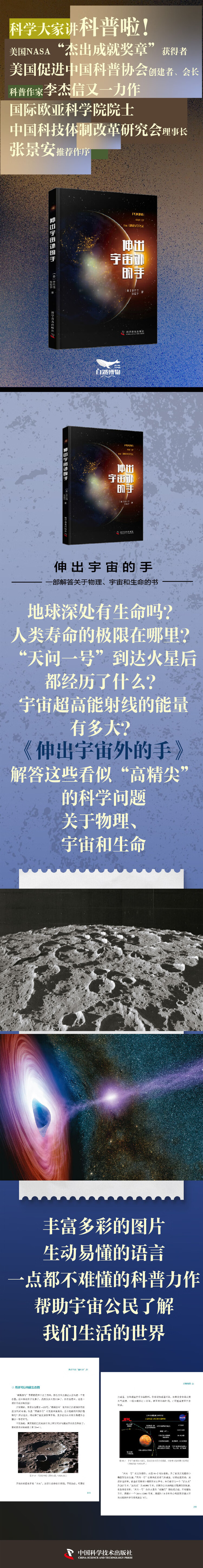 这是一本关于探索宇宙的科普图书,作者讲述了深空探测、量子纠缠通讯、光和时间的本质、爱因斯坦的相对论、宇宙观测、生命科学演进和我自身经历过的诸多科学突破事件等。该书不纠结于背后物理理论的清晰完整,只以解惑的大格局为主,讲大道理部分,点到为止。作者认为,现在的宇宙仍在继续膨胀,如果没有新的外力介入,宇宙空间将永远膨胀下去。我们既不能看到它的开始,又不能见证它的结束。宇宙,无始无终。对于我们的生命而言,定是从某一时间起始,又在某一时间终结。生命,作者试图通过此书,为读者解开太空和人类生存的神秘。