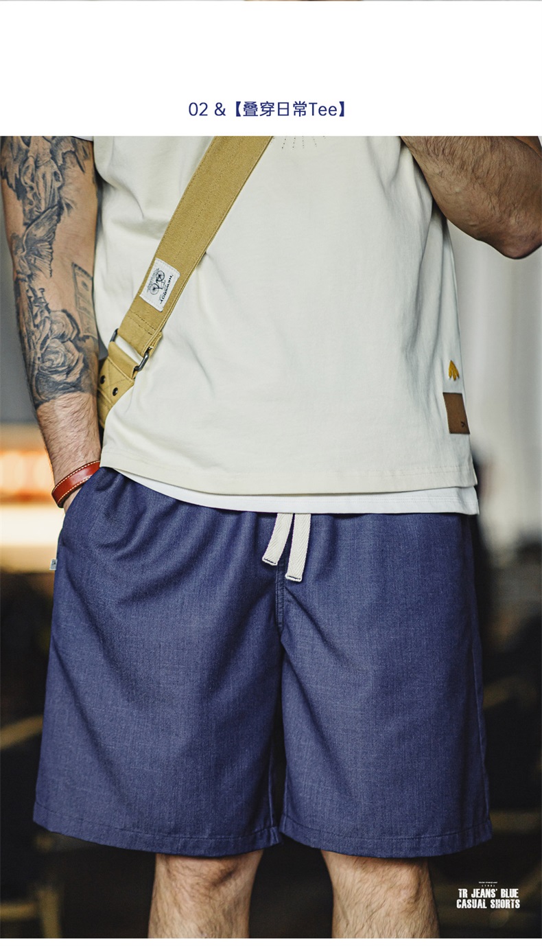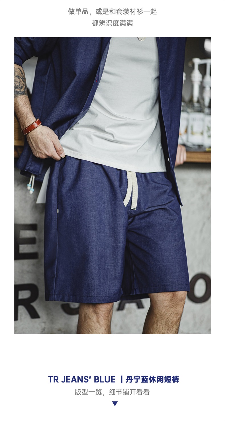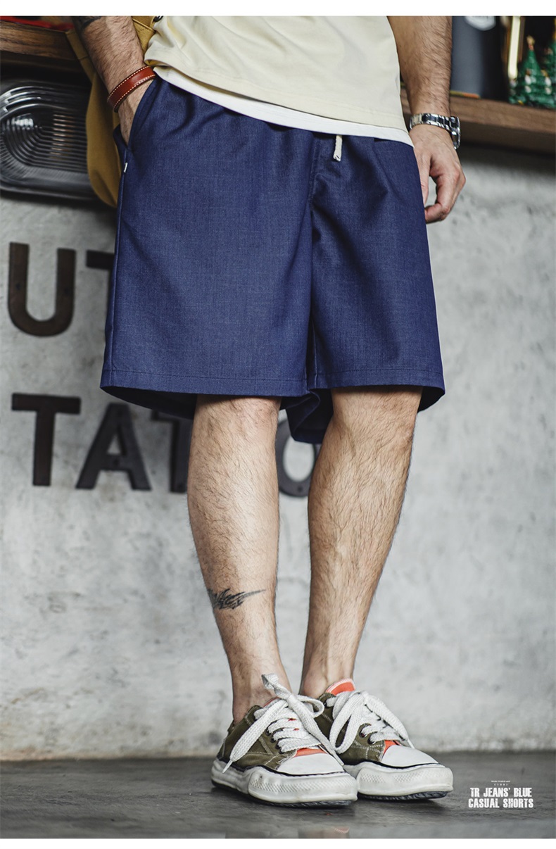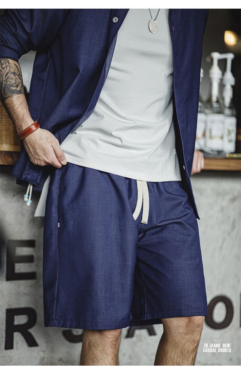 马登工装美式复古TR仿天丝牛仔短裤男夏季松紧腰抽绳宽松休闲五分裤