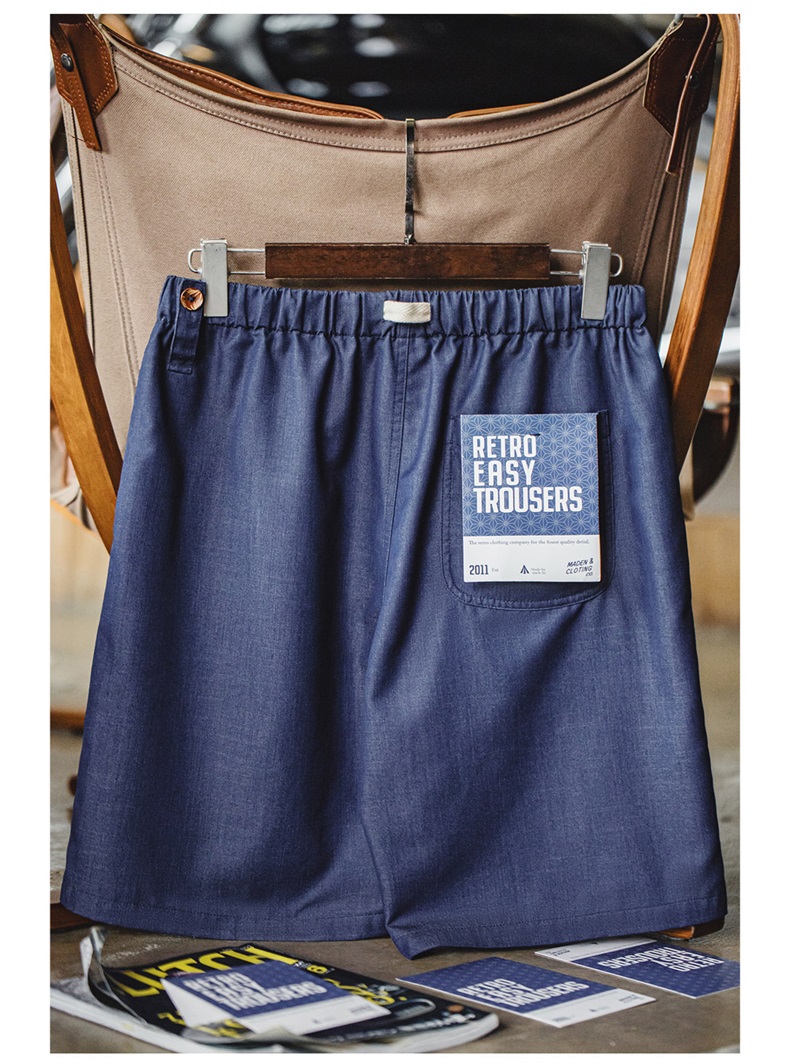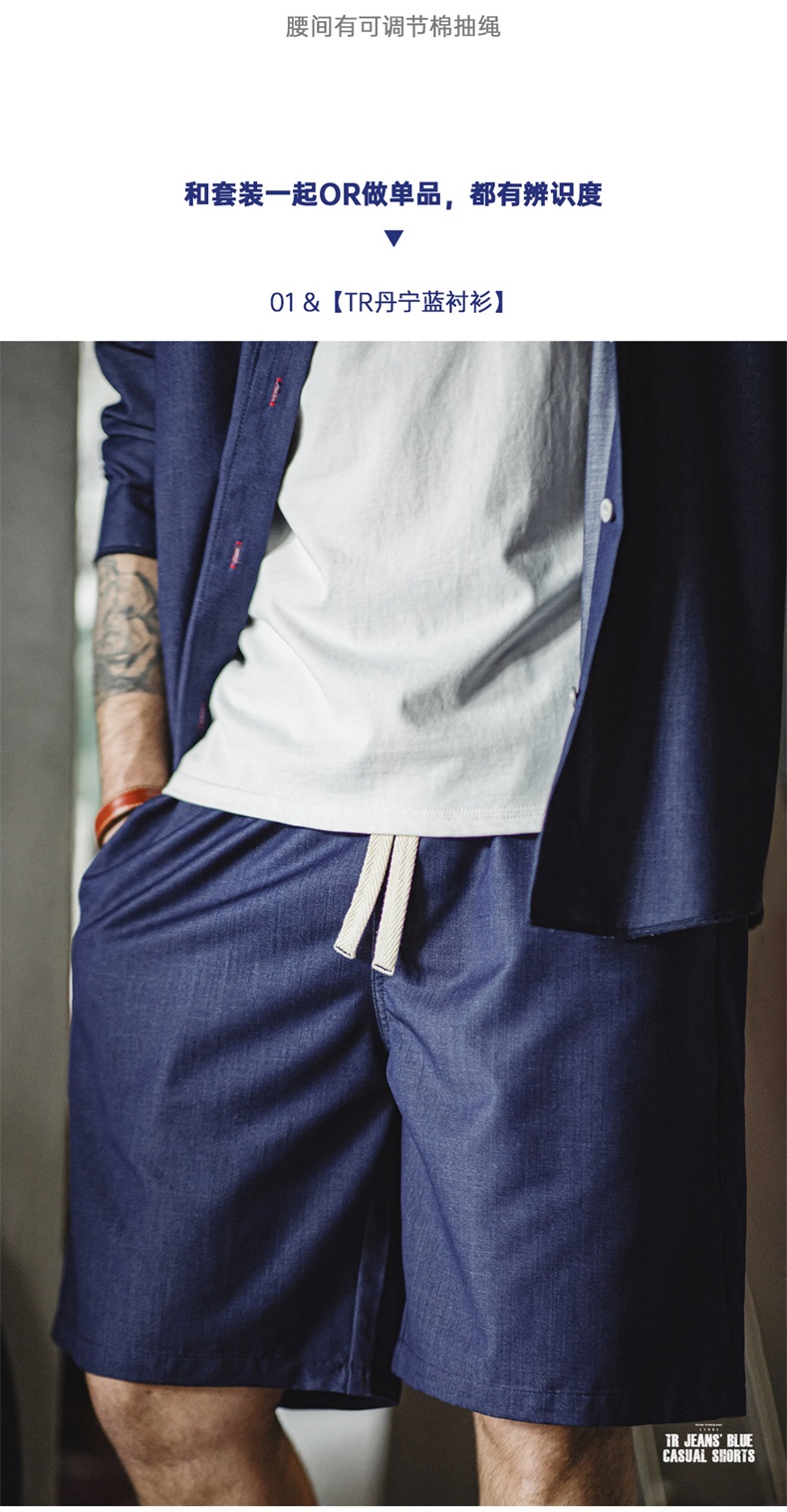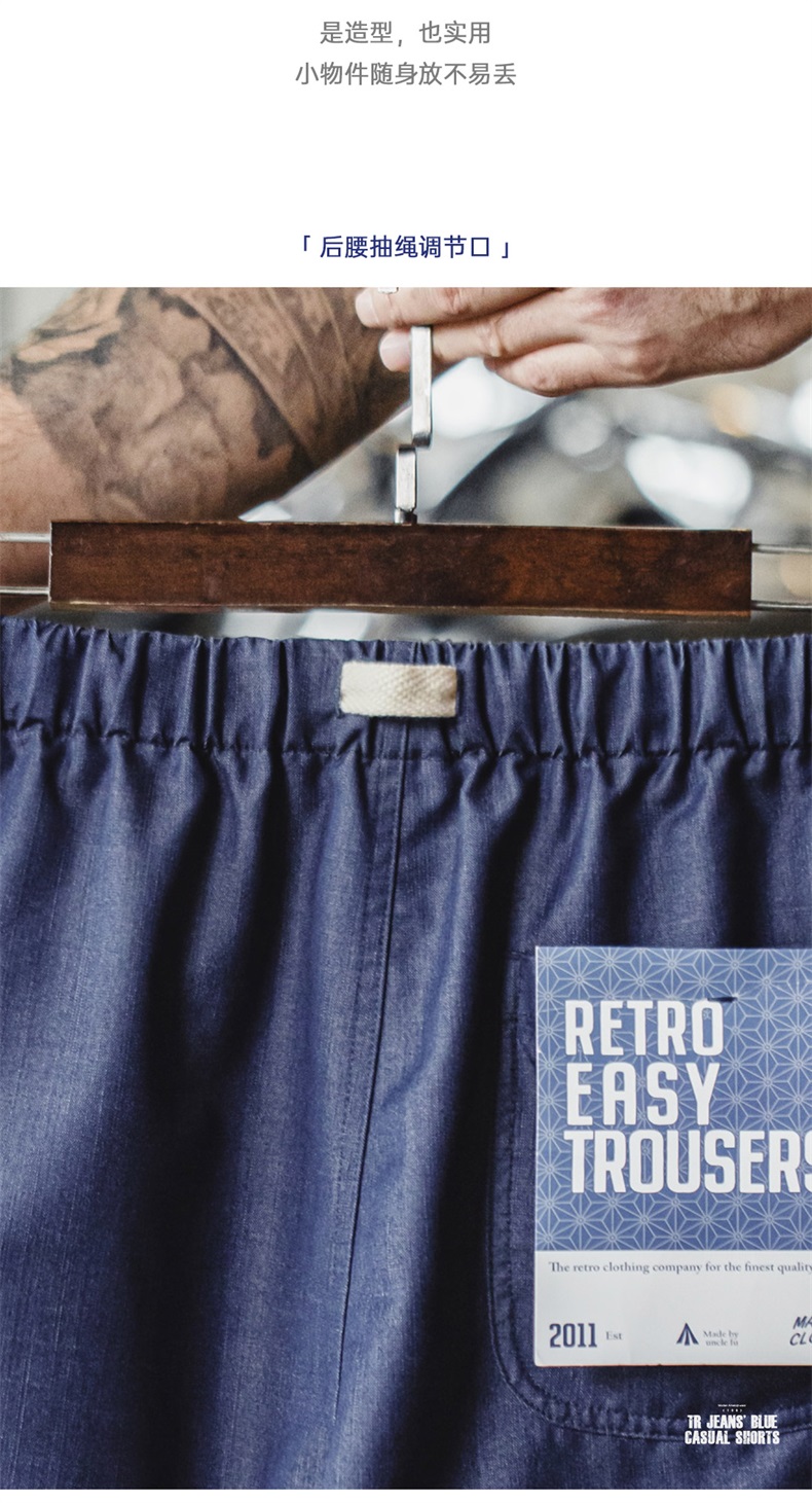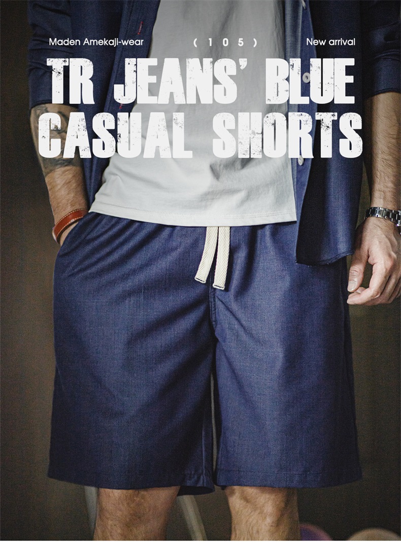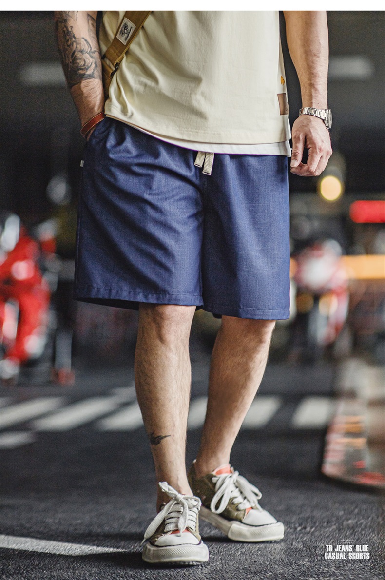 马登工装美式复古TR仿天丝牛仔短裤男夏季松紧腰抽绳宽松休闲五分裤