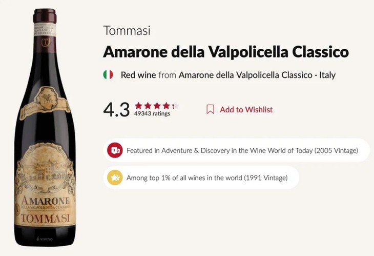Tommasi Amarone della Valpolicella Classico是酒庄引以为傲的代表作,也是让Tommasi成为全球著名Amarone酒庄的酒款。其长期占据酒评网站Vivino热门阿玛罗尼前沿,多达近5万个酒评,和高达4.3/5分的超高好评!(国外的大众评分,一般能高于4.0譬如零星,乃上乘好酒,比如拉菲正牌才4.6,小拉菲仅4.4分)