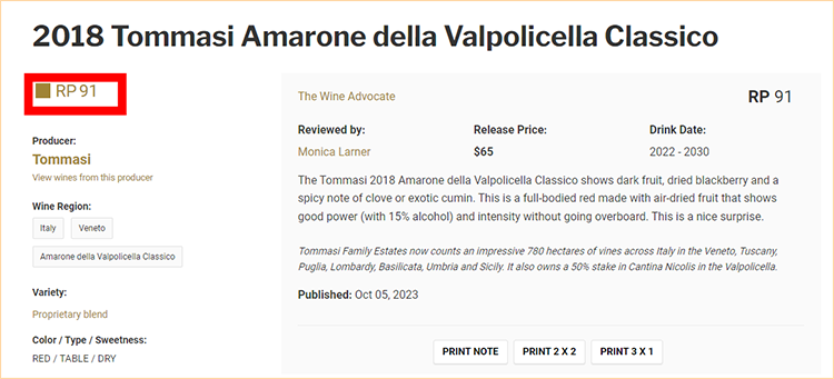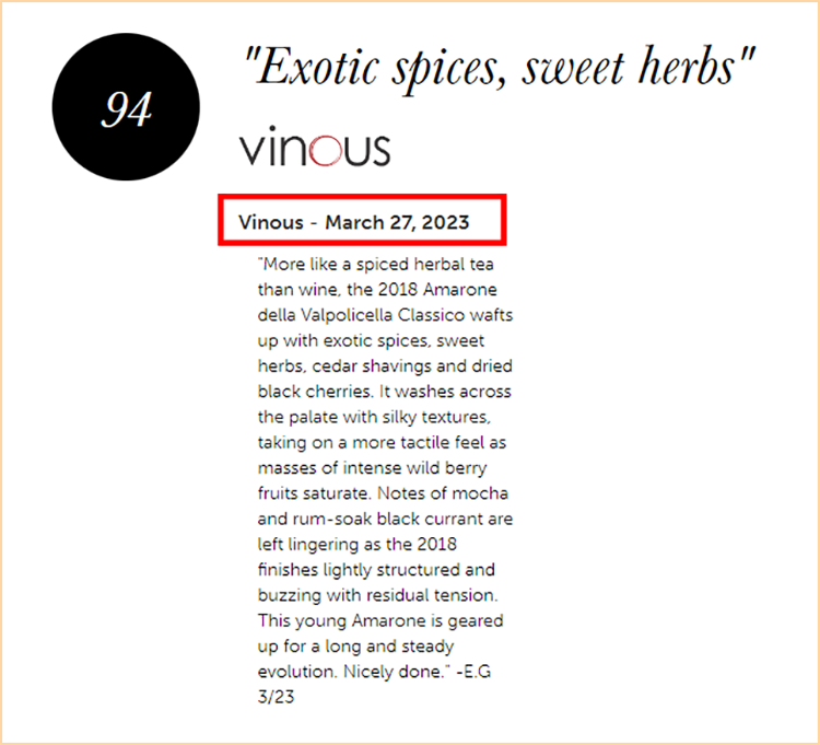“浓郁浆果、黑莓干、橙子、黑巧克力和泥土的芳香,口感醇厚、细腻、结构紧密、平衡极佳,且具备良好的陈年潜力。悠长美味,同时内敛,教科书级的阿玛罗尼,清新美味,浓郁优雅。”