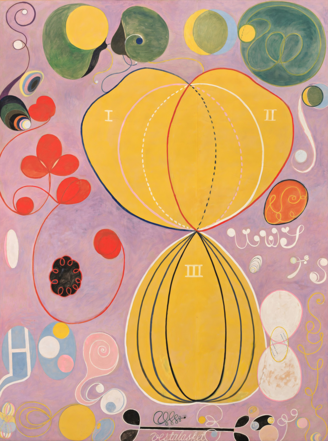 这套“三八节礼”的主视觉,我们选用瑞典艺术家希尔玛·阿夫·克林特的《组画四,十大,第7号,成年期》。这位早于康定斯基近十年的抽象艺术先驱,以对称卵形、流动线条、交织的文字与植物,勾勒出女性生命内在的成熟与力量。克林特的作品始终关注二元平衡,正如女性在“照亮他人”与“完整自我”之间的平衡坚持。
