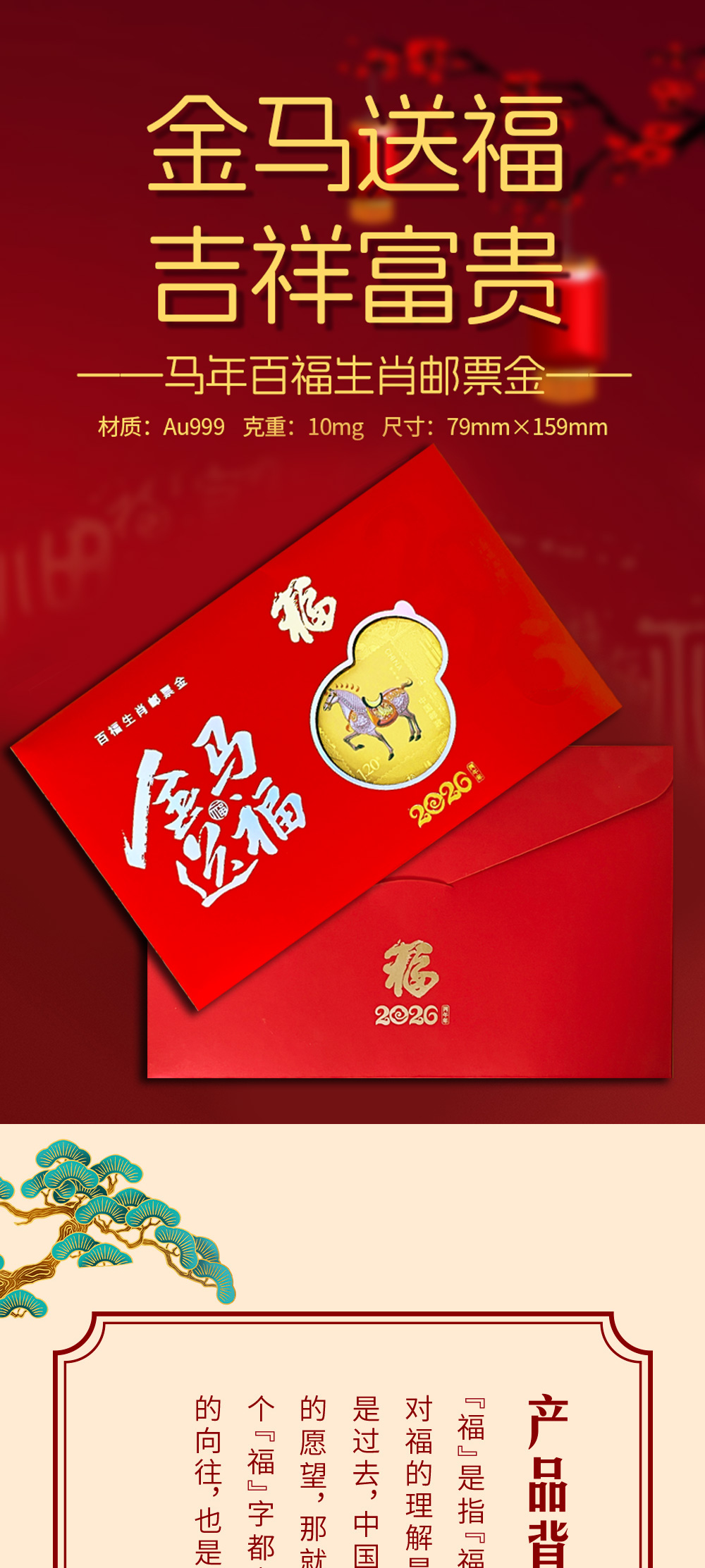 “中国集邮官方发行”2026金马送福 马年百福生肖邮票金 含10mg999足金