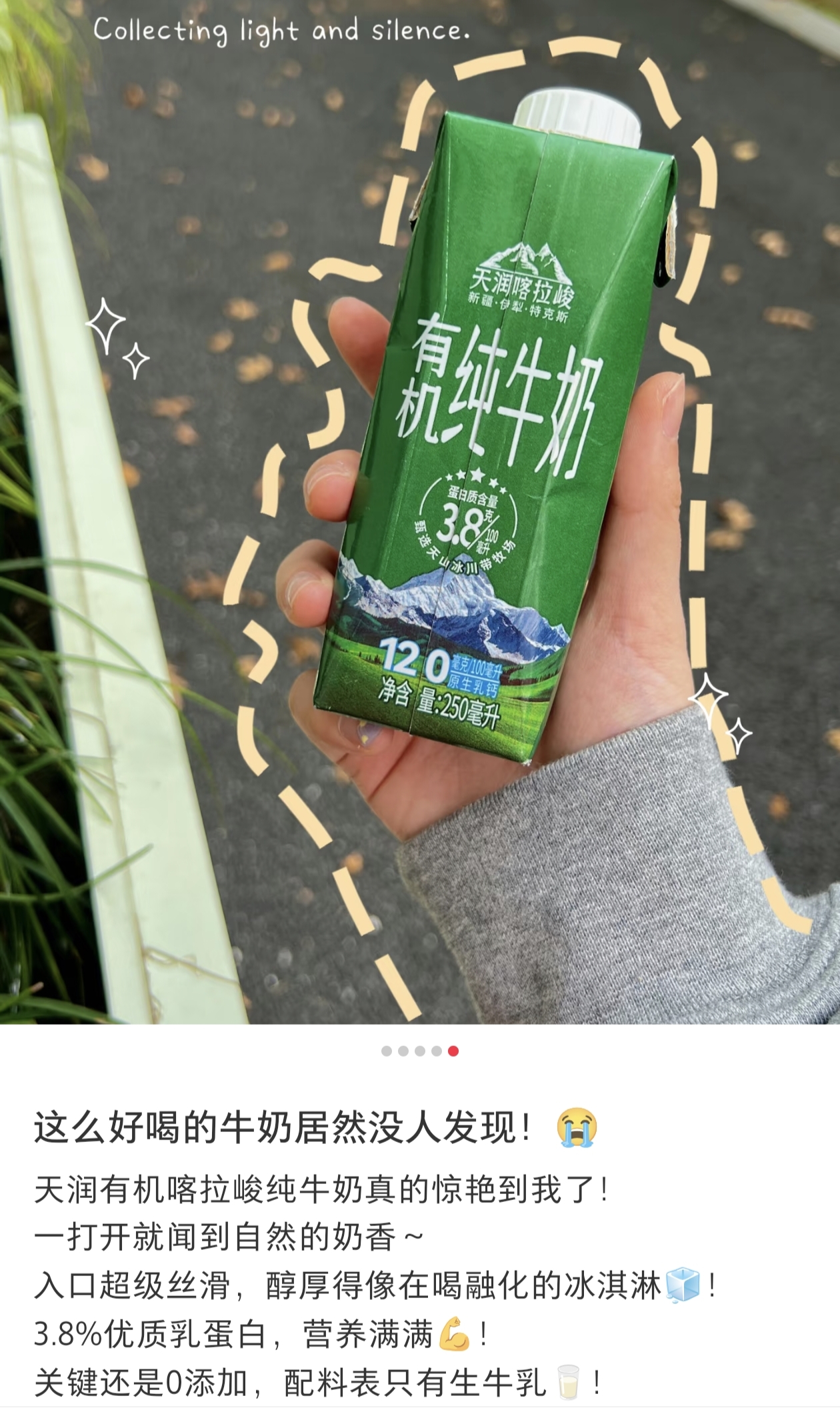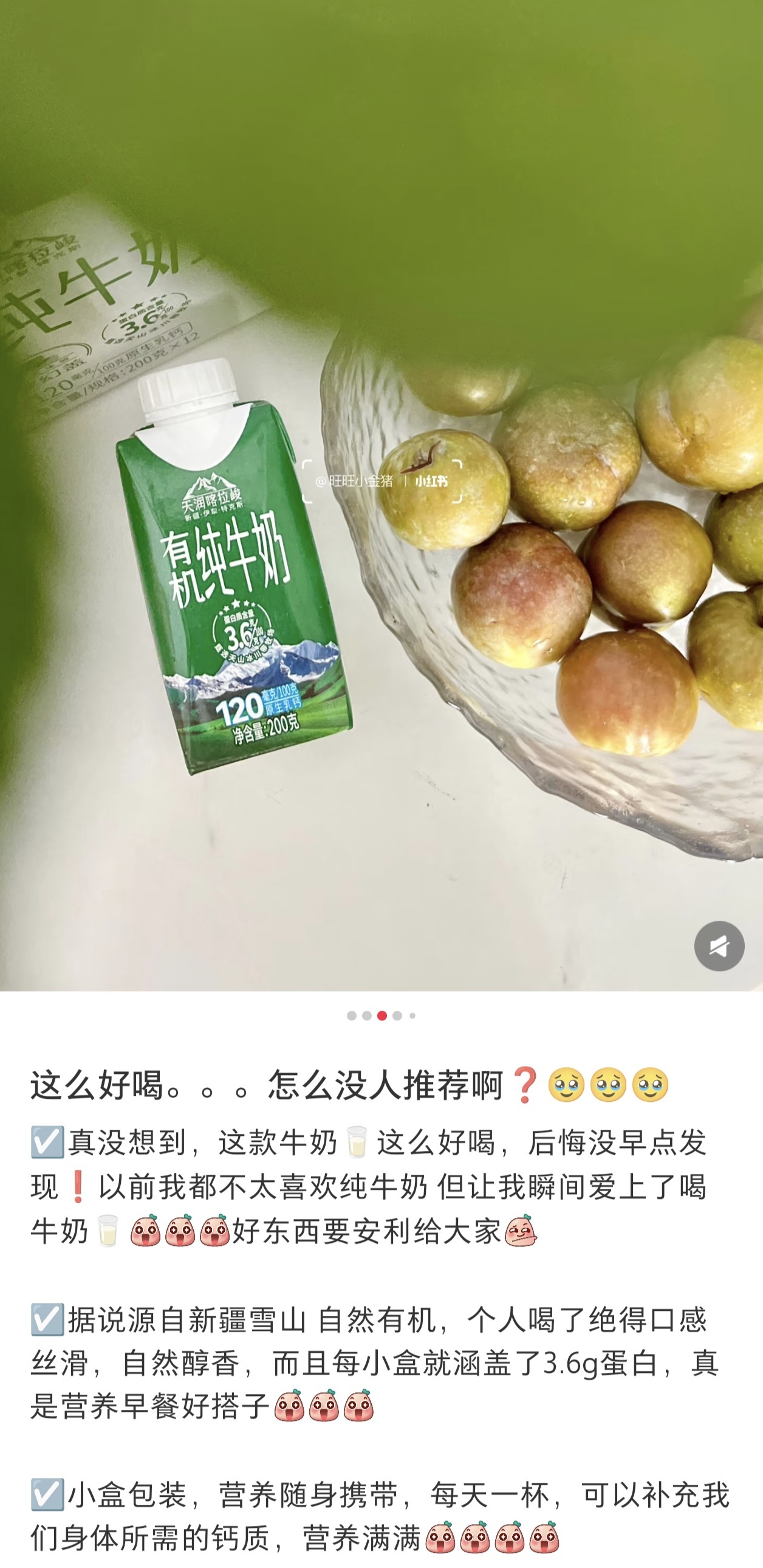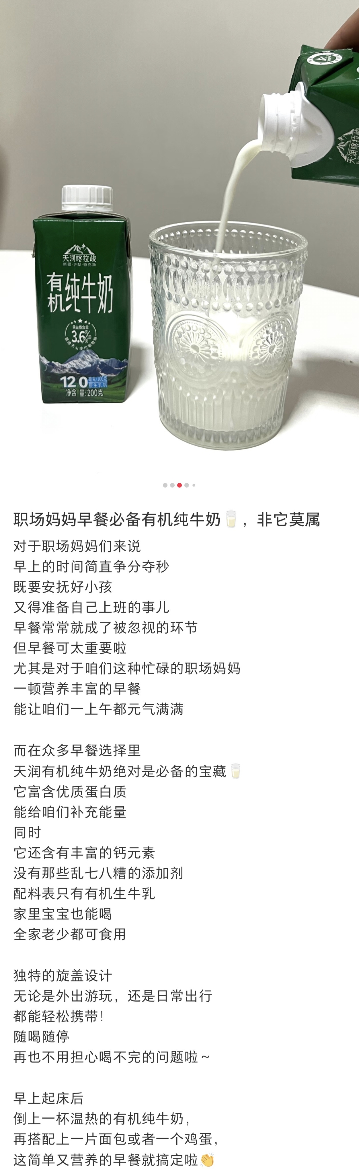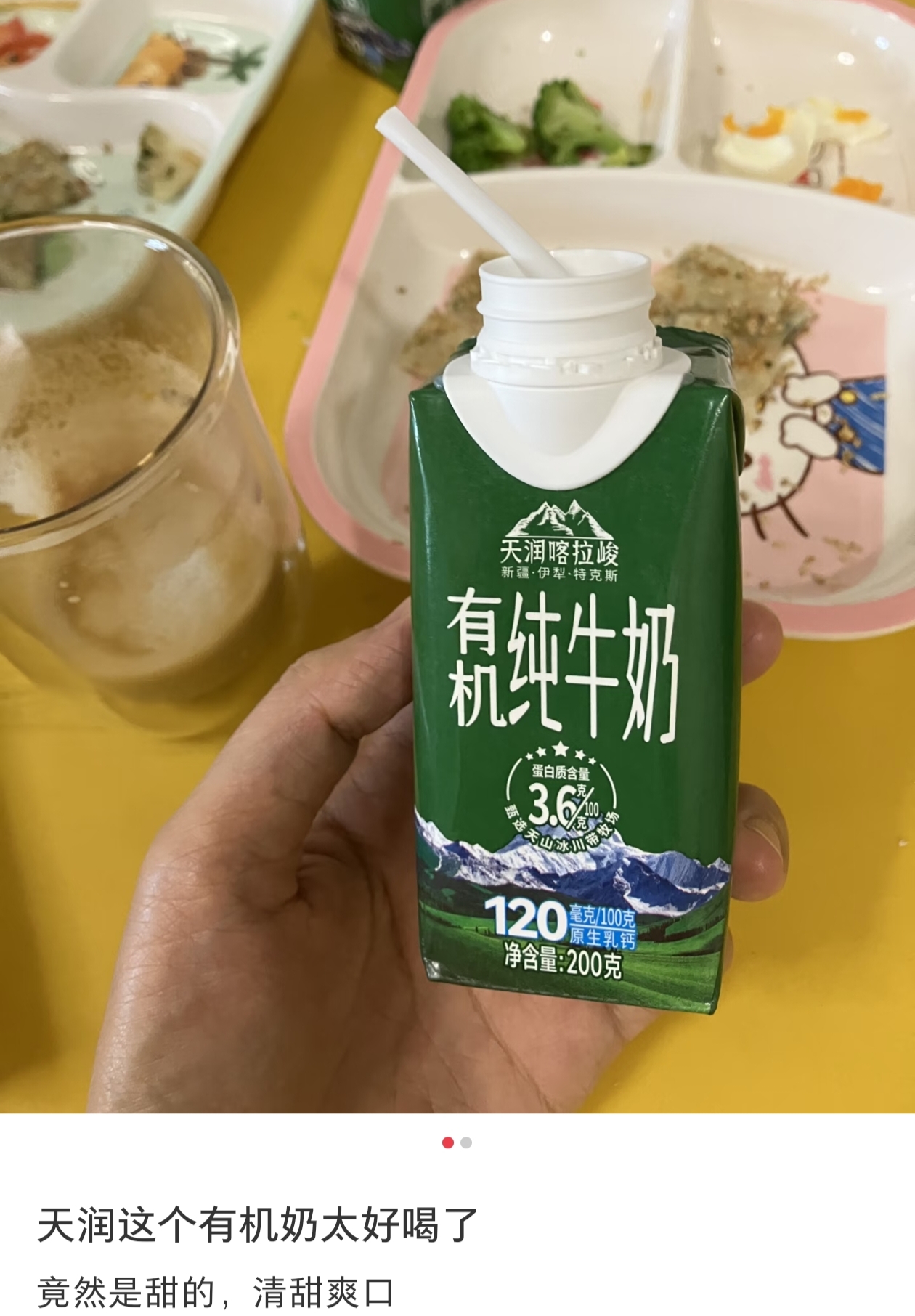 喀拉峻有机纯牛奶是利乐盖包装,250毫升,即开即饮,超方便的!直接单喝,就能品尝到最纯粹的奶香味,醇厚顺滑,搭配咖啡更是绝配,浓浓香香,还有微微的甜,口感上非常加分!如果对奶的品质要求比较高,那就选它!