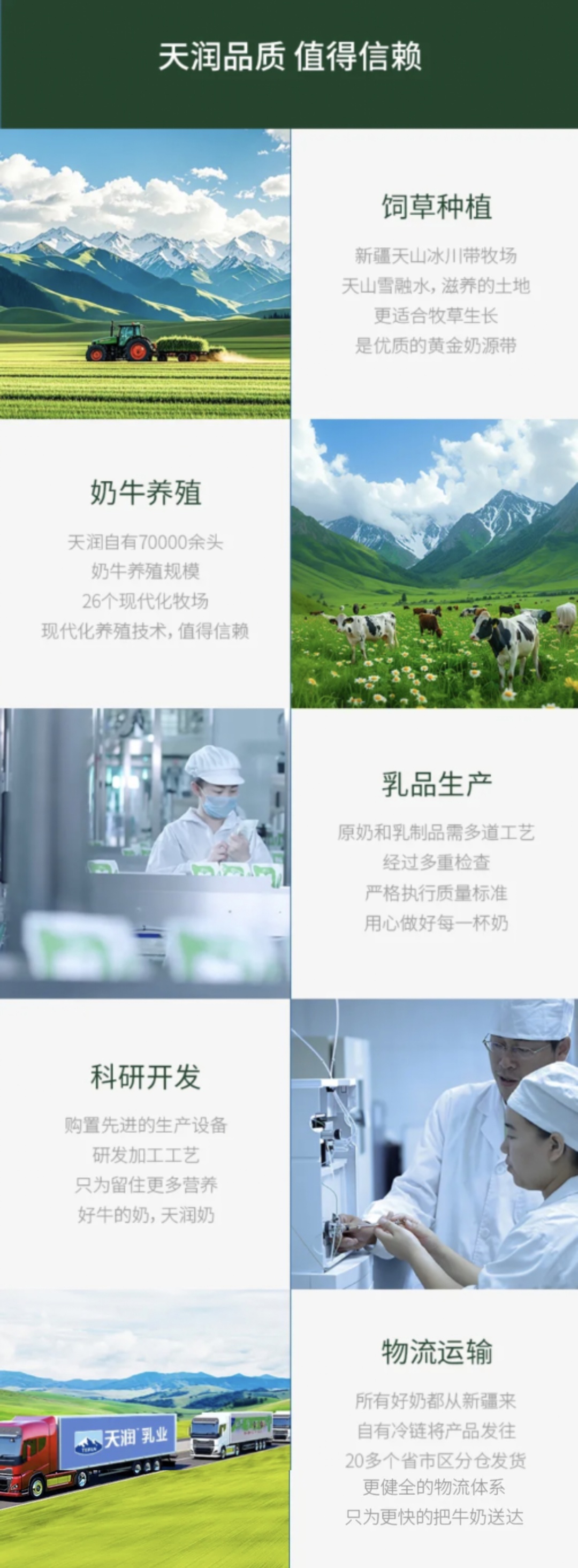 天润乳业作为新疆生产建设兵团第十二师控股的上市公司,2002年成立、2013年上市,是中国奶业20强、农业产业化国家重点龙头企业,更是新疆液态奶产销量最大的企业。公司搭建起“牧业养殖-乳业加工-市场销售”完整全产业链,拥有46000头进口荷斯坦奶牛、天山南北18个牧场,从牧草种植到乳品生产,从科研开发到冷链物流,每一环都严格把控,产品出厂合格率及市场抽检合格率均达100%,用硬核实力守护每一滴奶的品质。