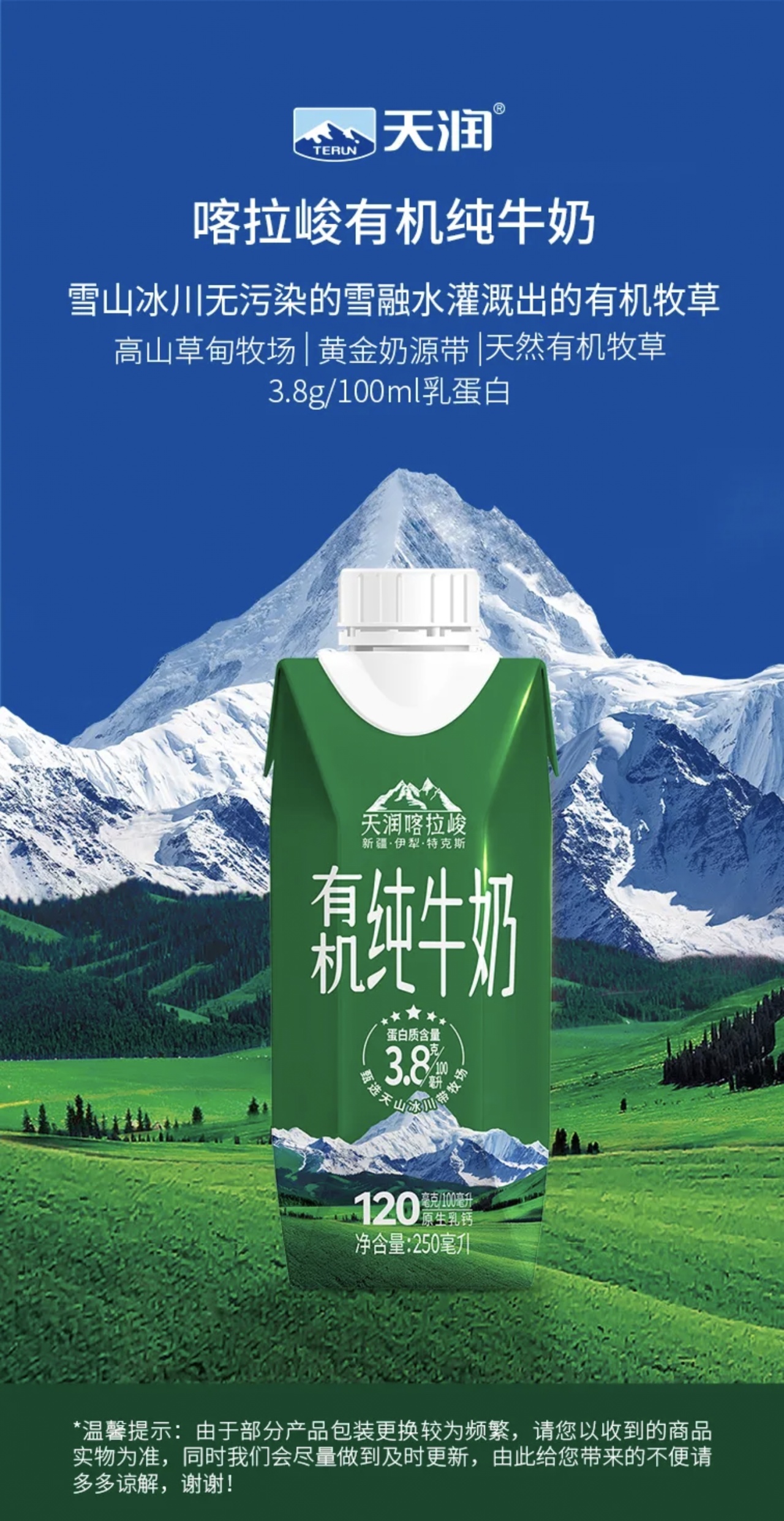 喀拉峻有机纯牛奶,产地得天独厚,它来自新疆伊犁特克斯喀拉峻,地处北纬45°黄金奶源带,最高海拔达3600米,高山草甸牧场坐拥年均3700小时长日照,天然弱碱性土壤搭配雪山冰川无污染的雪融水,孕育出优质的有机牧草,为奶源奠定了绝佳的自然基础;品控层层严苛,从饲草种植、奶牛养殖到乳品生产,全链条遵循现代化标准,原奶经过多道工艺和多重检查,新鲜与品质全程守护。