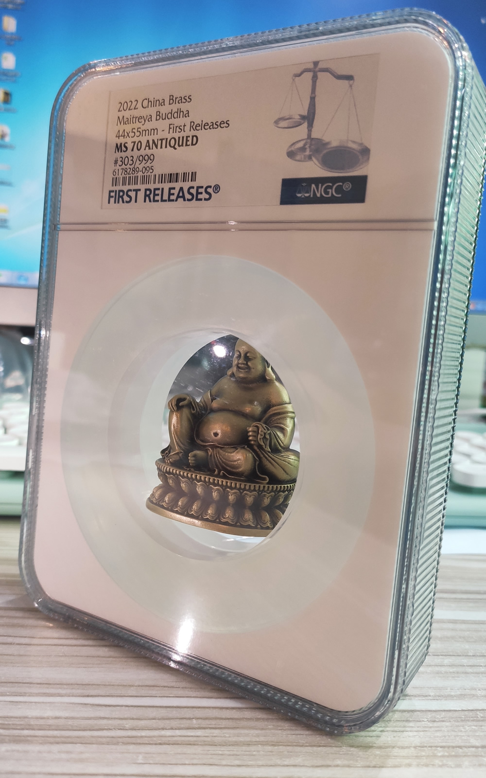 这尊弥勒佛的佛牌,是由评级币的权威品牌NGC鉴定封装的,且品相完美(评级打出了NGC的满分70,没有比这更好的了!)