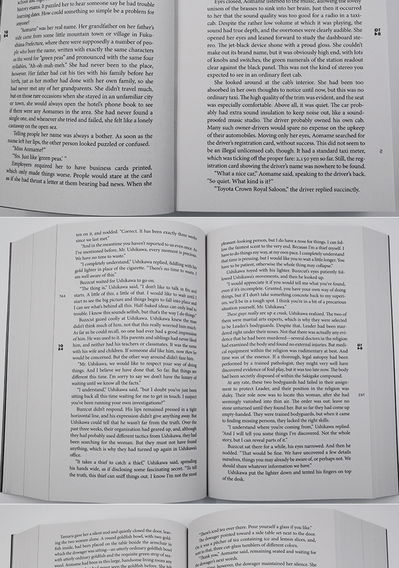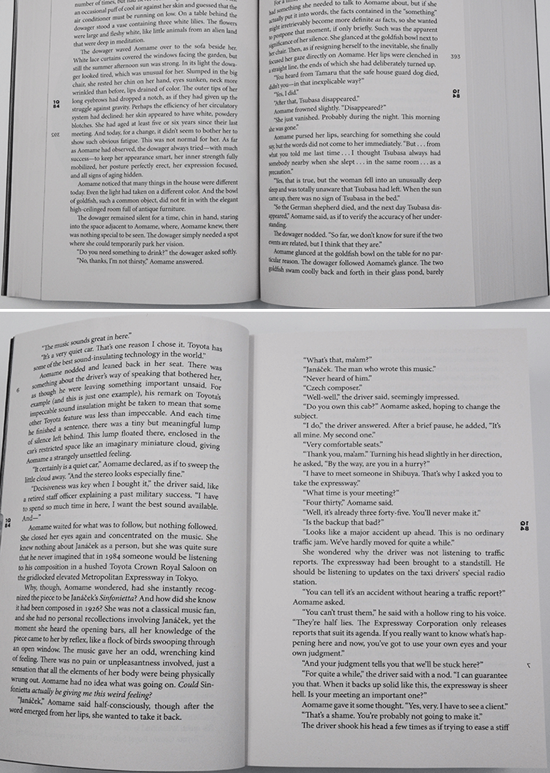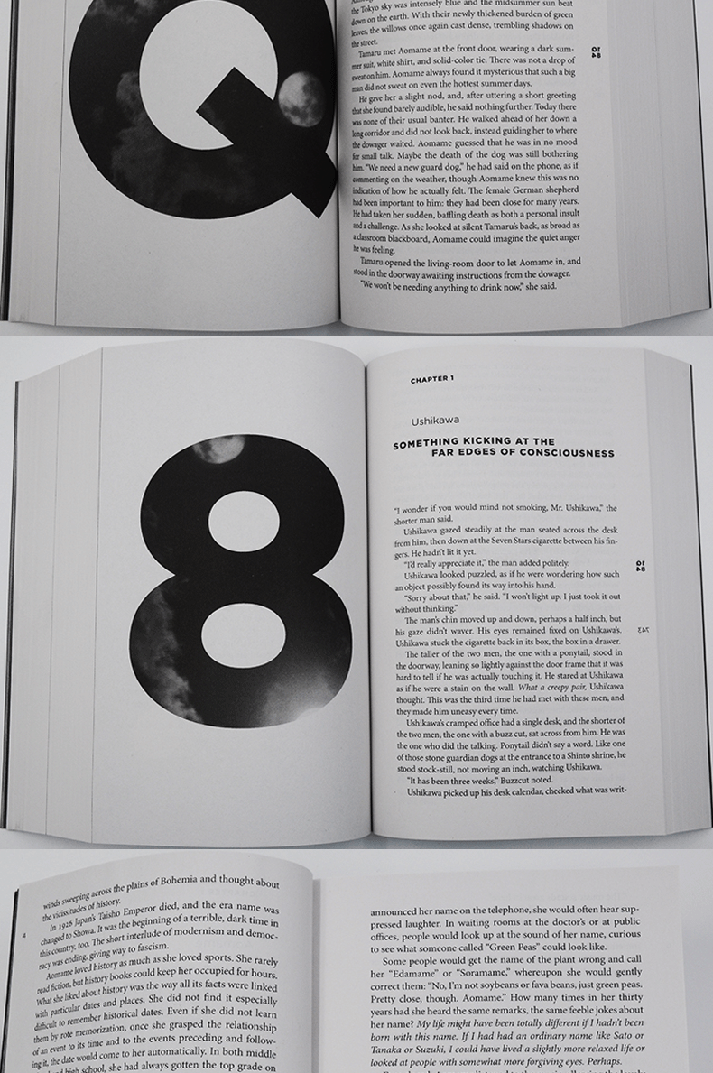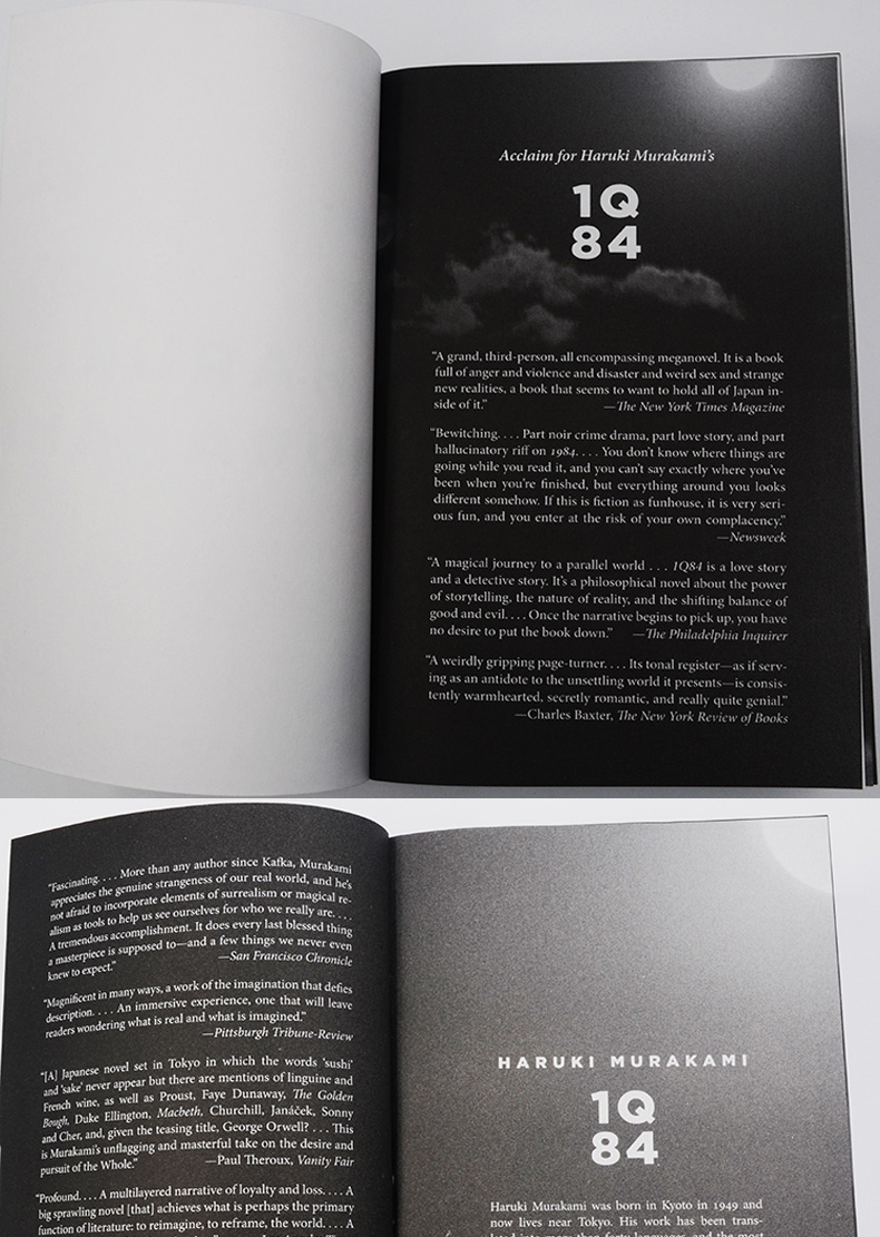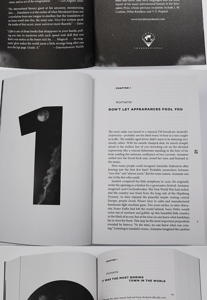 《1Q84》文本分为三卷:Book1(4月—6月)、Book2(7月—9月)、Book3(10月—12月),分别有24章、24章、31章。文本以主角“青豆”和“天吾”的视角叙述,Book 1与Book 2采用双线、Book 3添加了牛河以三线平行结构进行推进,围绕邪教团体进行描述。故事讲述男主人公“天吾”与女主人公“青豆”在“小小人”所营造出的“未知的Q世界”相遇的故事。男女主人公经历了不幸的童年,其他登场人物成为暴力的牺牲品。虐童、宗教狂与暴力等,如空气之“蛹”,无孔不入地贯穿于人的存在空间——这便是主人公存在于斯、挣扎不已的、被称为1Q84的残酷青春。 The year is 1984 and the city is Tokyo. A young woman named Aomame follows a taxi driver’s enigmatic suggestion and begins to notice puzzling discrepancies in the world around her. She has entered, she realizes, a parallel existence, which she calls 1Q84 —“Q is for ‘question mark.’ A world that bears a question.” Meanwhile, an aspiring writer named Tengo takes on a suspect ghostwriting project. He becomes so wrapped up with the work and its unusual author that, soon, his previously placid life begins to come unraveled. As Aomame’s and Tengo’s narratives converge over the course of this single year, we learn of the profound and tangled connections that bind them ever closer: a beautiful, dyslexic teenage girl with a unique vision; a mysterious religious cult that instigated a shoot-out with the metropolitan police; a reclusive, wealthy dowager who runs a shelter for abused women; a hideously ugly private investigator; a mild-mannered yet ruthlessly efficient bodyguard; and a peculiarly insistent television-fee collector. A love story, a mystery, a fantasy, a novel of self-discovery, a dystopia to rival George Orwell’s—1Q84 is Haruki Murakami’s most ambitious undertaking yet: an instant best seller in his native Japan, and a tremendous feat of imagination from one of our most revered contemporary writers.
