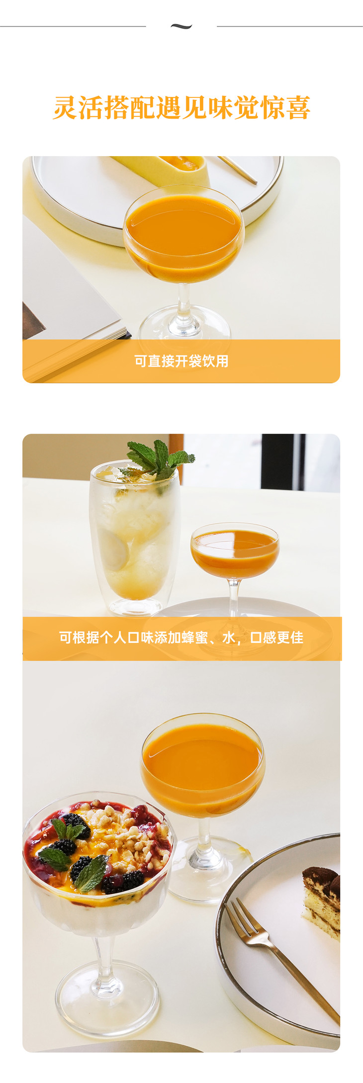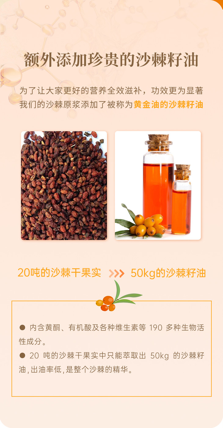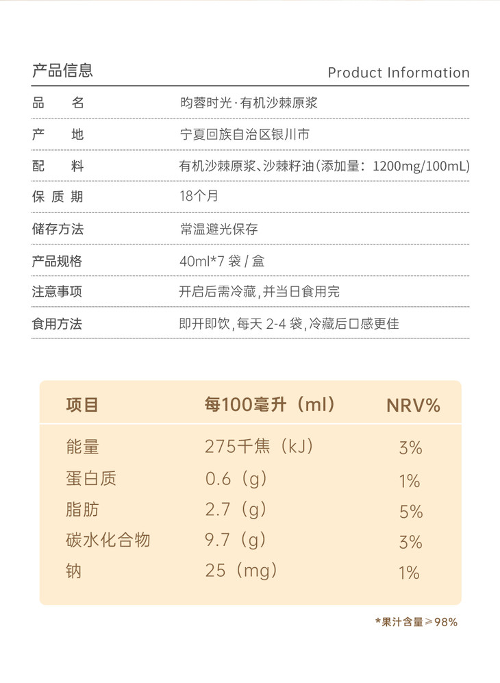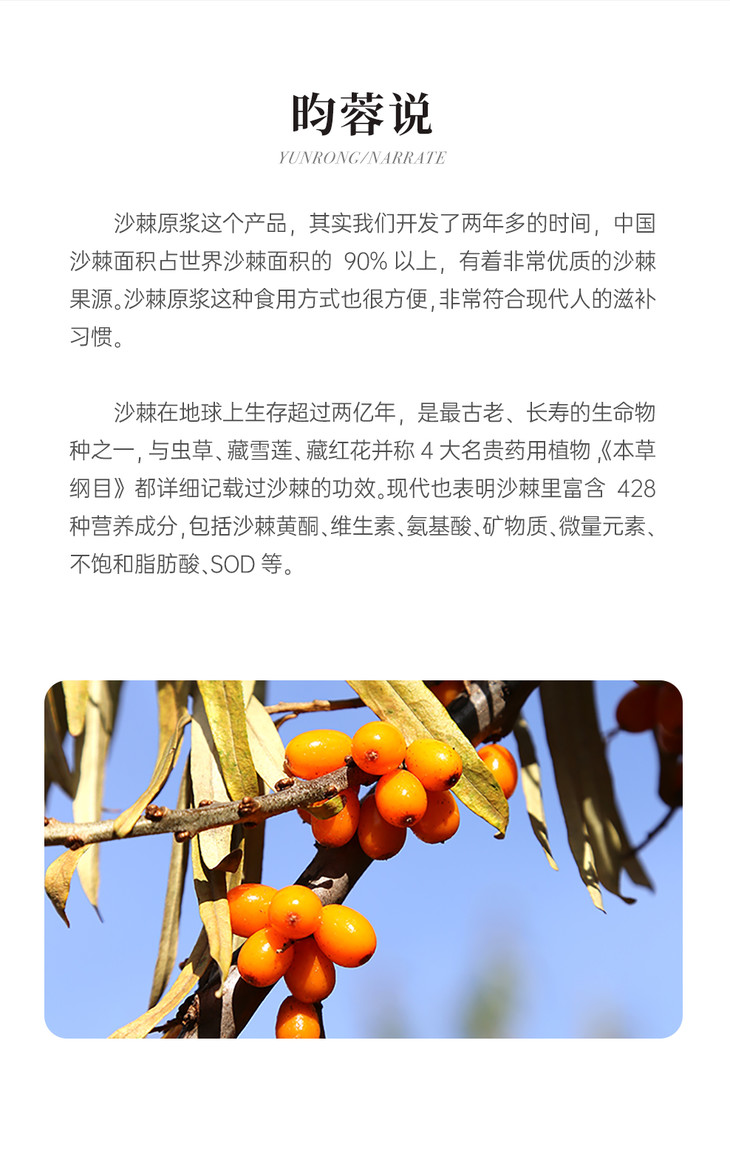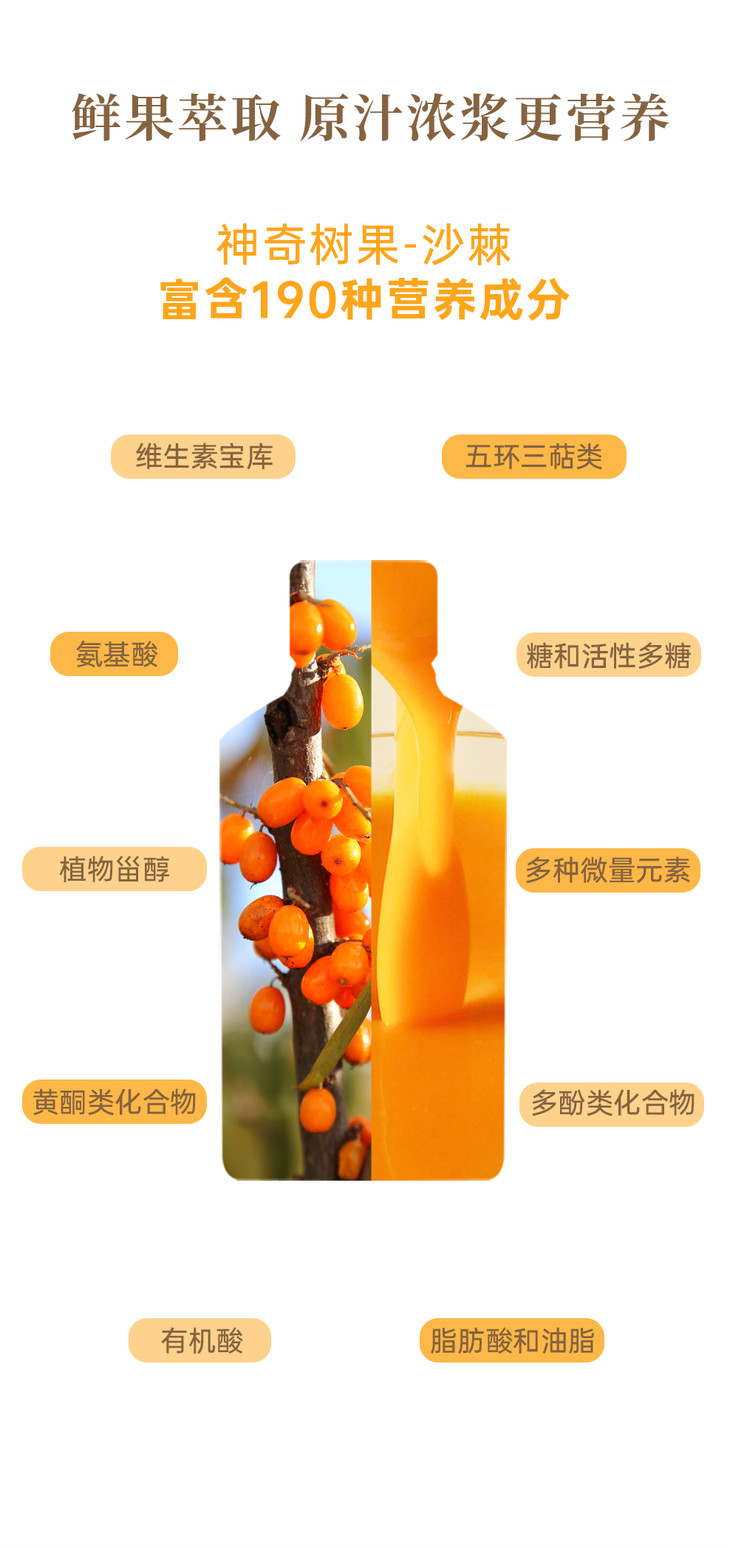 【昀蓉 ·有机沙棘原浆礼盒】 · 维生素宝库 ·鲜果萃取 · 不加一滴水 ·不加一点糖 · 独有工艺去除沙棘酸涩的口感 · 入口更顺滑(40ml/7袋/盒)
