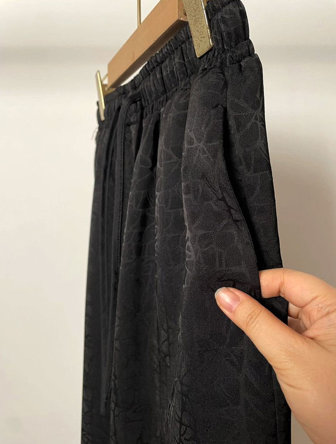 这条裤子因为底胚布主要以桑蚕丝为主,辅以10%用醋酸纤维面料,有丝绸一般的光泽和手感,穿上腿上滑溜溜的,而且垂坠感特别好好,走起路来就像带风一般。