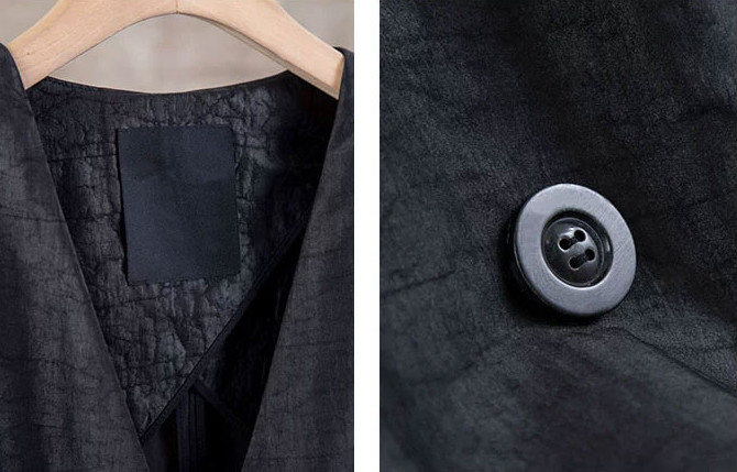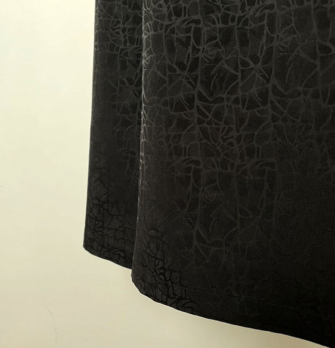 布面经过香云纱工艺处理,表面带有高级感满满的自然褶皱感,触感丝滑,有光泽,处处透露着复古华丽时髦感。