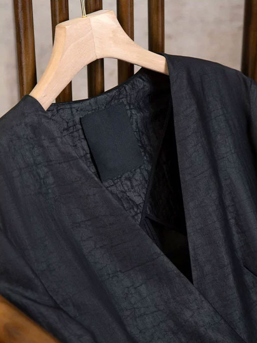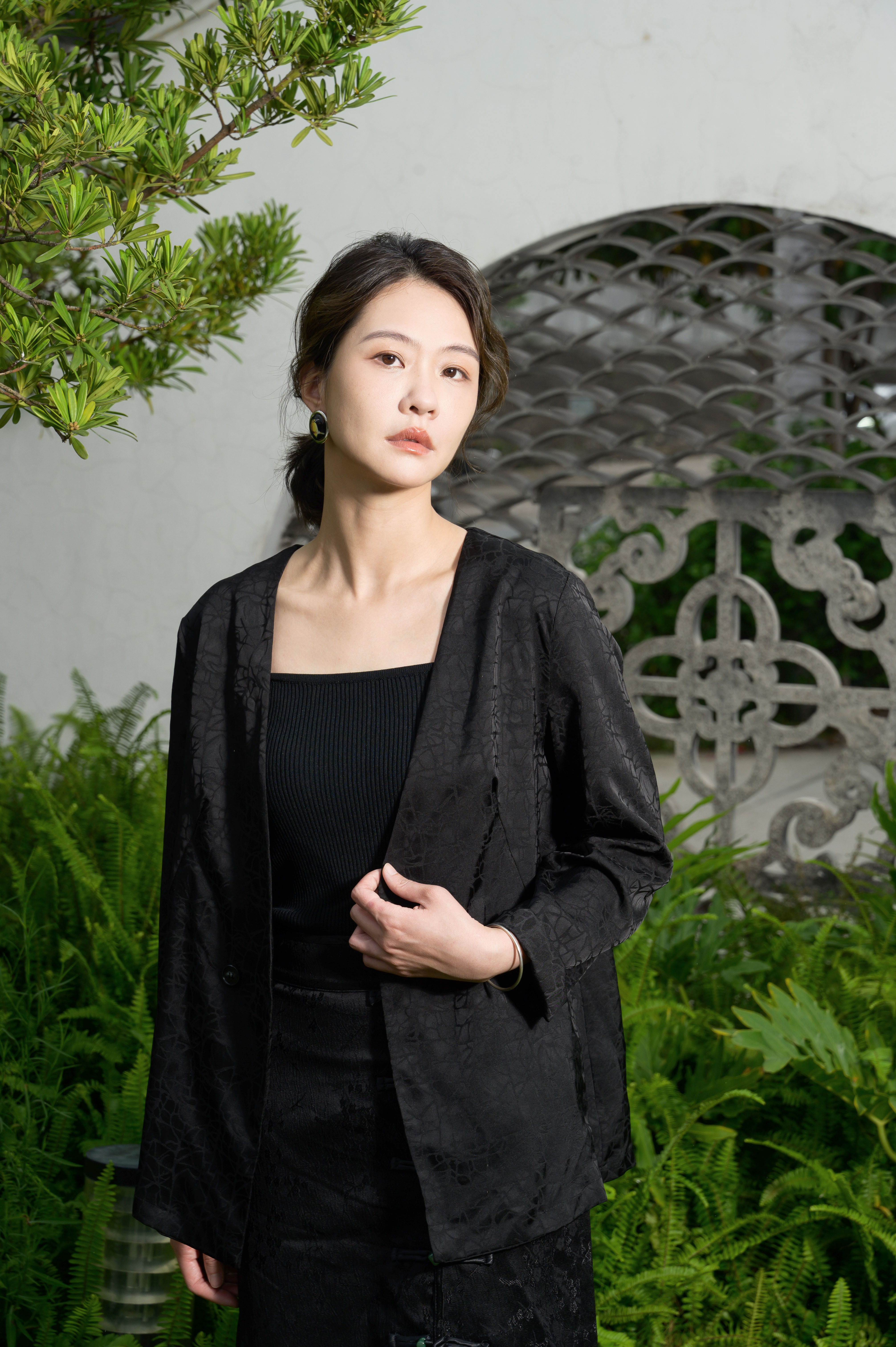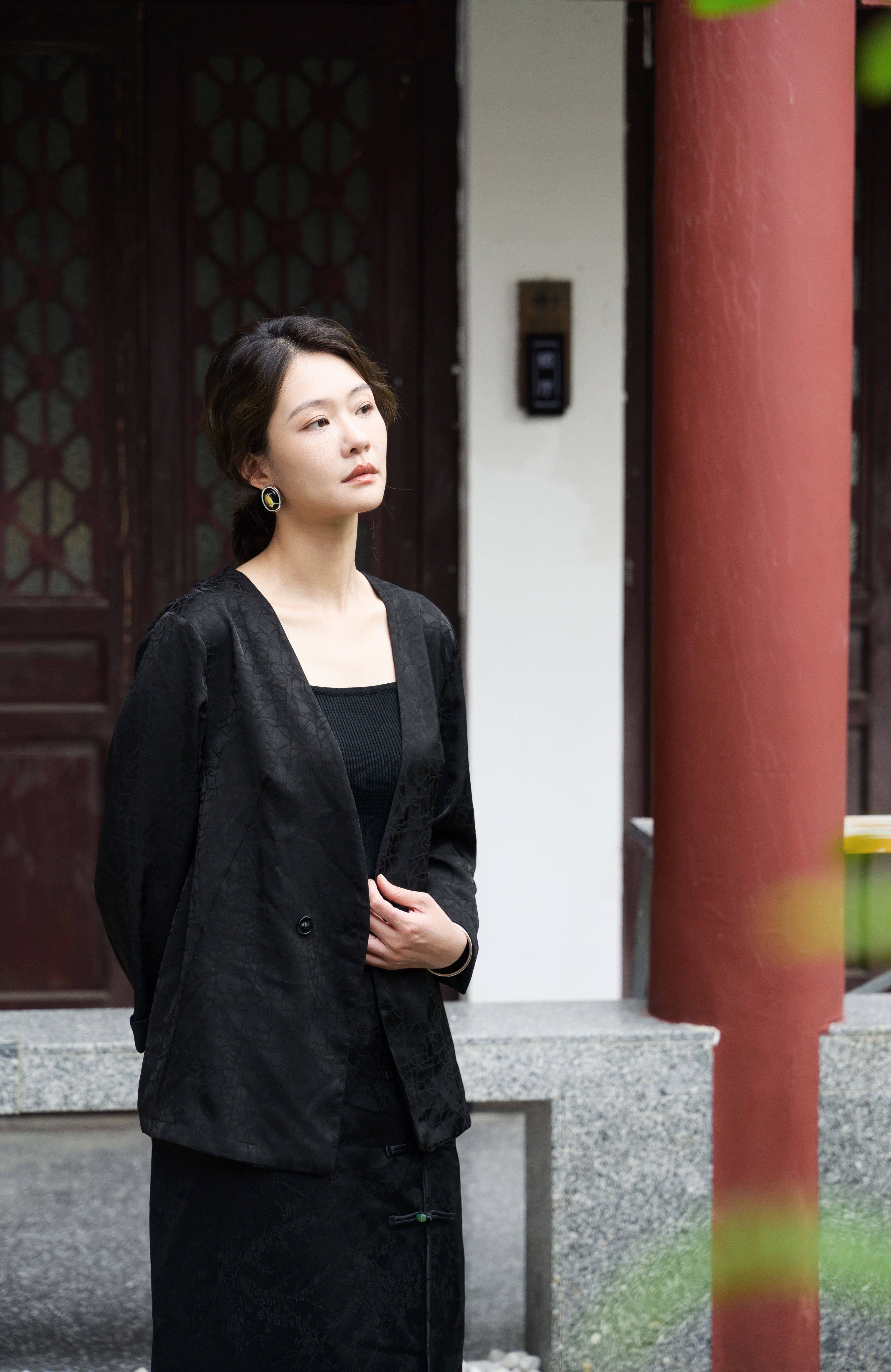 这款香云纱西装外套区别于传统西装领,巧妙改良后成大V形,即视感拉长脖颈线条。