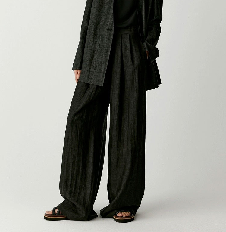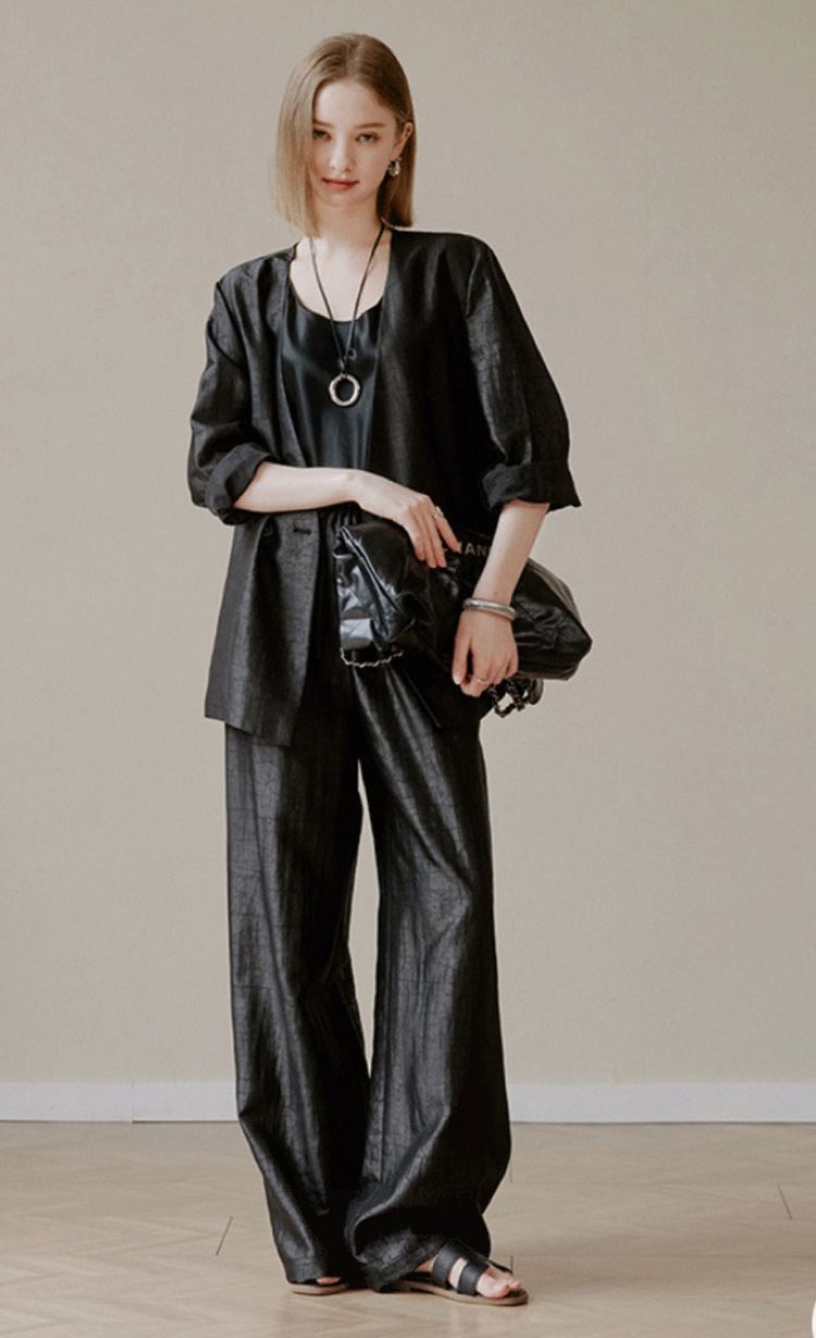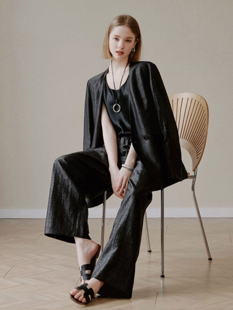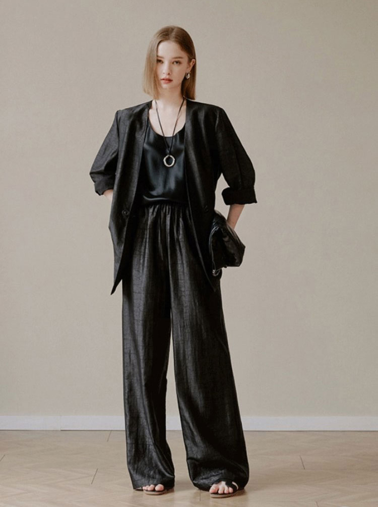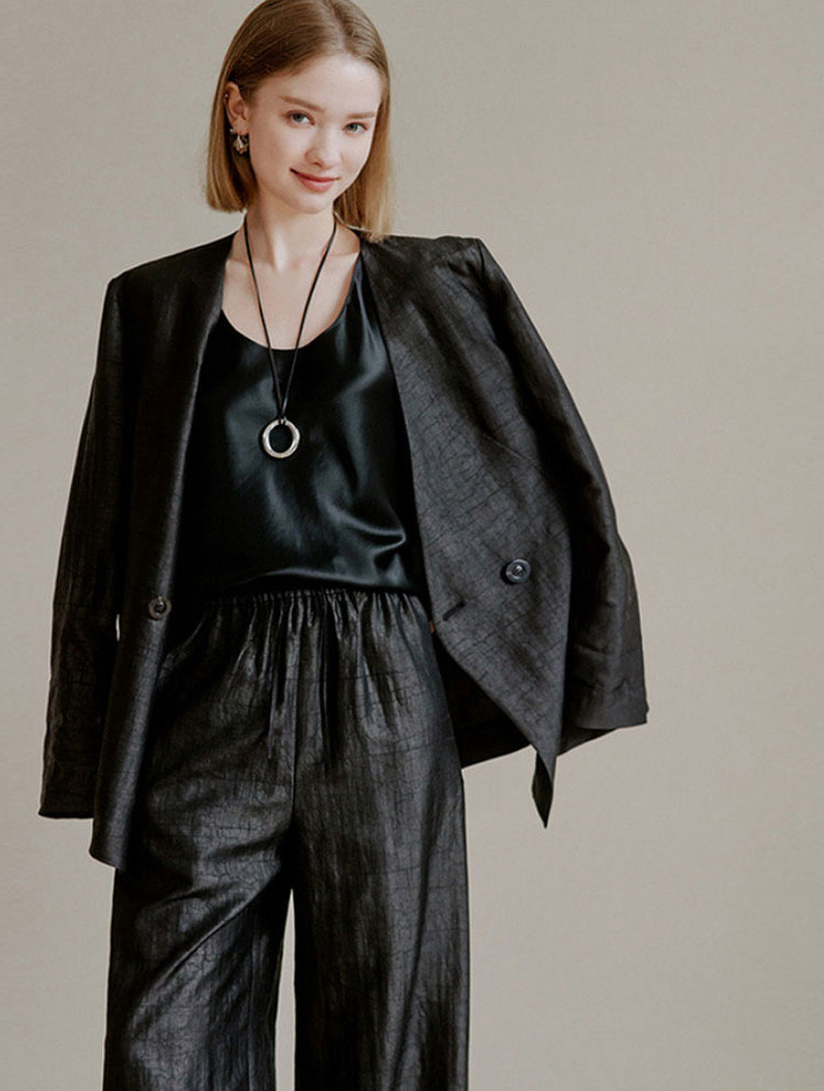 也可以和我们的龟裂纹香云西装、阔腿裤搭成一套。