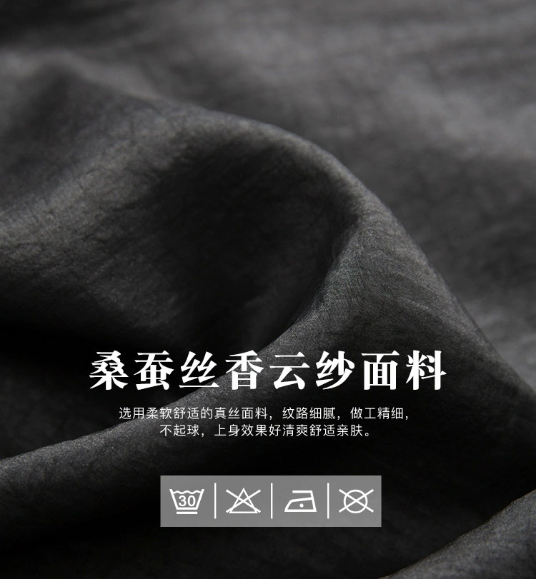 底胚布选用的是添加了42%桑蚕丝与高级醋酸纤维混纺面料,大热天穿,也能汗不沾襟,甚至出的汗都觉得凉涔涔的,尤其凉爽。