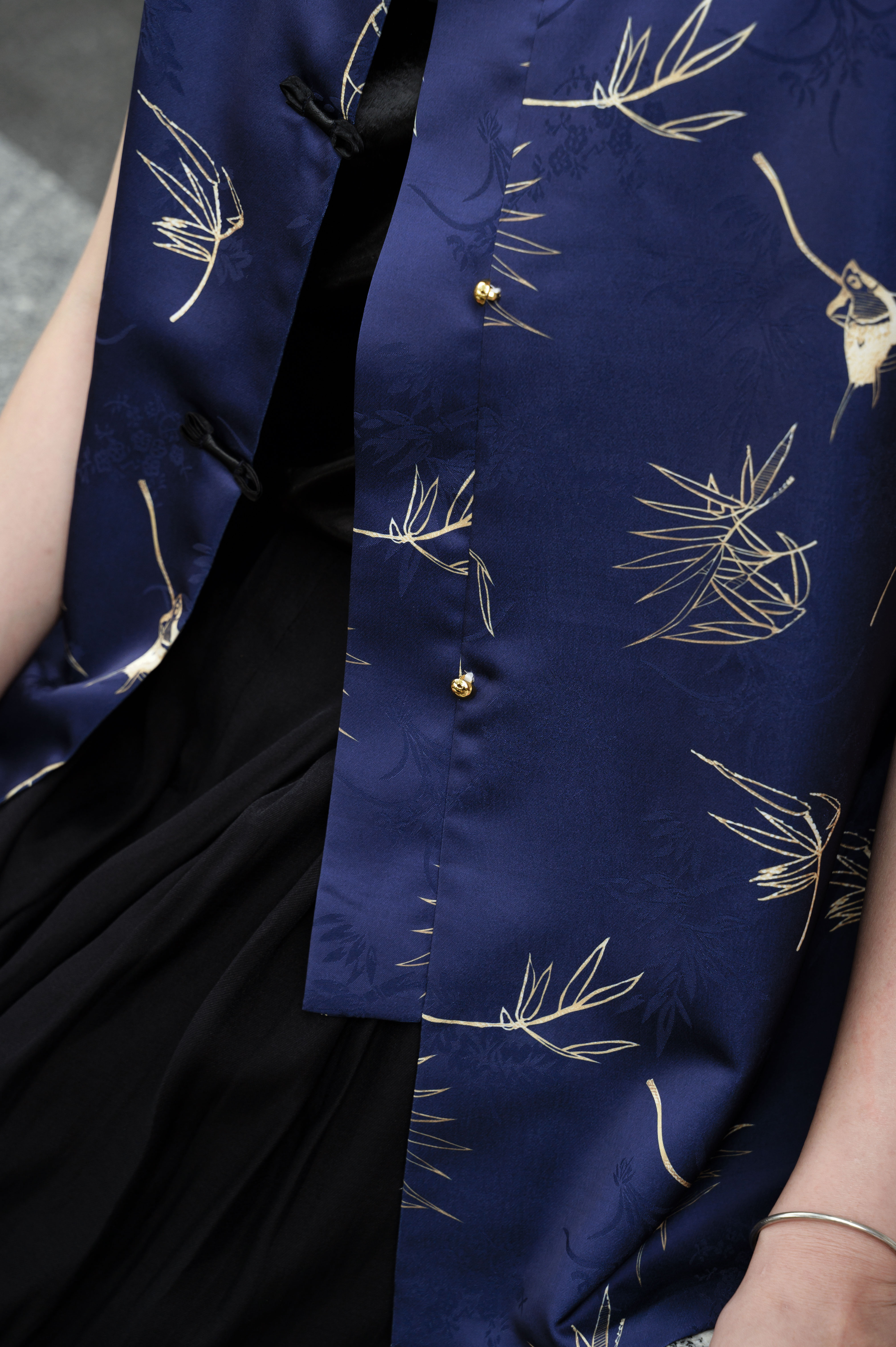 这件中式国风提花马甲,虽然不是龟裂纹香云纱底胚,但采用西阵织重磅打造的竹燕春晖图精妙绝伦,媲美秀场上的高定款。