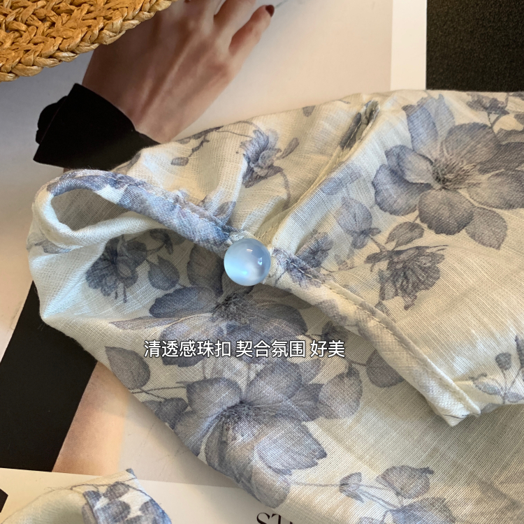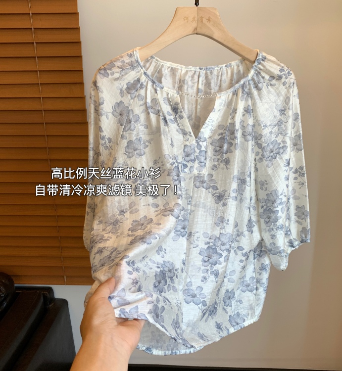 淡雅花楹篙比例天丝水滴珠链碎花小衫!#