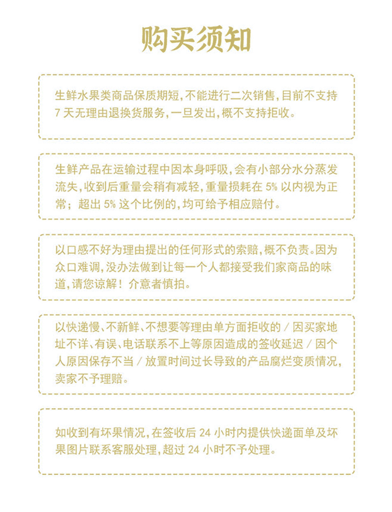 2、由于生鲜产品具有特殊性和相关规定,发货后不接受7天无理由退换。下单时请一定确认收件信息,因客户原因导致转寄、延派、误派、擅自拒收、退货等不在理赔范围