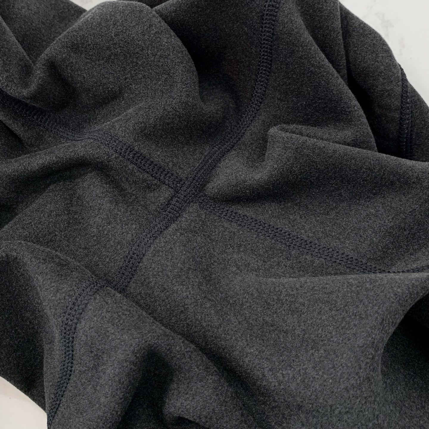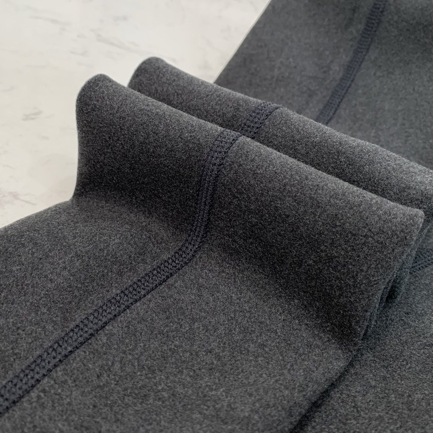 双面面料的表面看起来有着暖暖呼呼的微绒感,用手摸起来是那种丝滑软糯的触感,裤腿是单侧一片式拼接工艺设计,就一直做瑜伽裤,外贸订单的工厂是非常有经验的