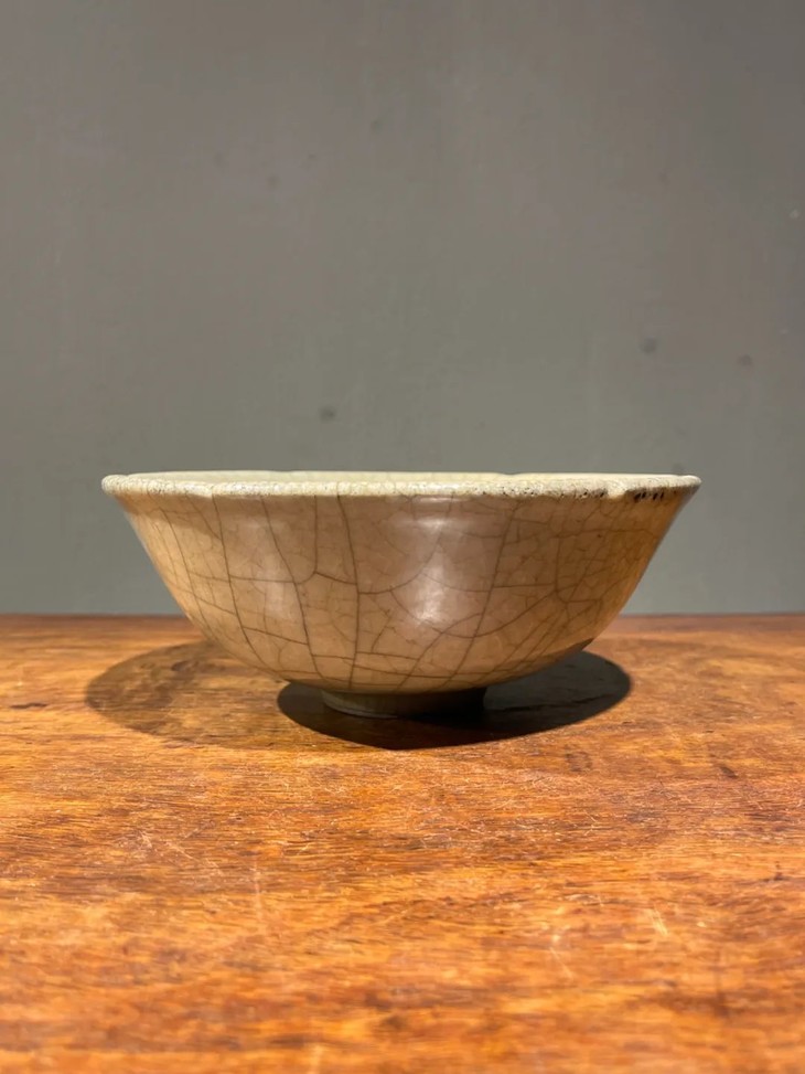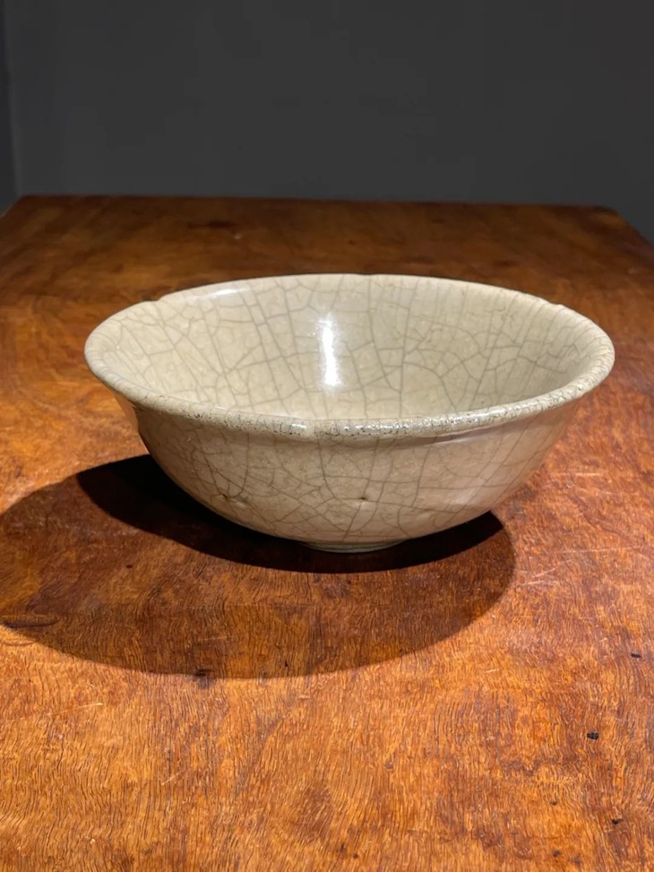 宋代五大名窑是定、汝、官、哥、钧,其中的哥窑指的是胎色深、温润如玉具深色细开片的灰青或是乳黄釉,是南宋宫廷御用瓷器,制作精致的南宋哥窑釉也是历代各地窑场争相仿制的品类。此黑胎哥窑灰青釉葵口碗,外撇葵口深腹碗,造型优雅细腻,灰青色釉质温润如玉,釉面具深黑色与无色细网状开片,除圈足无釉露黑色胎体外满釉覆盖全器,撇口葵花式造型精緻细腻,釉色温润、双层开片流畅自然,整体风格简约贵气。此黑胎哥窑灰青釉葵口碗,应是仿古陶瓷佳作,当时此类仿宋代名瓷制作严谨,造型依循古器,釉色仿真极其到位,是当时古玩陶瓷作坊以窑址出土之真品销售的高仿宋瓷,颇多欧美与日本藏家购买此类仿古宋瓷后,仍然自认为是真品珍藏至今。如此艳丽优雅的仿古黑胎哥窑灰青釉葵口碗,不但是精美的案头摆设与实用的瓷盘外,也是高贵典雅,肯定是让宾客印象深刻之精美陶瓷藏品。此仿宋黑胎哥窑灰青釉葵口碗,制作严谨品质精良,气质优雅,应是仿宋官窑的佳器。如今摆放茶席当摆设或实用为茶碗/盛水器,可感受宋代帝王器具的独特气质。此黑胎哥窑灰青釉葵口碗,保存完好无损。尺寸:碗:高度:7厘米;直径:17.8厘米;底部直径:5厘米;重量:584.1克