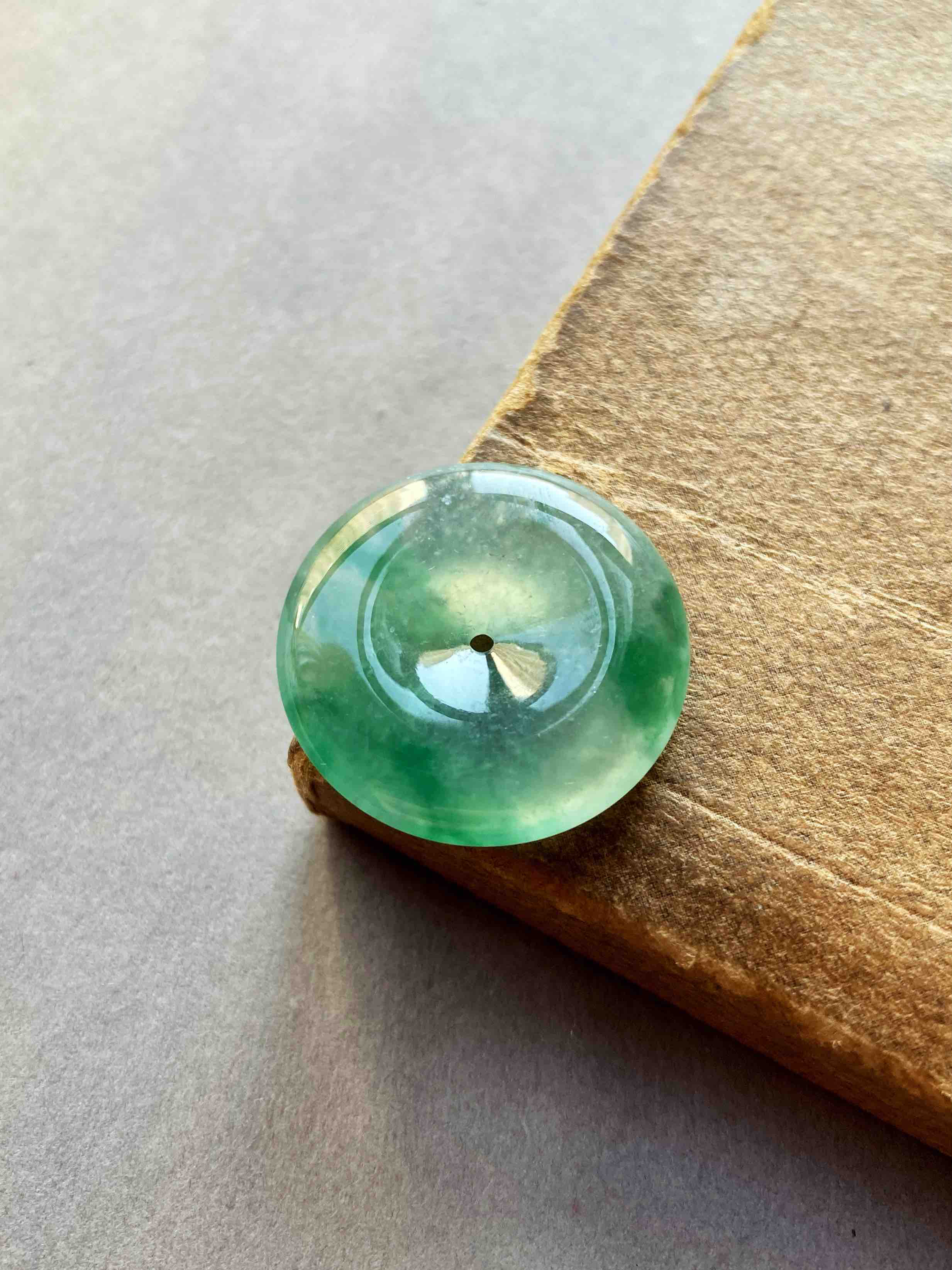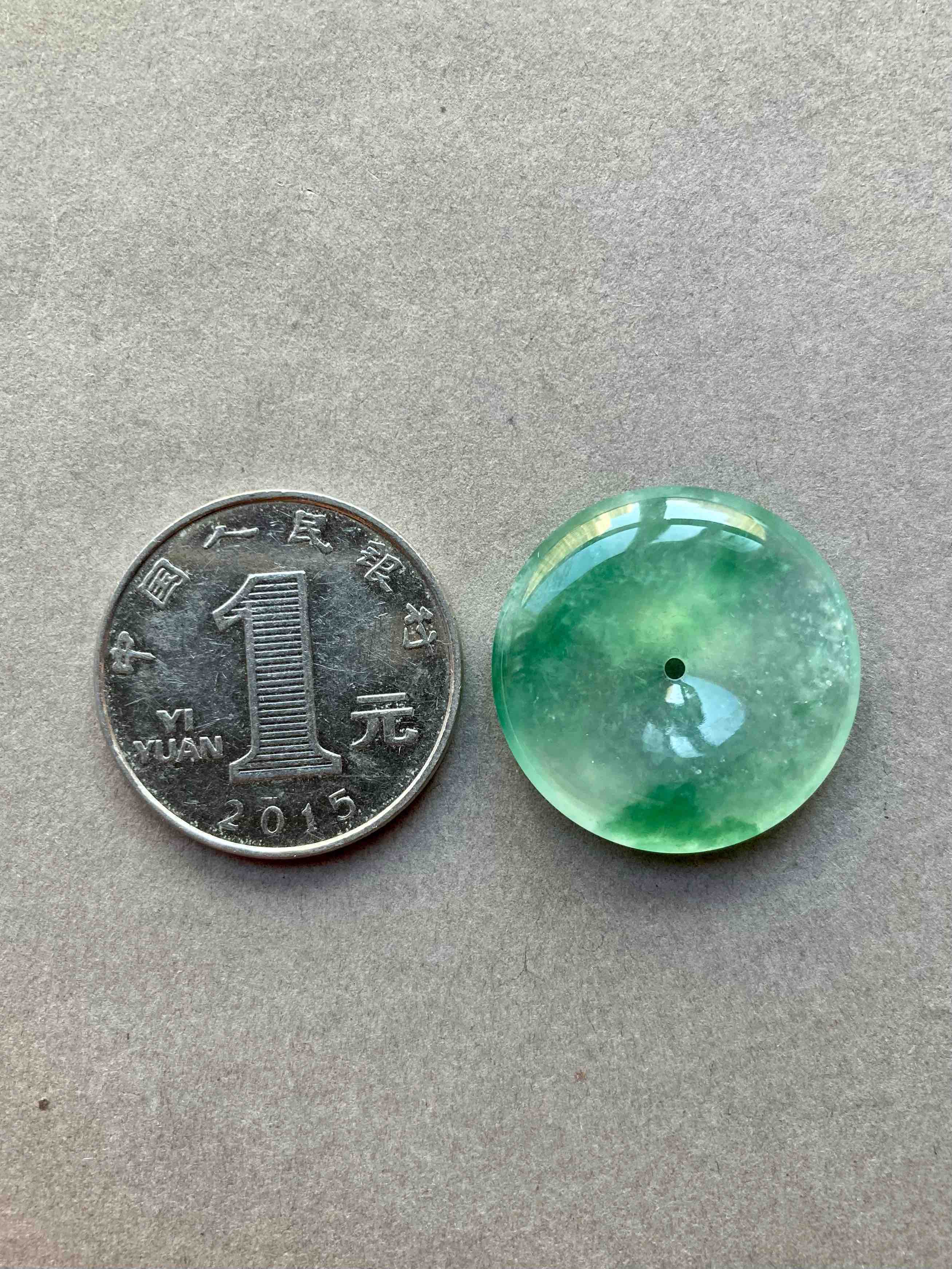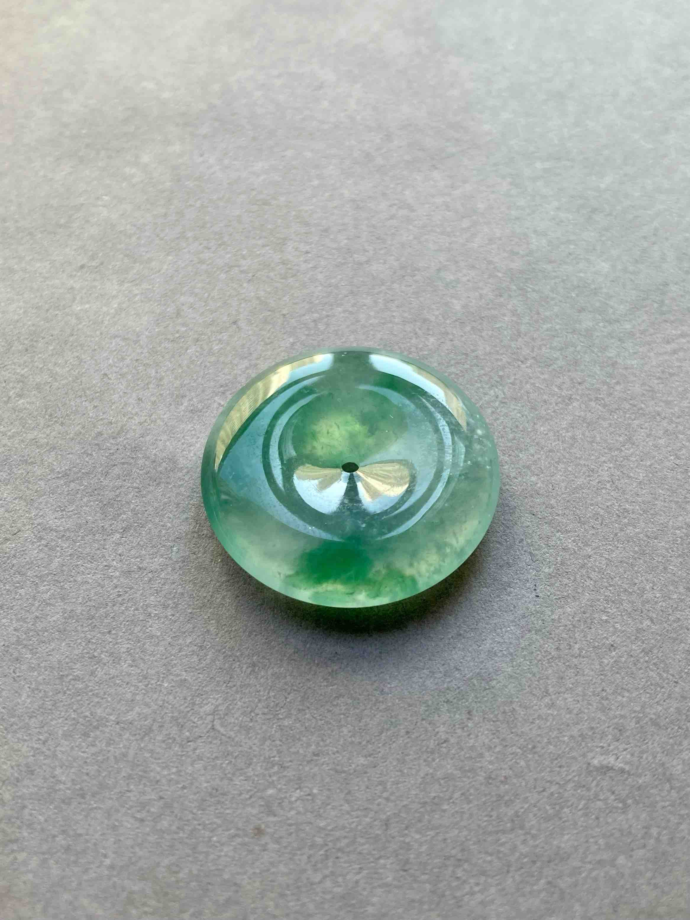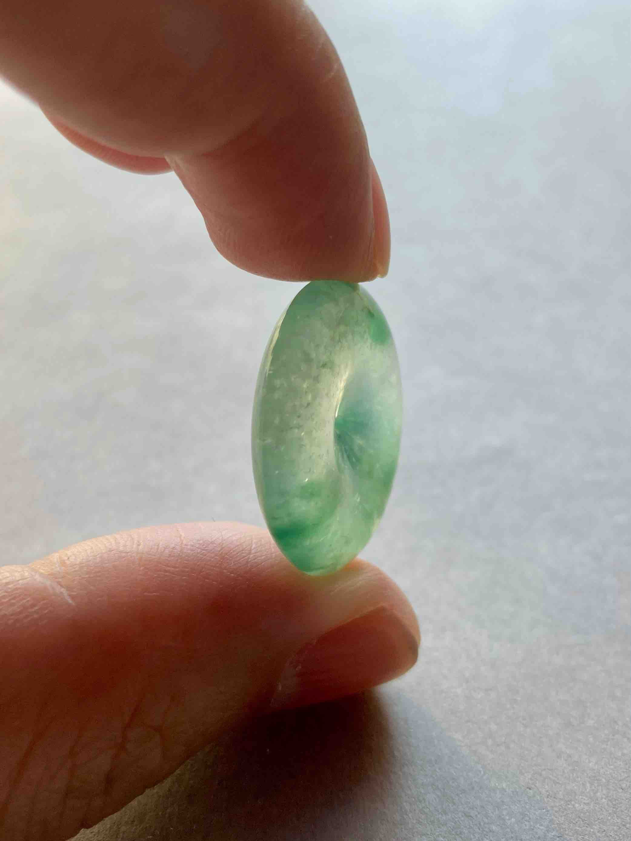 人见人爱平安扣,翡翠里越简单的东西越高级,越难做,对料的品质要求高,全光面无雕刻的东西要有这么好的亮度可比雕刻件难多了,高冰种飘绿花翡翠平安扣,种水晶莹剔透,荧光四射,绿花漂亮,厚实饱满非常难得,