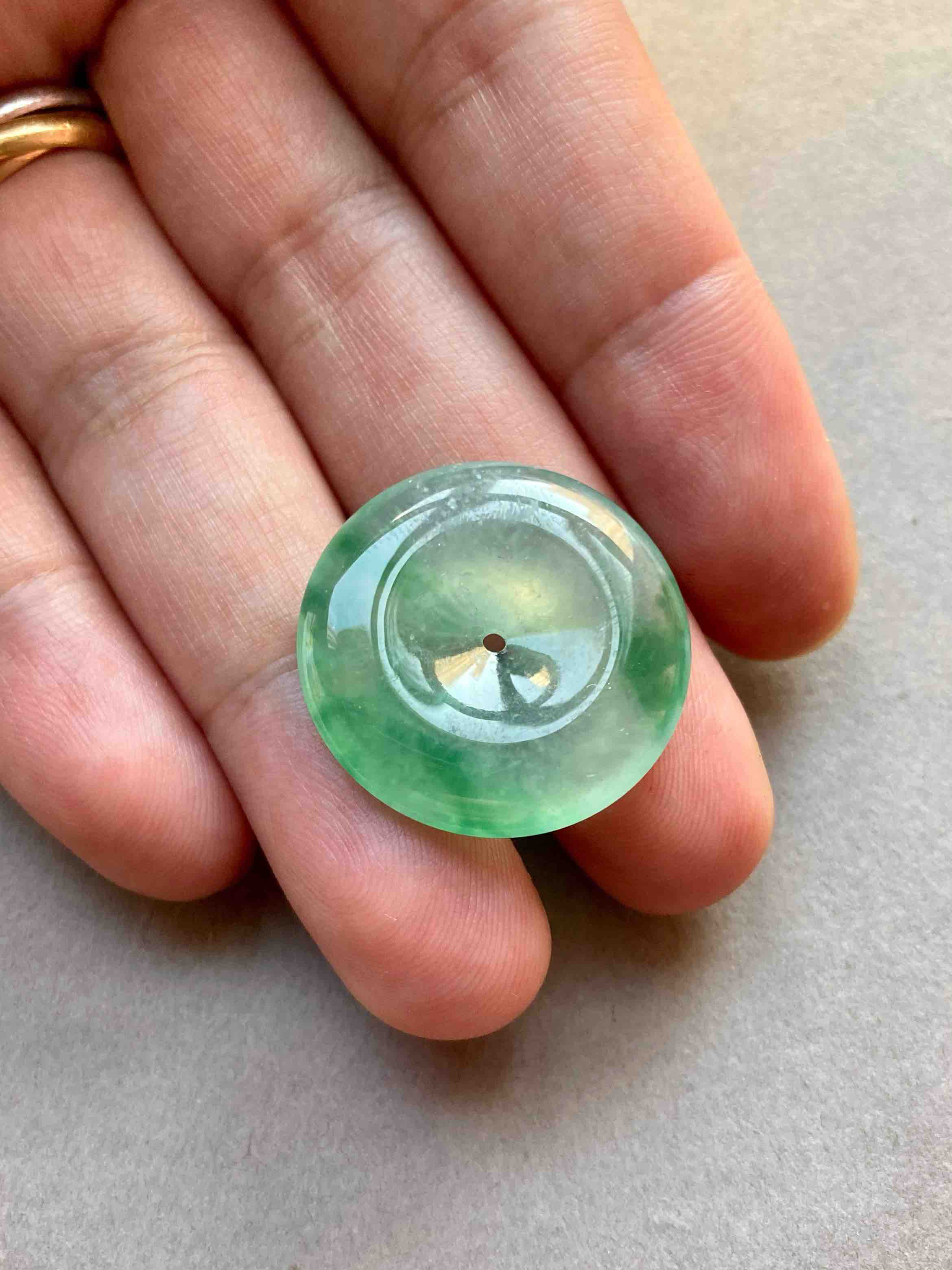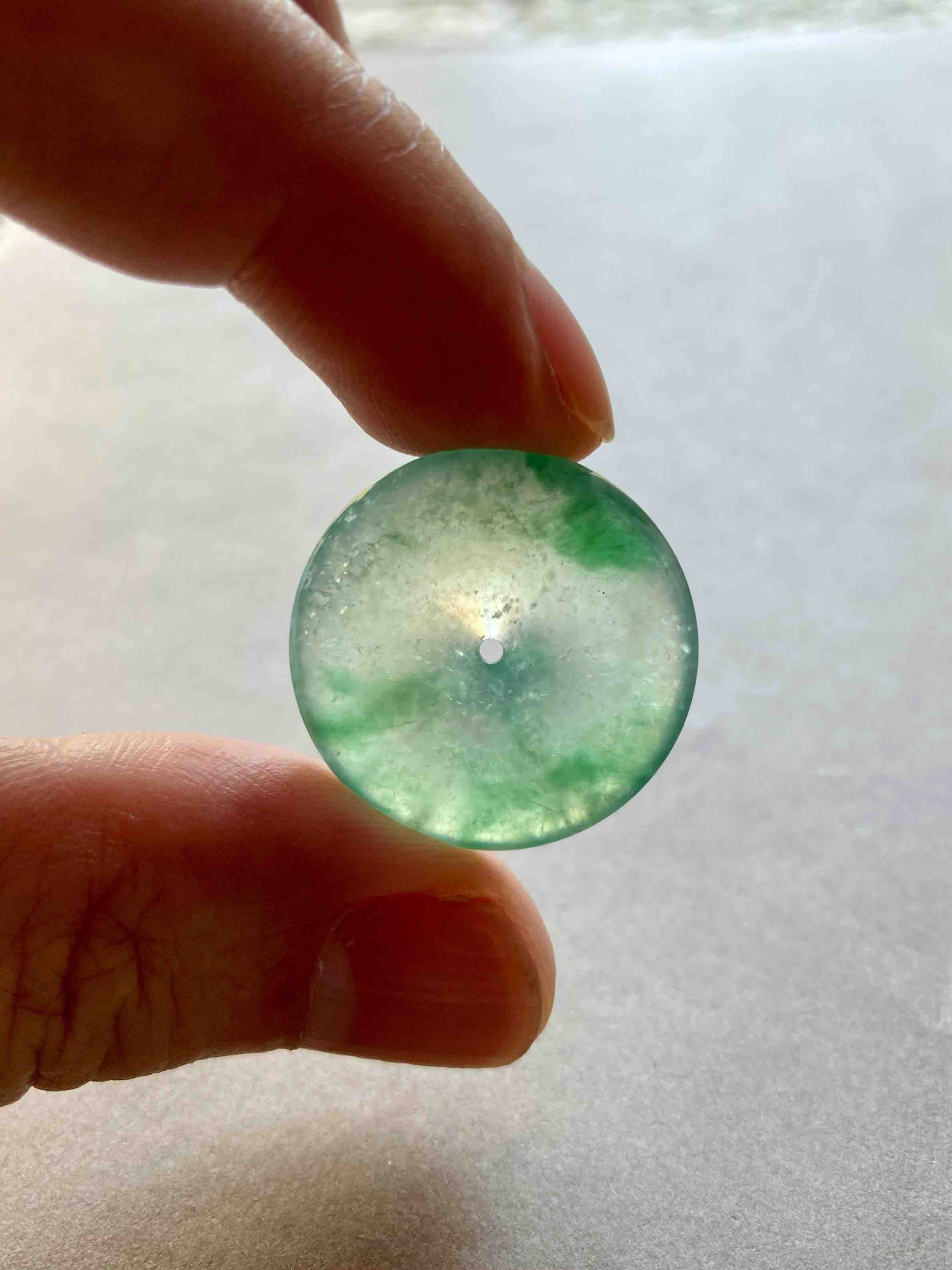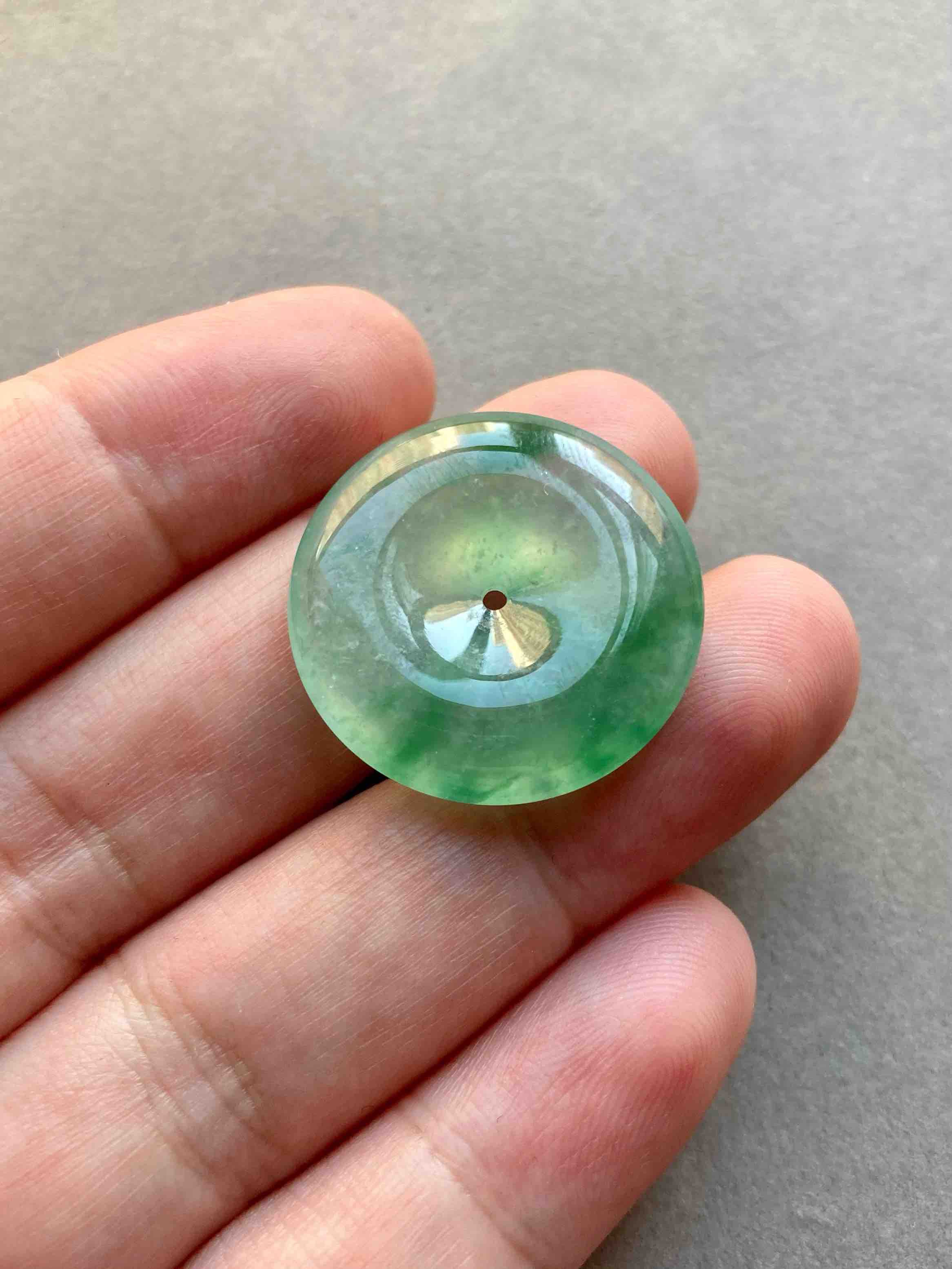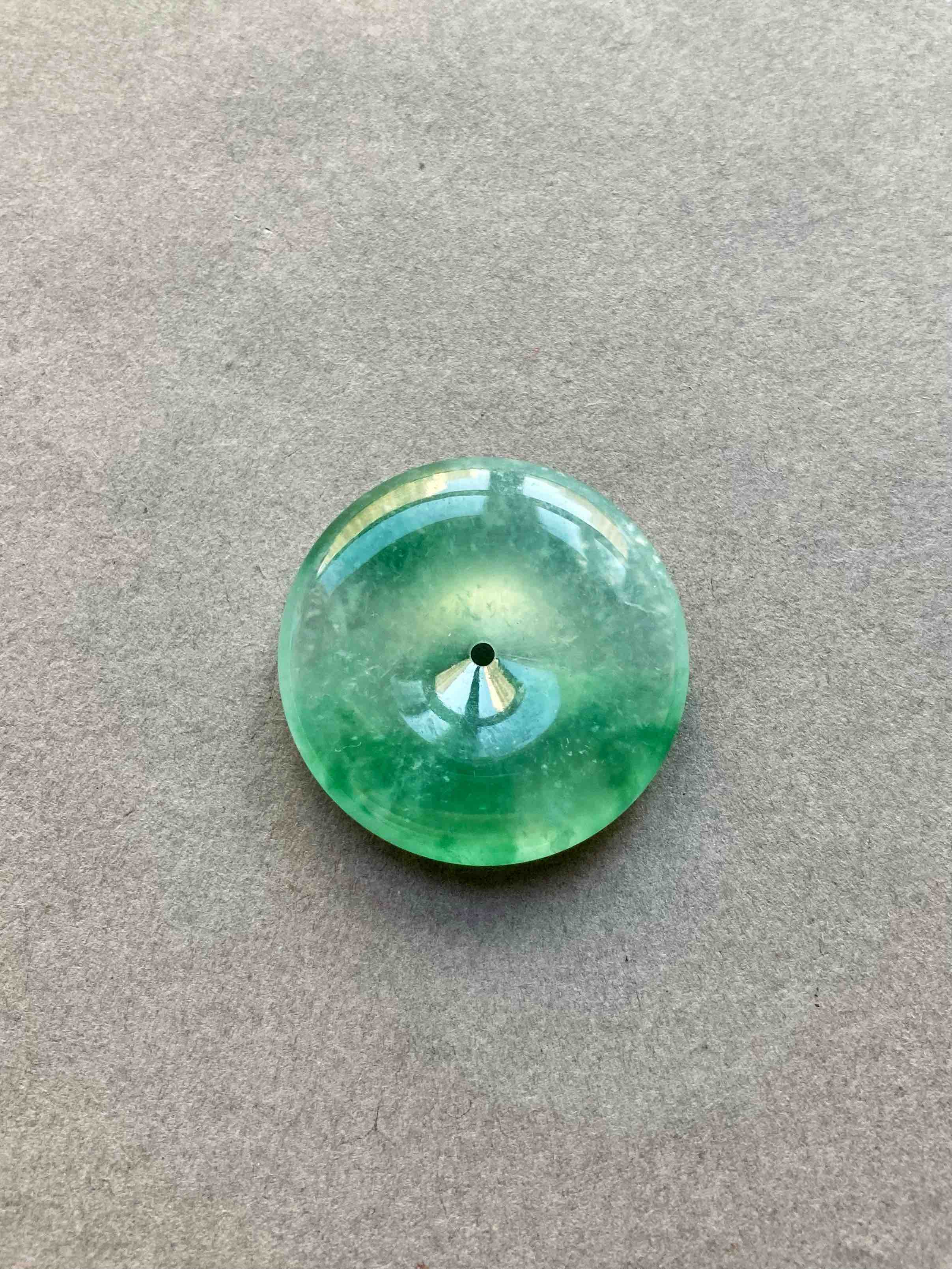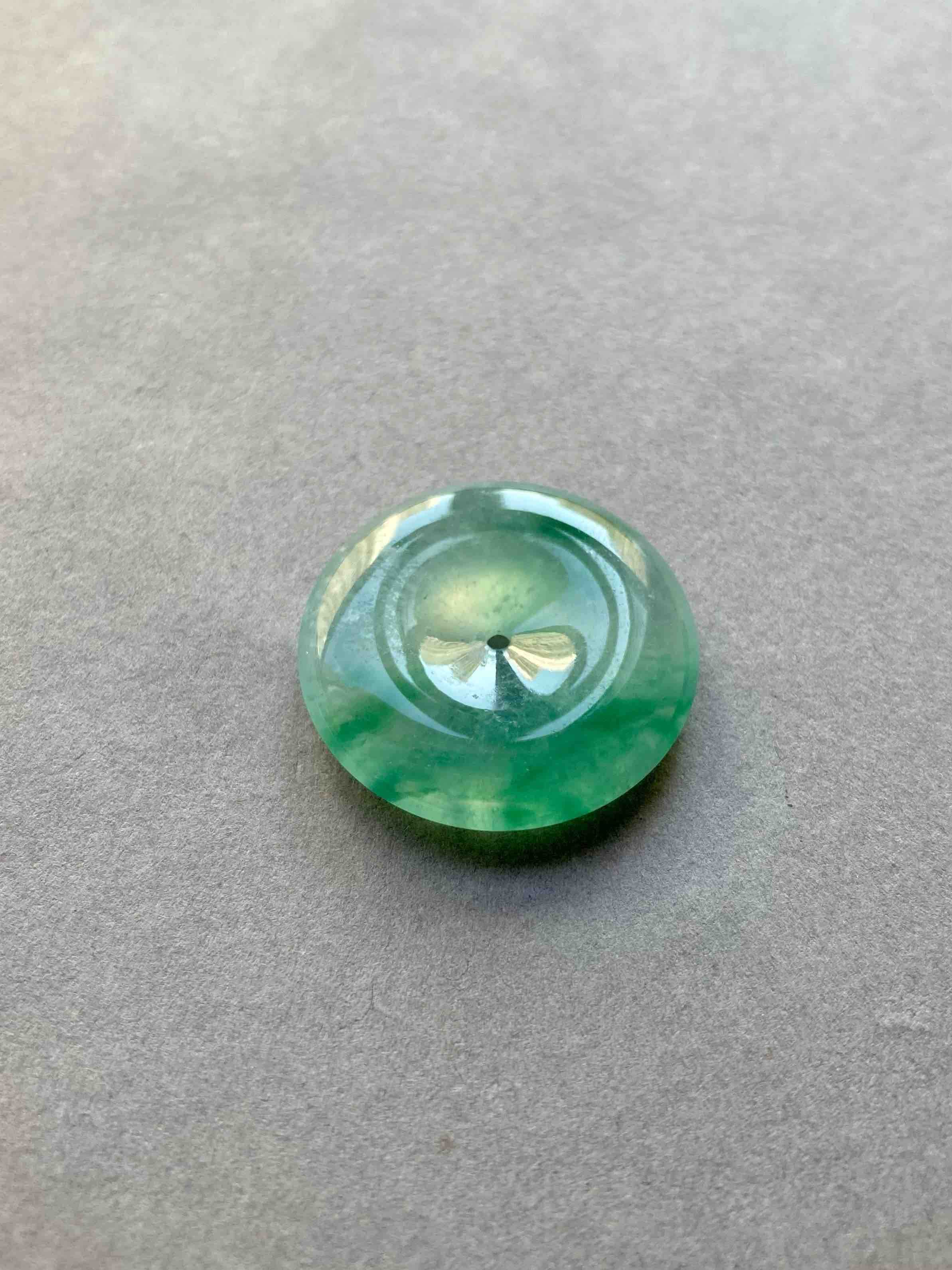 人见人爱平安扣,翡翠里越简单的东西越高级,越难做,对料的品质要求高,全光面无雕刻的东西要有这么好的亮度可比雕刻件难多了,高冰种飘绿花翡翠平安扣,种水晶莹剔透,荧光四射,绿花漂亮,厚实饱满非常难得,